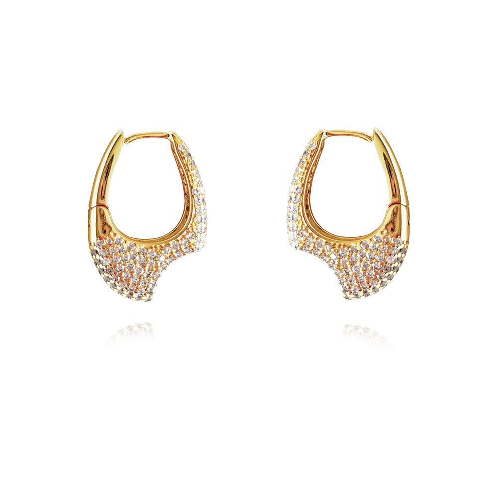 Crafted from ethical sterling silver (S925) and finished with 18ct gold plating, each earring is pavé-set with fine diamantes that catch the light with understated brilliance. The sculpted shard-edge effect creates subtle variation along the surface, giving the piece a hand-worked, almost architectural quality rather than a perfectly uniform finish.