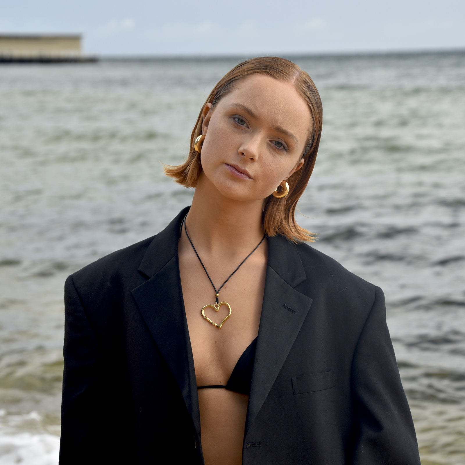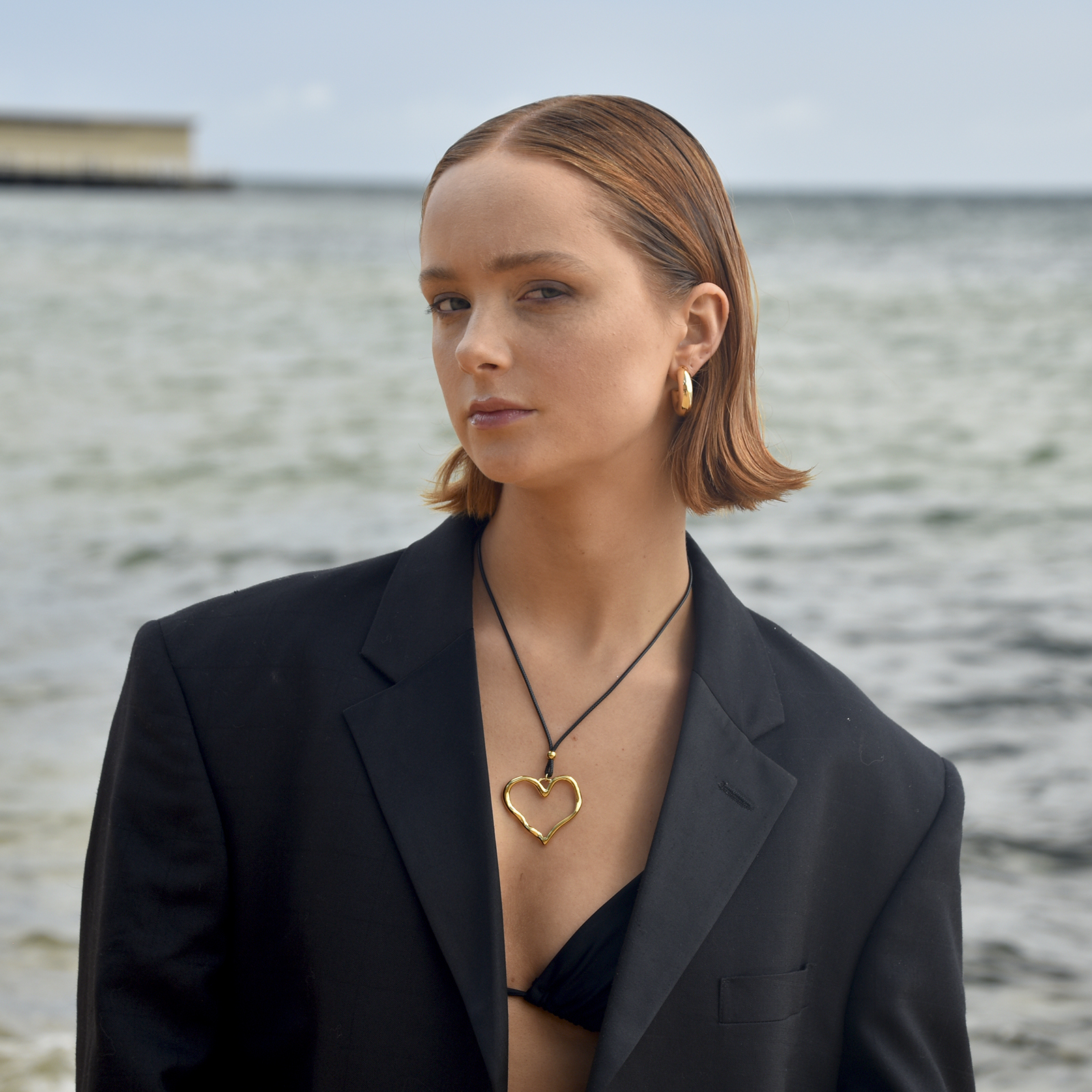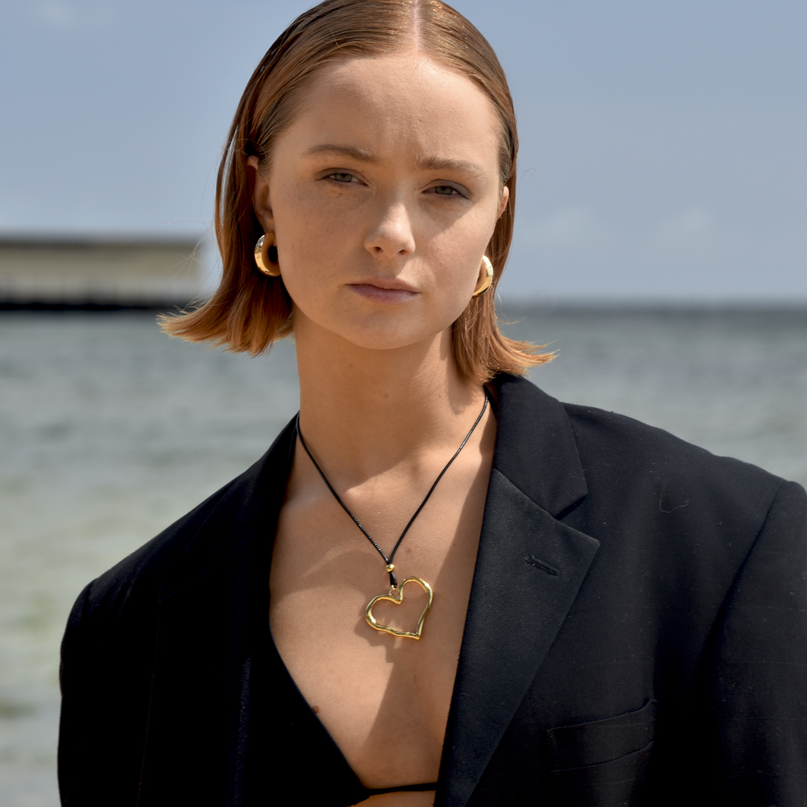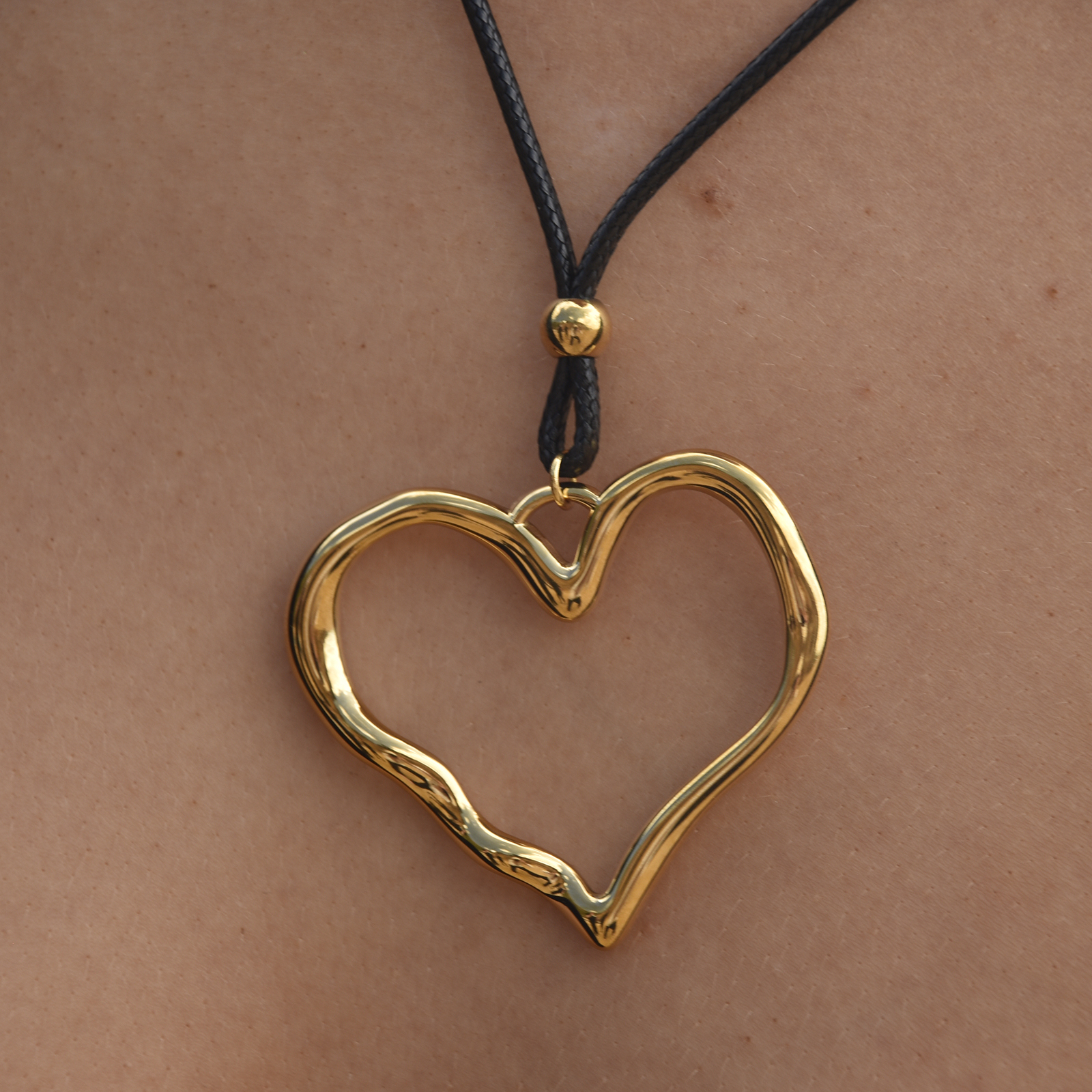 A statement that doesn’t compete. It just is. Introducing Mason Sculptured Heart Pendant Necklace (Gold) - a contemporary art inspired pendant piece for the modernists. This design features a sculptured outline big heart pendant attached to black tieback strings. Tie the strings at the length you desire. The heart pendant is made in environmental friendly stainless steel with 18ct gold plating. Wearing on its own or layering, it just can’t be missed. Available in gold or silver.