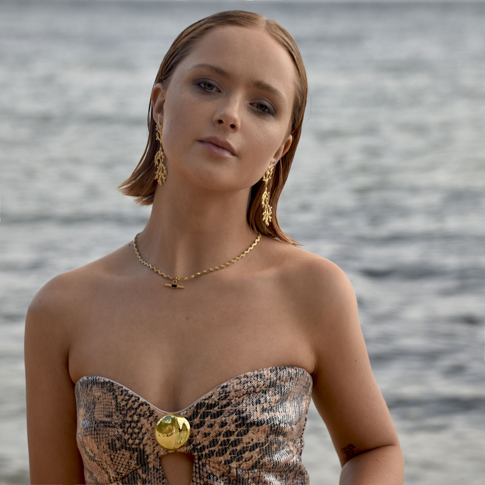 This necklace is 47cm long. Please kindly note that the position of the necklace sitting on your neck can vary from individual to individual depending on your top size. Model is a size 8.