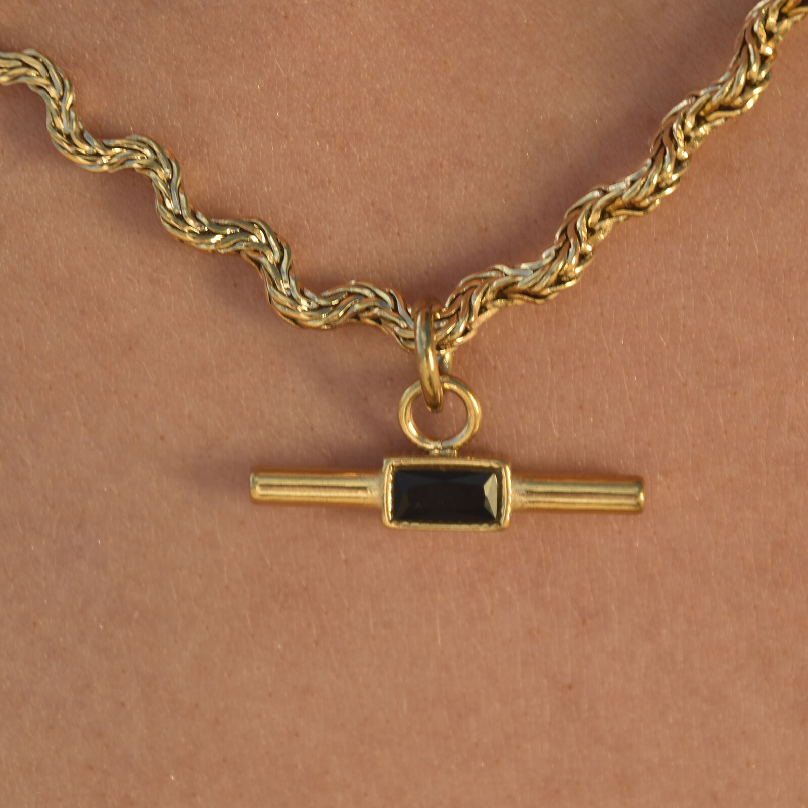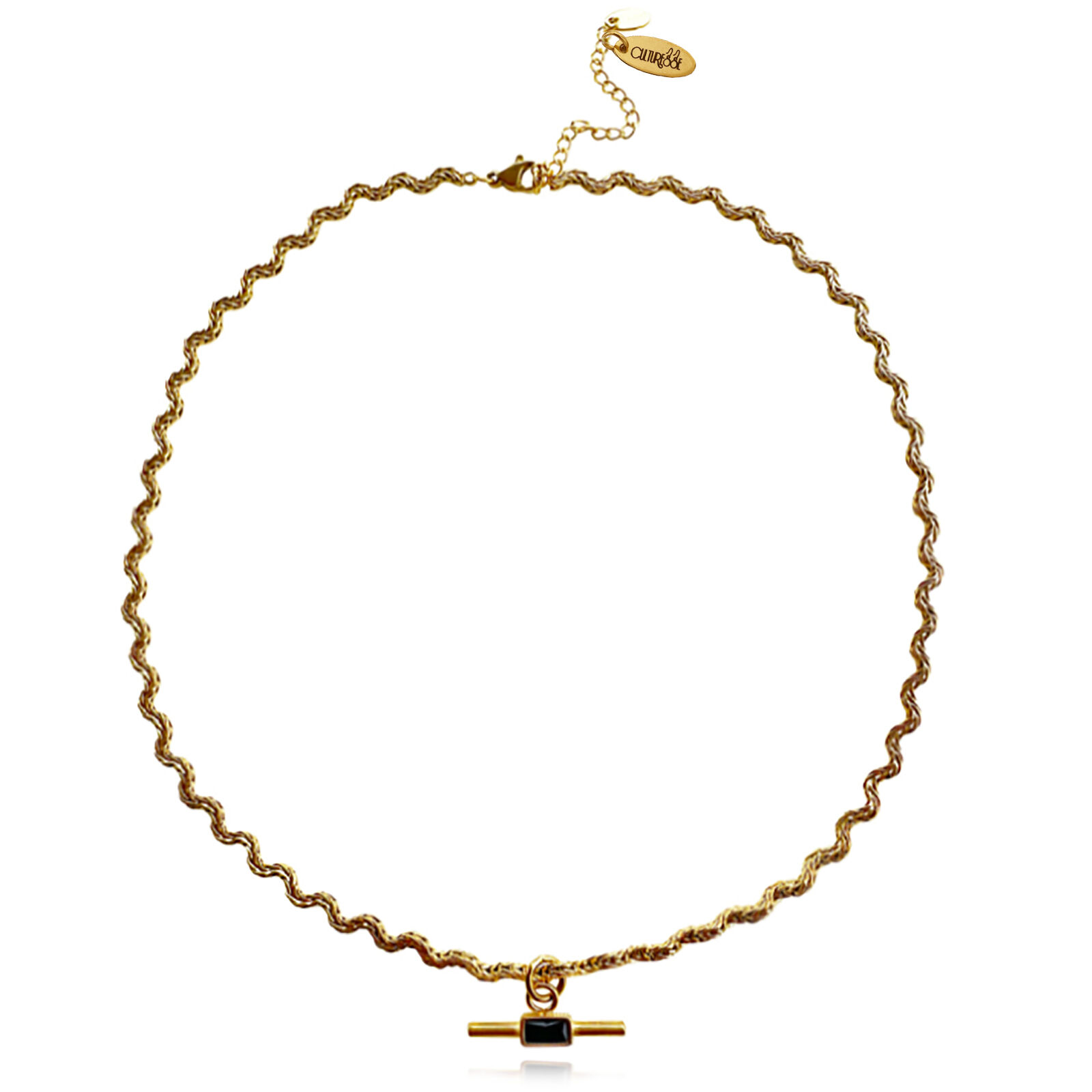 Let the waves carry you where the light cannot. Introducing Merida Wavy Chain Necklace (Black Stone) - a modern and chic neckpiece for those who have an eye for the unique. This design features a wavy-set gold chain complimented by a bar pendant with a black stone. This necklace is made in environmentally friendly stainless steel with 18ct gold plating - versatile for modern styling and necklace layering. Available in green stone pendant or black stone pendant.