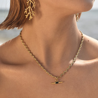 Let the waves carry you where the light cannot. Introducing Merida Wavy Chain Necklace (Black Stone) - a modern and chic neckpiece for those who have an eye for the unique. This design features a wavy-set gold chain complimented by a bar pendant with a black stone. This necklace is made in environmentally friendly stainless steel with 18ct gold plating - versatile for modern styling and necklace layering. Available in green stone pendant or black stone pendant.
