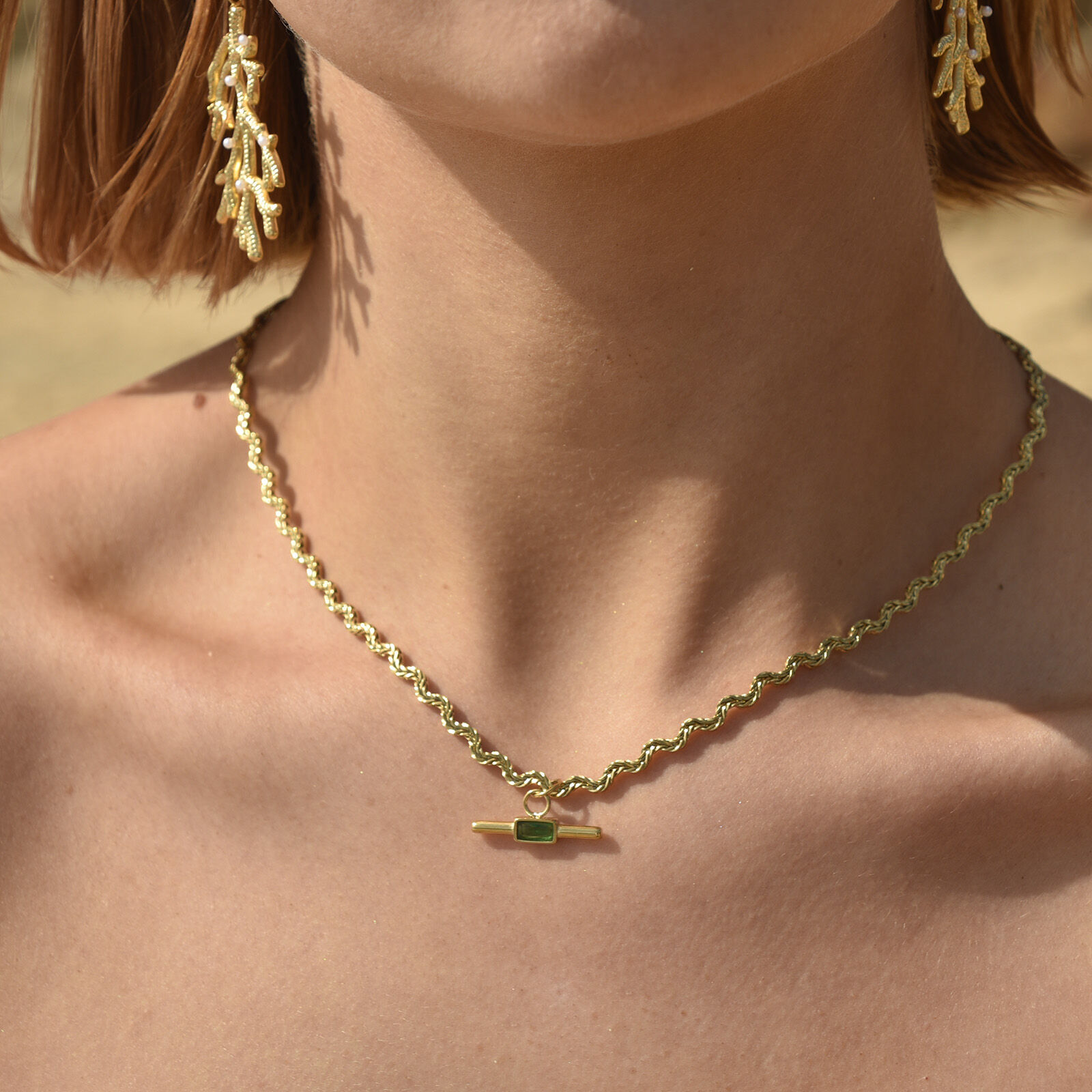 Let the waves carry you where the light cannot. Introducing Merida Wavy Chain Necklace (Green Stone) - a modern and chic neckpiece for those who have an eye for the unique. This design features a wavy-set gold chain complimented by a bar pendant with a green stone. This necklace is made in environmentally friendly stainless steel with 18ct gold plating - versatile for modern styling and necklace layering. Available in green stone pendant or black stone pendant.
