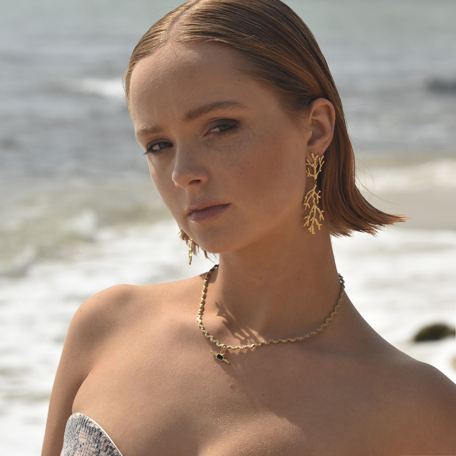 This necklace is 47cm long. Please kindly note that the position of the necklace sitting on your neck can vary from individual to individual depending on your top size. Model is a size 8.