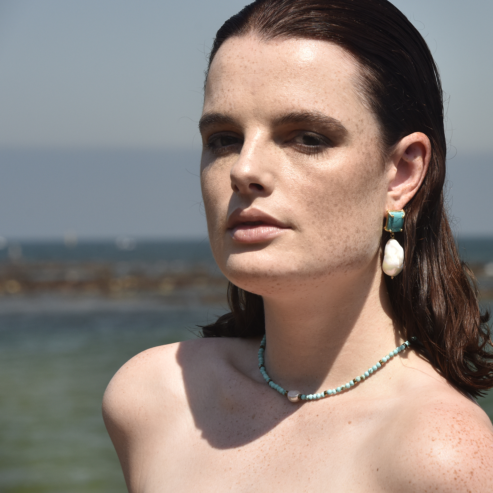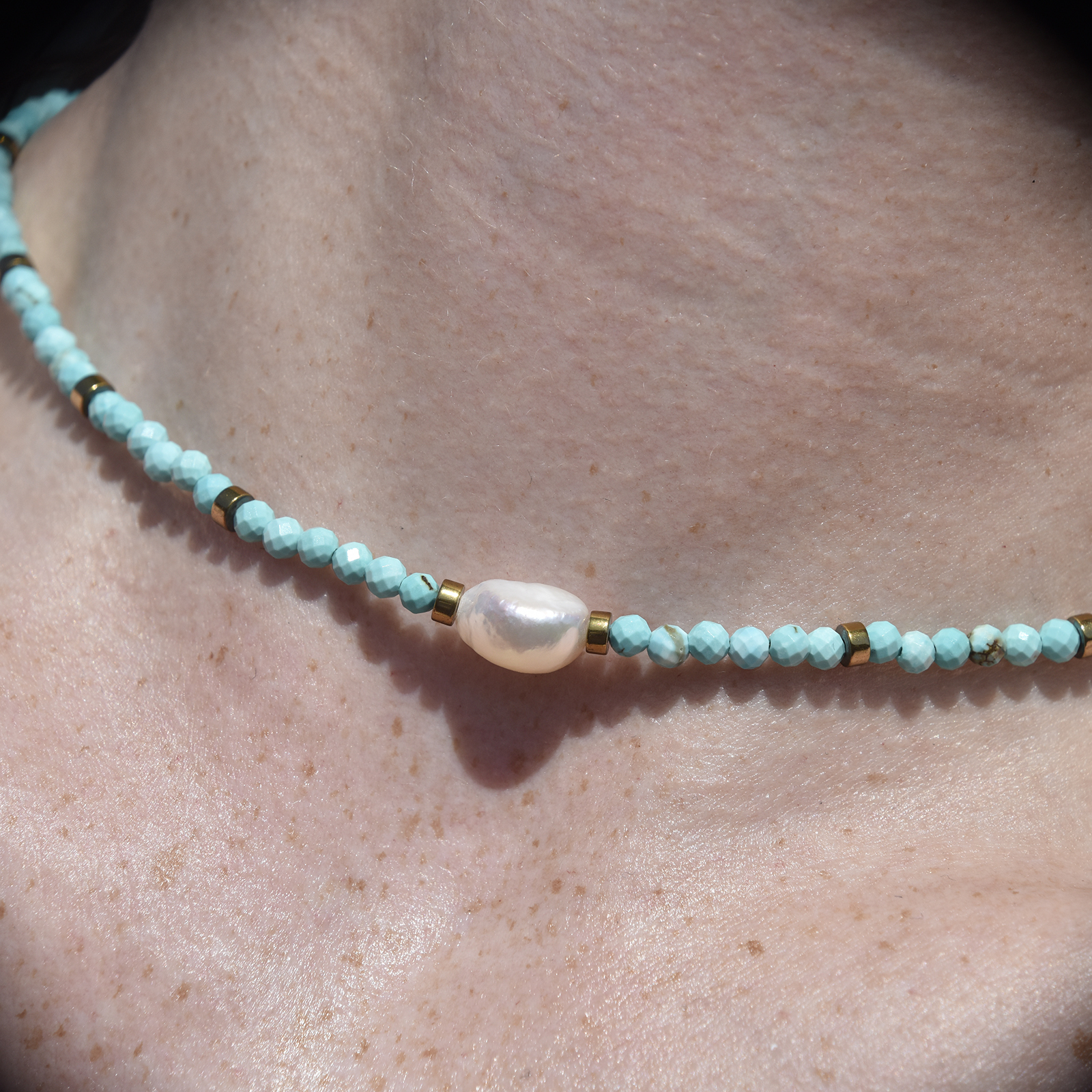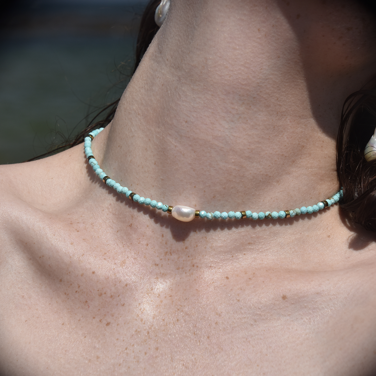 Coastal chicness with a vibrant blue to lighten your presence. Introducing Micki Facet Turquoise Pearl Pendant Necklace / Choker - a bohemian style neck love for coastal and spiritual-loving muses. This design features clusters of multi-faceted natural turquoise stones separated by gold beads and adored with a natural freshwater pearl pendant. The gold beads and the magnetic clasp are made in environmentally friendly brass with 18K gold plating. Perfect for modern, coastal, beach, bohemian, summer, chic, necklace layering, smart casual, casual styles and more.