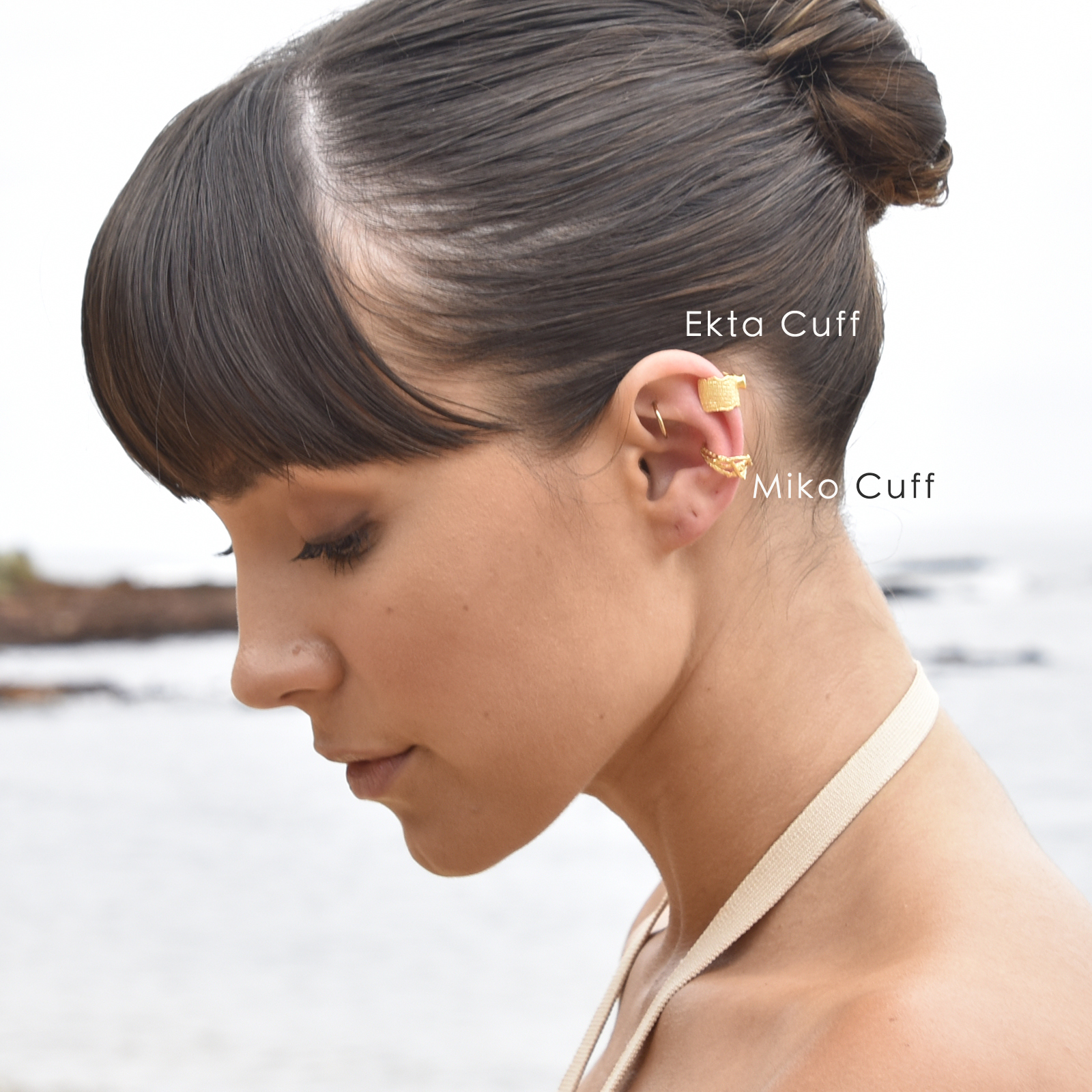 Artsy, unique with a creative inner layering. Introducing Miko Ear Contour Textured Sculpture Cuff Earring (Single Piece) - a creative and stylish ear cuff inspired by coastal rock formation and textures. This design features single piece cuff earring with crossing lines interwoven in the middle. This ear piece is crafted in solid sterling silver with 2.5 microns of 18K gold plating (to Gold Vermeil Jewellery Standard) for hypoallergenic and enduring wear.