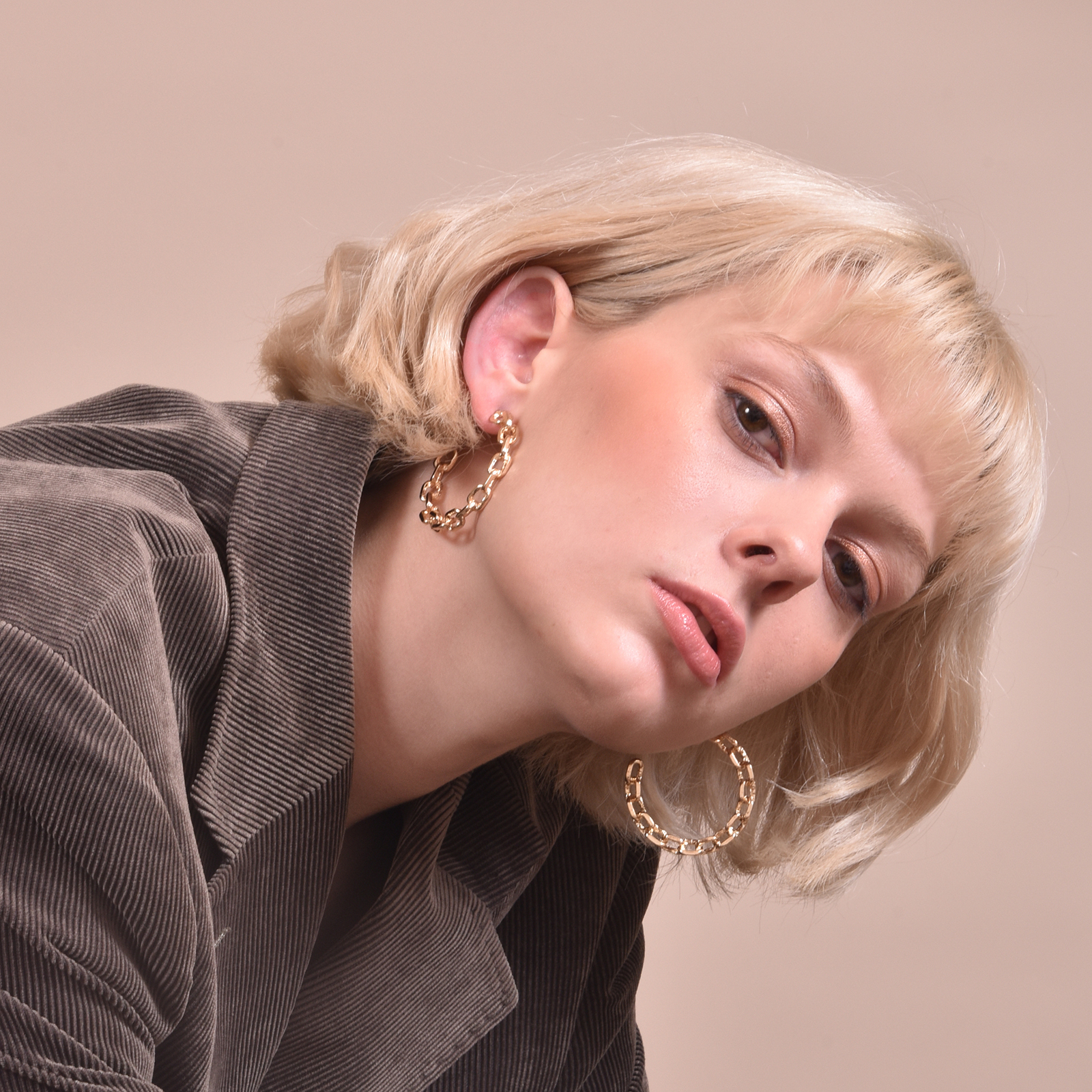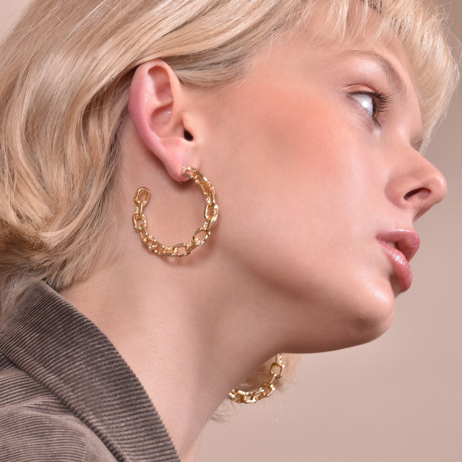 Modern, eddy and outspoken, introducing Milan Chained Love Earrings - an on-trend hoop statement that is unique and 'attitudy'. This contemporary design blends latest chain style with statement hoop, bringing a high fashion styling vibe to traditional gold hoop earrings. The earrings are crafted in environmentally friendly brass (nickel free) with 14K yellow gold plating, making it an affordable and eye-catching 'style-lift' for fashion lovers of all ages. Perfect for modern, edgy, punk, chic, suit/blazer, street, smart casual and more.