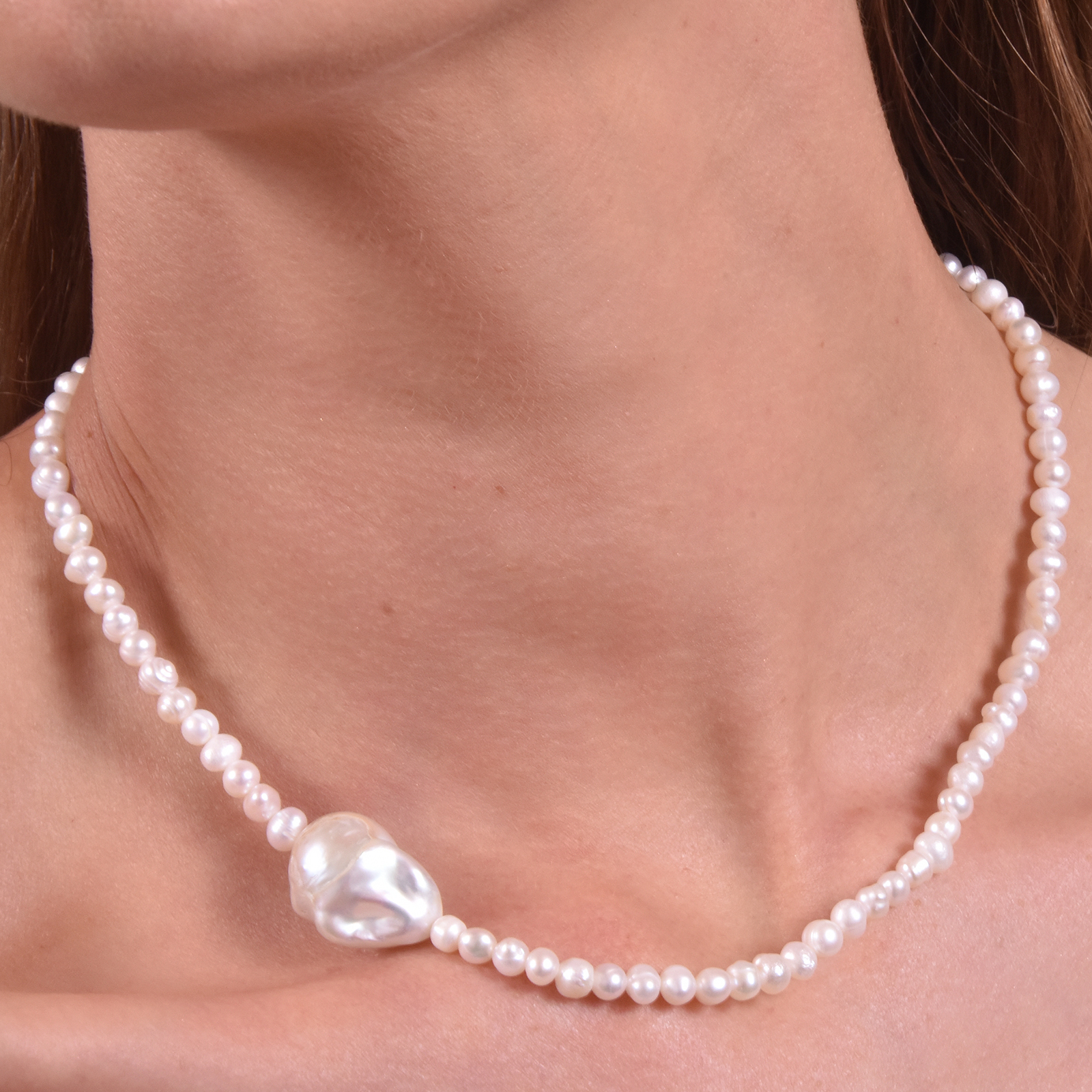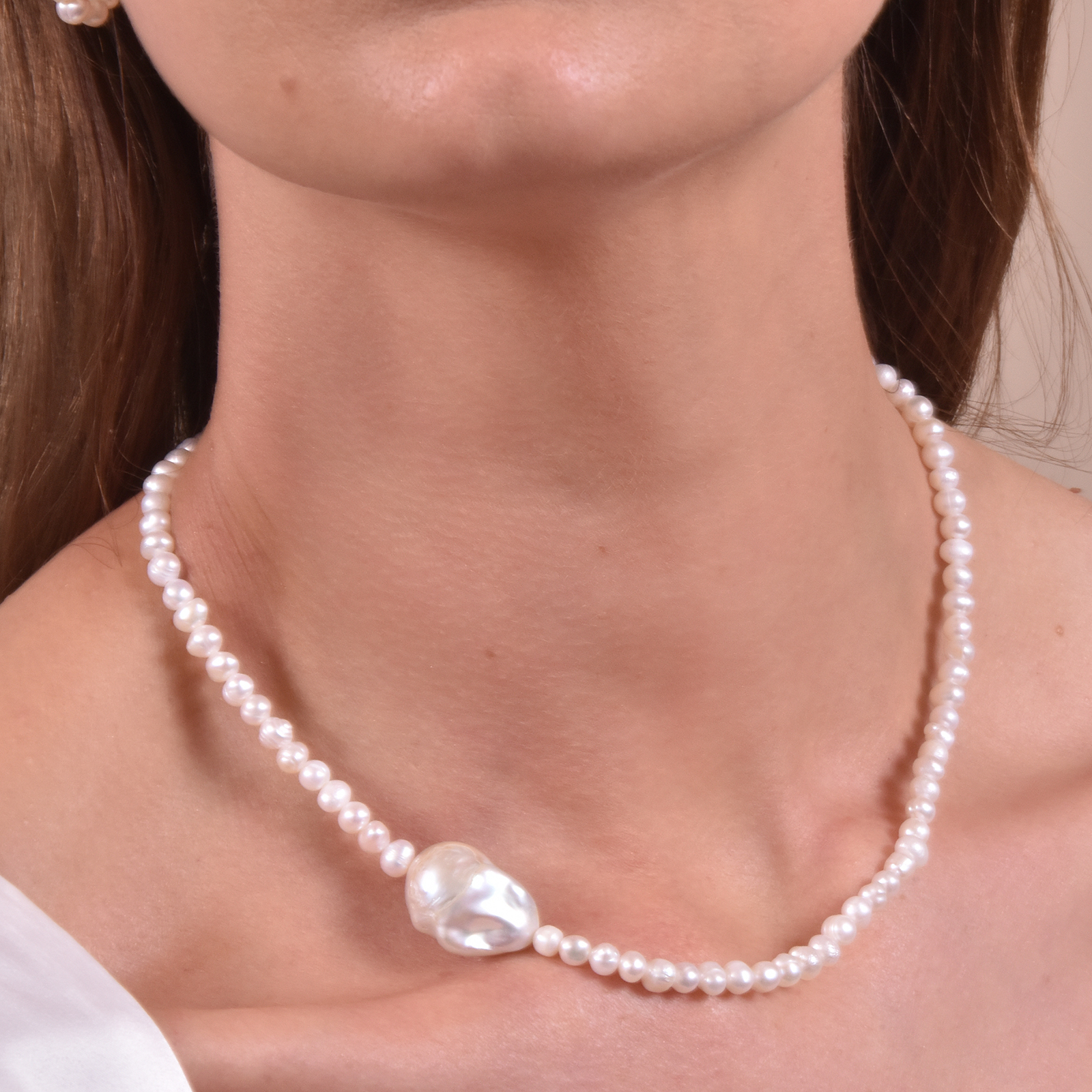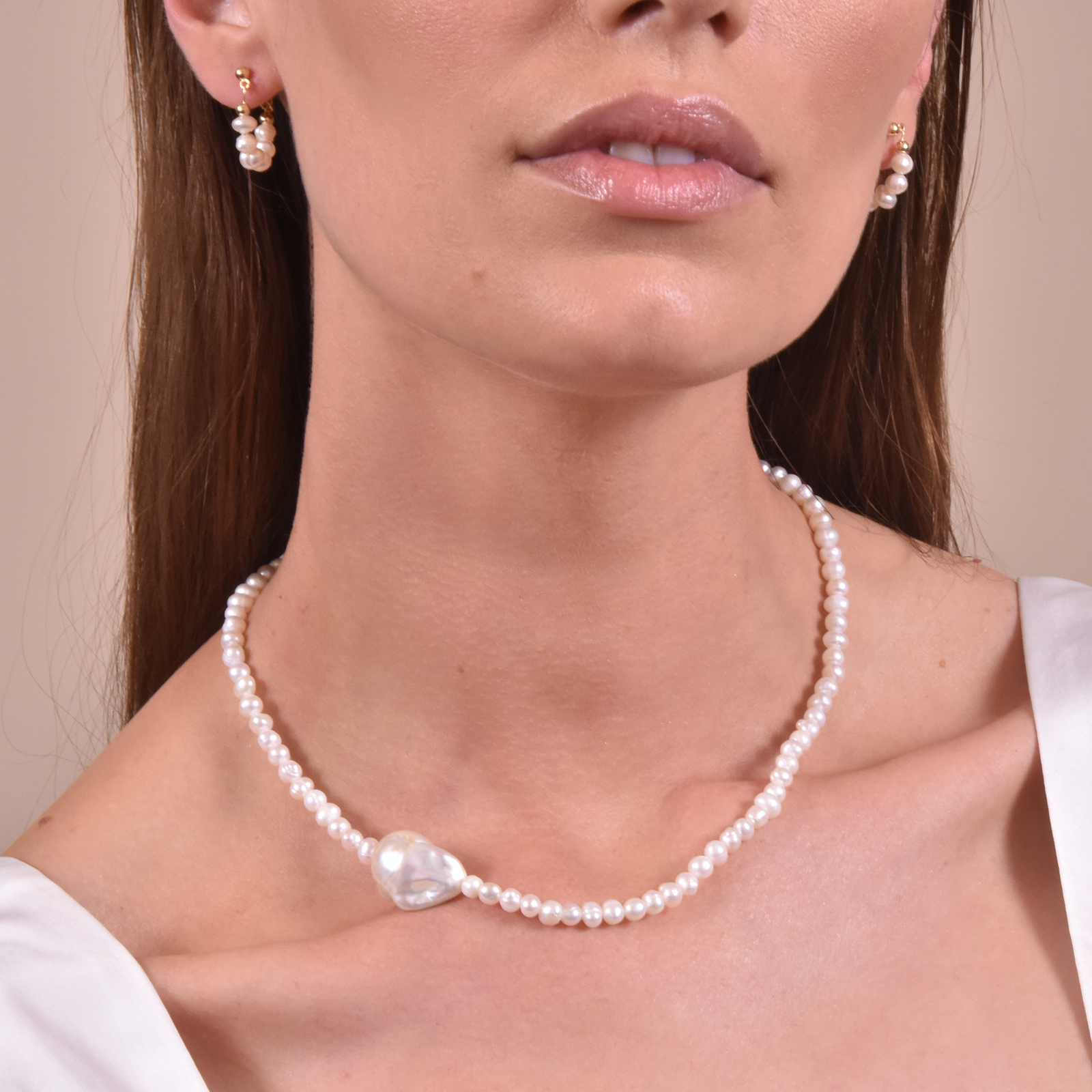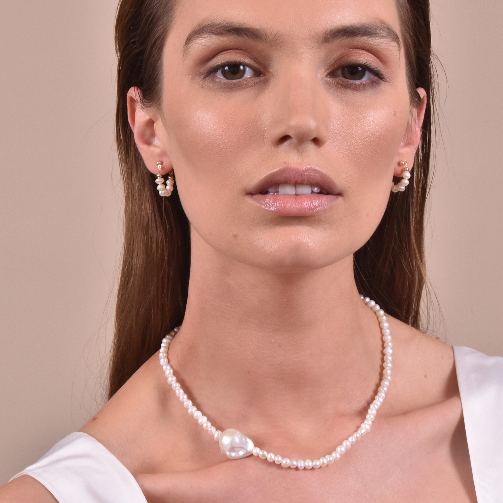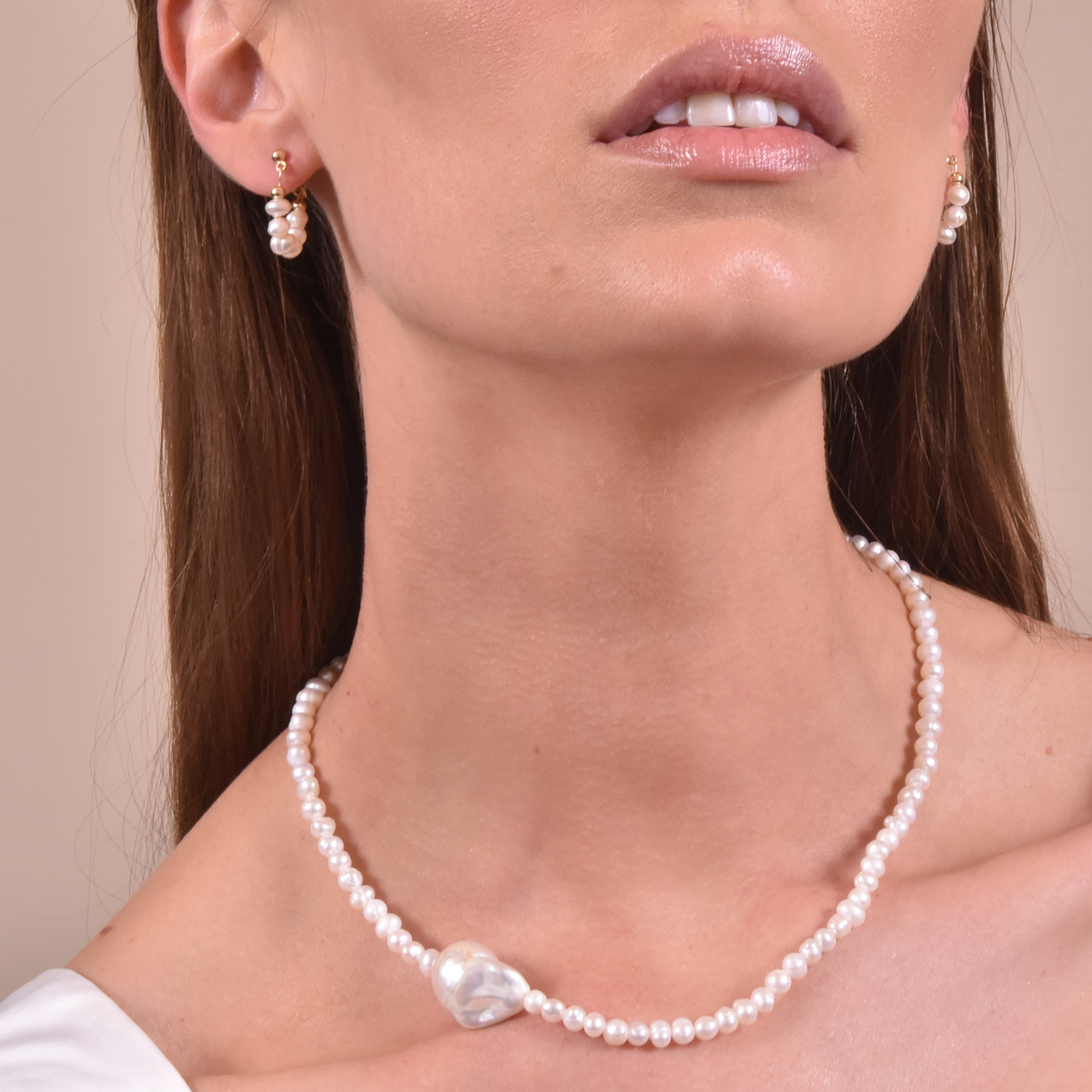 Elegance that attracts a second glance. Introducing Milani Off Centre Pearl Necklace — a unique pearl necklace that excels and challenges the norm. This design features natural freshwater pearls with a larger baroque pearl pendant positioned to one side, forming an asymmetric aesthetic beauty that steals a second glance. Perfect for those who seek something different yet tick the elegance and timelessness box. Hypoallergenic, nickel, cadmium and lead free.