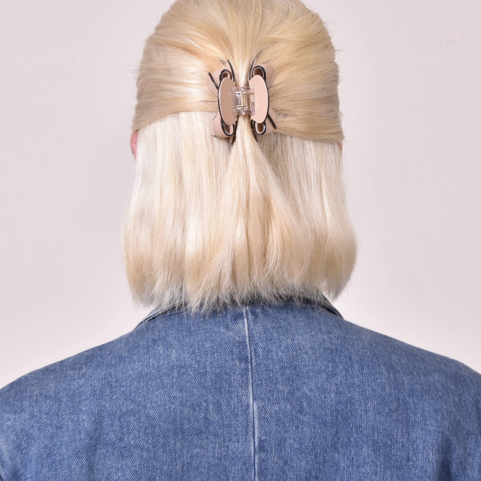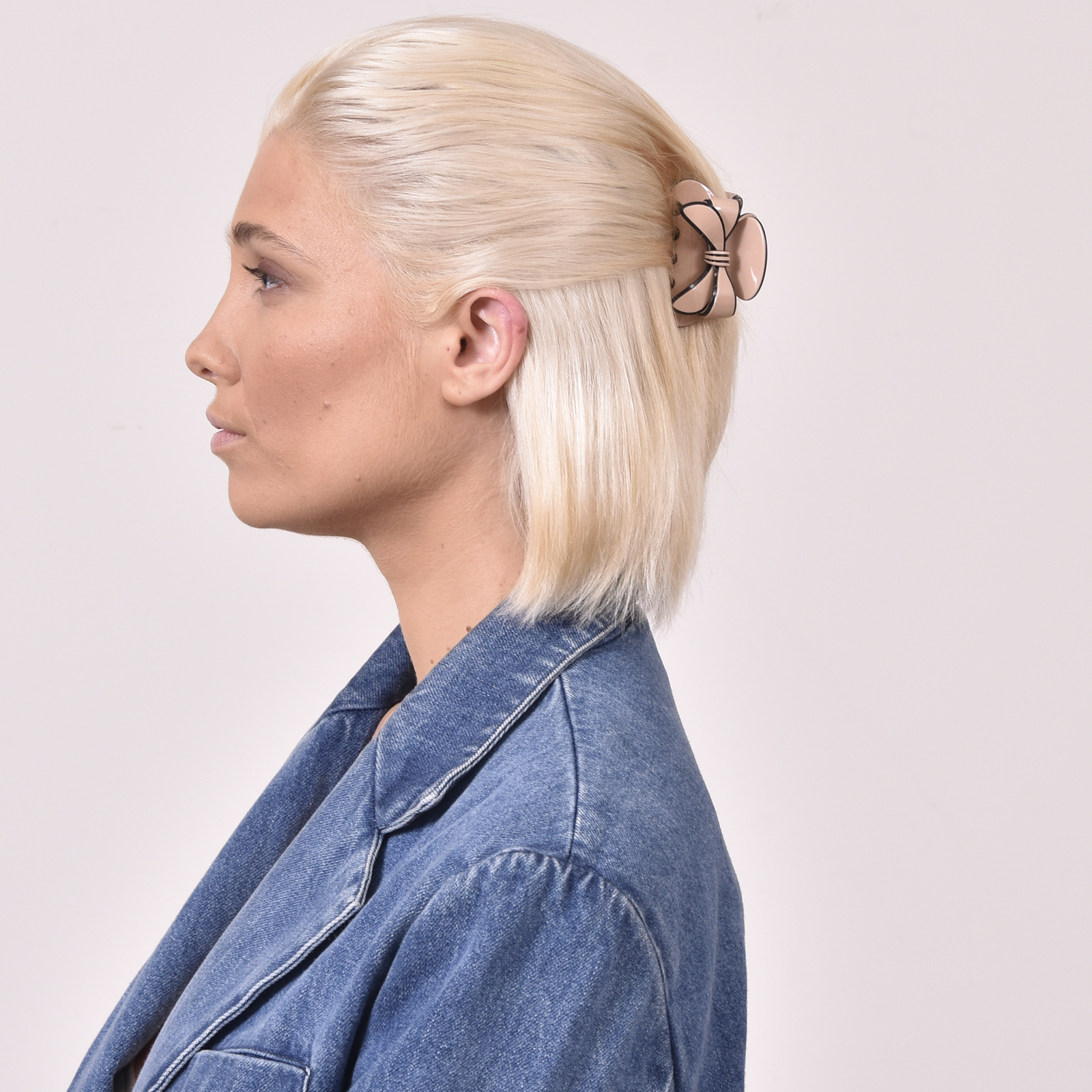 Relish your inner girl. Introducing Millie Bow Hair Claw - a chic and feminine hair cutie for bow lovers. This hair claw is made of thickened acrylic in a toffee base colour with black outlined edges. This claw is approximately 65mm in length and features one bow on each side of the claw. It offers a solid grasp of hair. Suitable for modern, retro, chic, feminine, girly, smart casual, casual, and everyday wear.