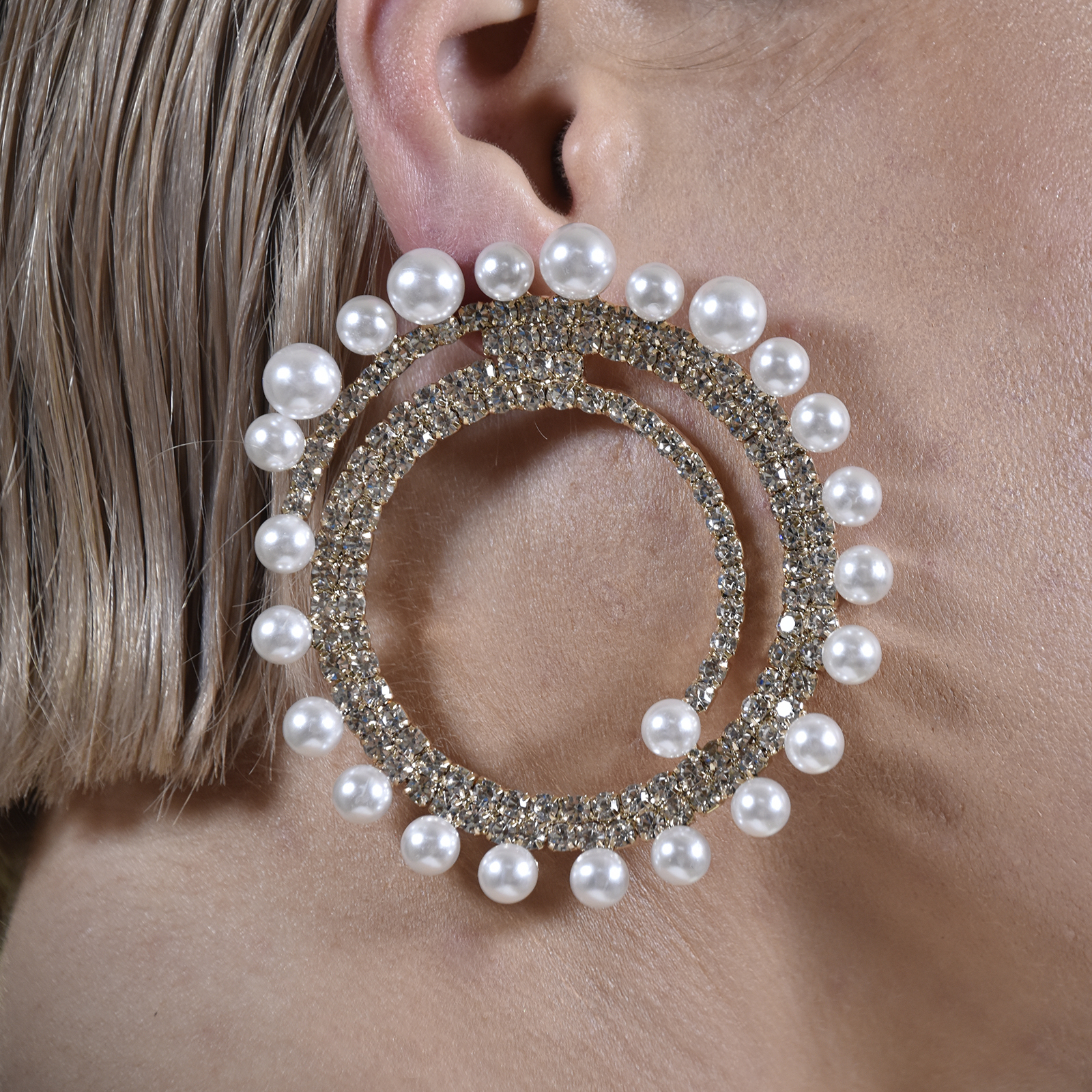 Extravagantly rebellious. Introducing Mirabella Catwalk Diamante Statement Earrings (Gold) - a runway style oversized statement that turns heads. This design features spirals embellished with high quality zirconias and faux pearls. The earrings are made in environmentally friendly brass (nickel free) with 14K gold plating for a subtle and soft gold shine. Perfect for formal, semi-formal, runway, red carpet, celebrity styling, creative styling, high fashion events, smart casual styles and more. Hypoallergenic, nickel, cadmium and lead free.