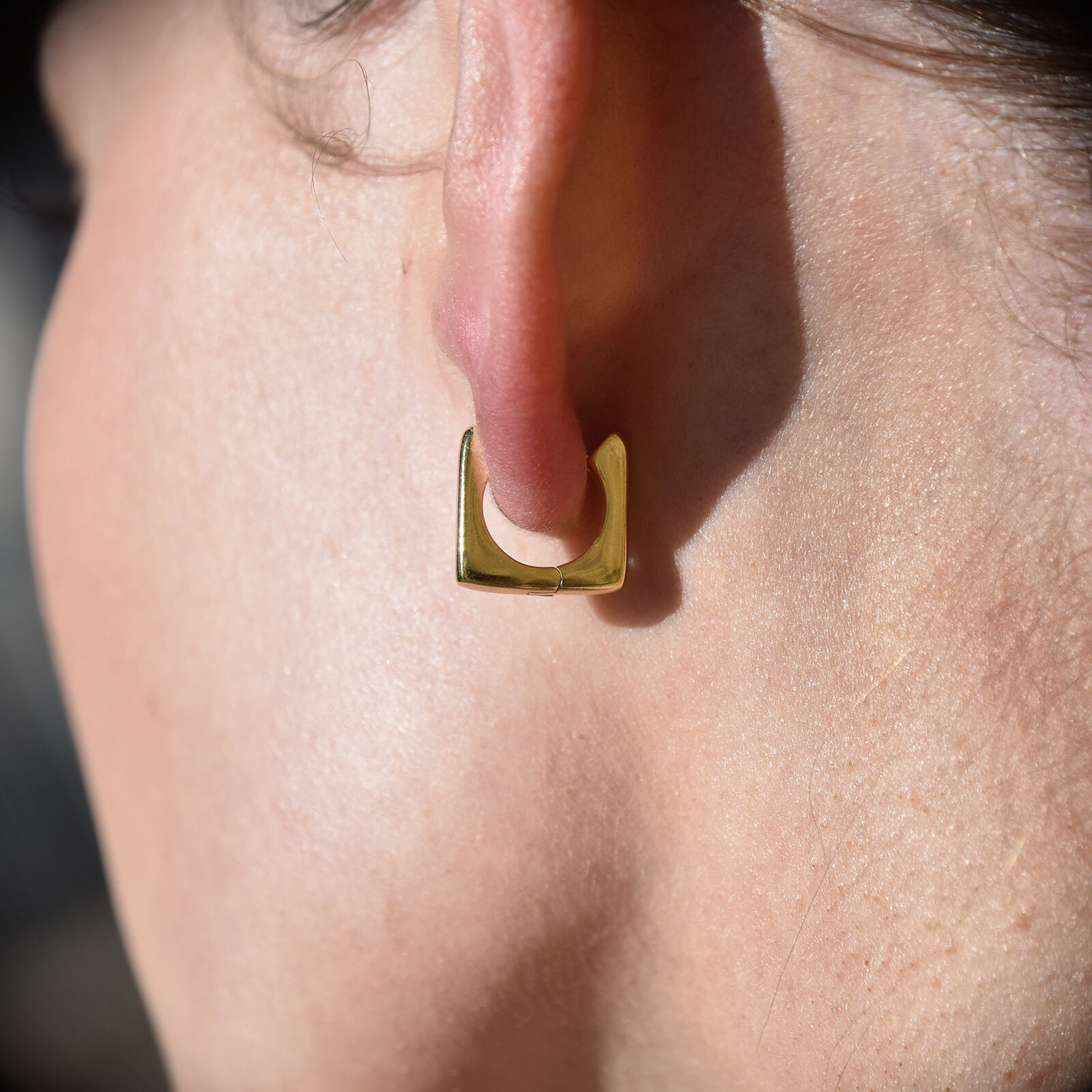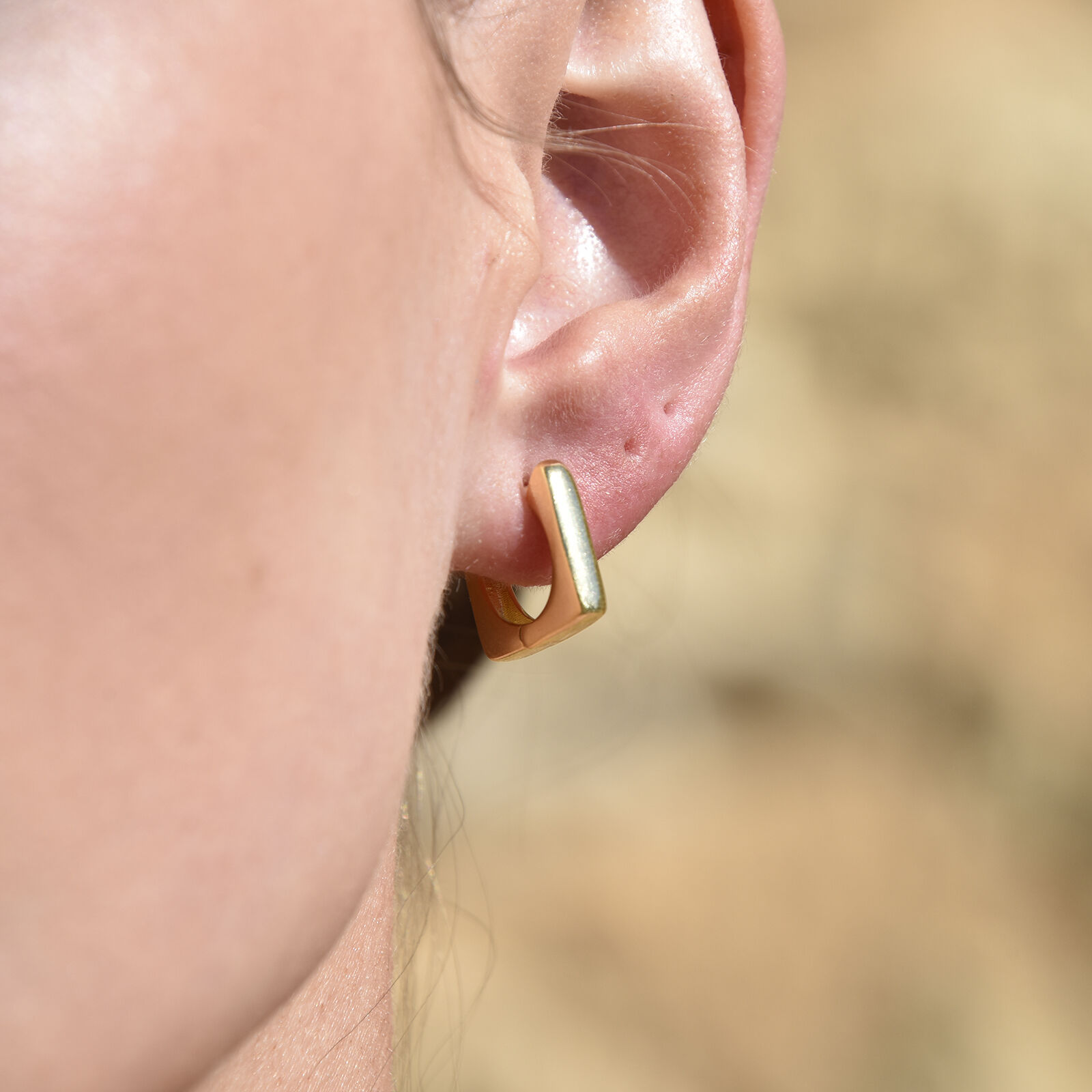 Everyday styling made effortless and chic. Introducing New Frame of Mind Huggie Earrings (Gold) - a contemporary ear love for those who love a simple and minimal touch. This design features square-cut huggie earrings with smoothed and rounded edges. The earrings are made in solid sterling silver with 18K gold plating for hypoallergenic and enduring wear. The earrings are smoothly polished and also of a solid weight (2.1g / earring). Suitable for women and girls of all ages and a versatile fit for all personal styles. Hypoallergenic, nickel, lead, and cadmium free. Available in gold or silver.