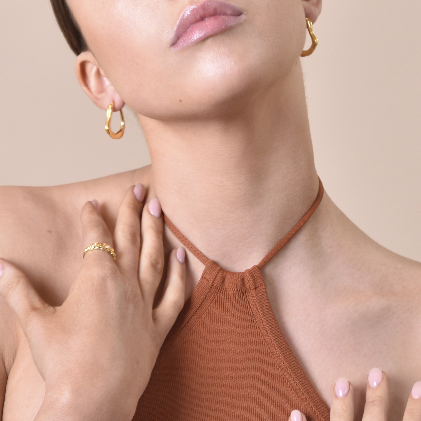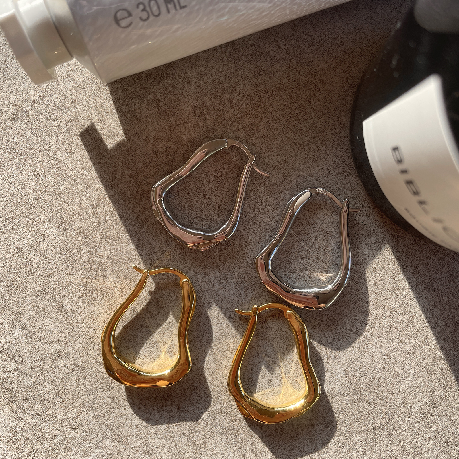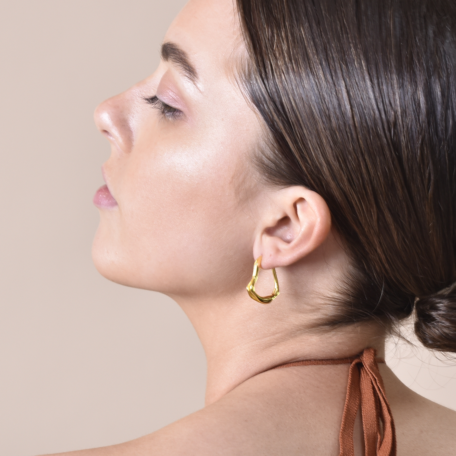 Go with the flow, free as a nomadic soul. Introducing Nomad Fluid Sculpture Hoop Earrings (Gold Vermeil) - a contemporary ‘liquid’ sculpture ear art embracing free form, irregularity, and uniqueness. This Nordic style design features irregular hoops that have a noticeable depth. The earrings are made of solid sterling silver with 2.5 microns of 18K gold plating (heavily gold plated to Gold Vermeil Jewellery Standards), smoothly polished with an enriched and luxurious shine. They are of a comfortable weight for wearing all day. Perfect for modern, artsy, earthy, chic, minimalist, earring layering, smart causal, casual, everyday styles and more. Hypoallergenic, nickel, cadmium and lead free.