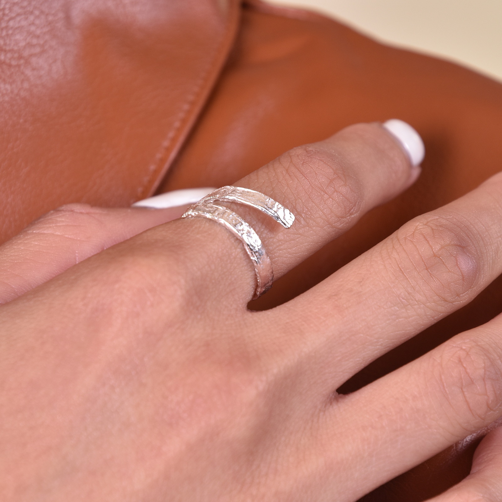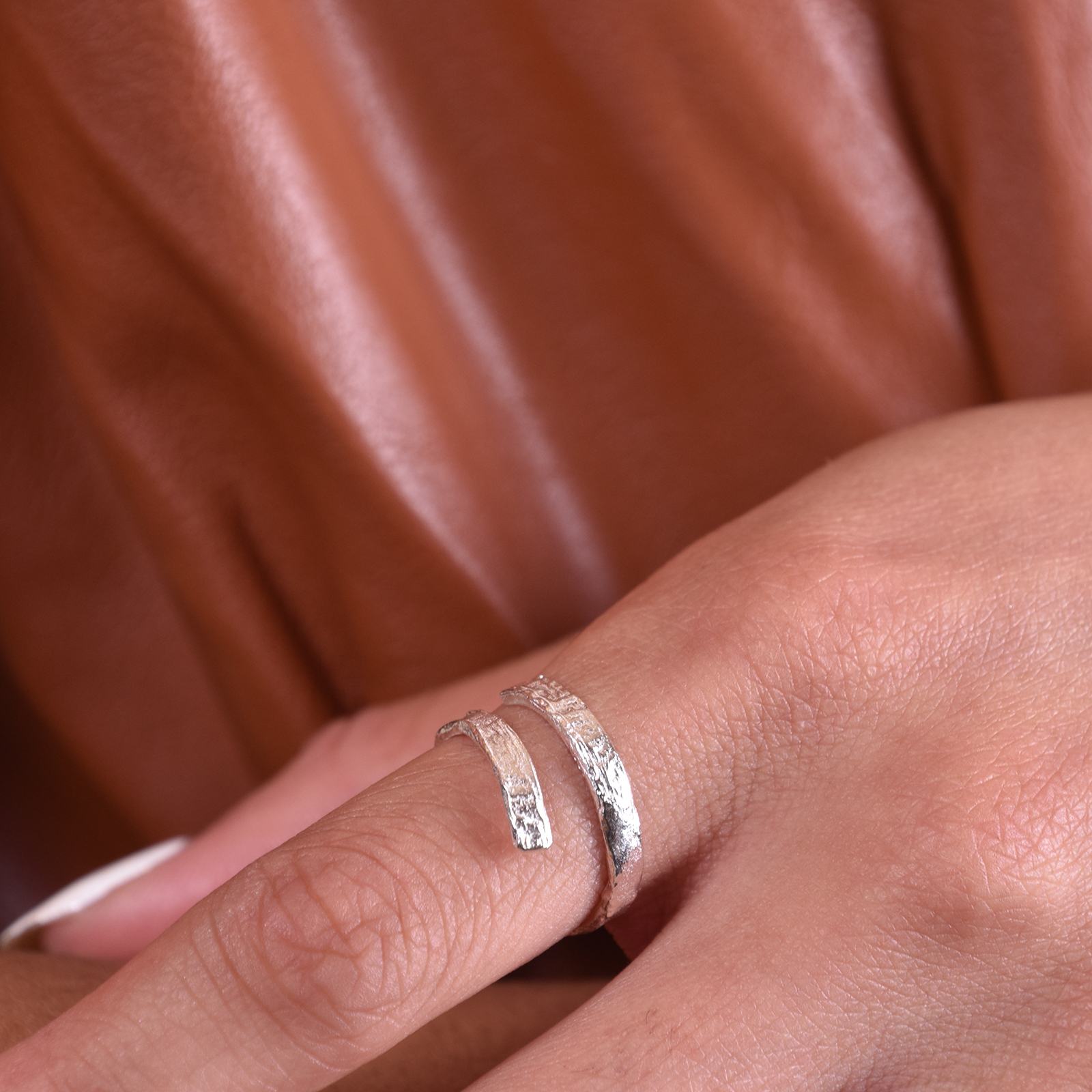 Simple, artsy and texture rich. Introducing Noora Sculpture Wrap Open Ring (Silver) - a unique finger art that is creative and versatile for styling. This design is inspired by modern abstract sculpture and textured art. It features a textured ring band forming an open hug around your finger, which also allows you to adjust for the ideal fit. This ring is made in solid sterling silver with white rhodium plating for an extra anti-tarnish protection and a brighter silver shine. Layering or wearing it alone, it adds an artsy and creative vibe to your styling. Perfect for contemporary, minimalist, smart casual, causal, everyday style and more. Hypoallergenic, nickel, cadmium and lead free.