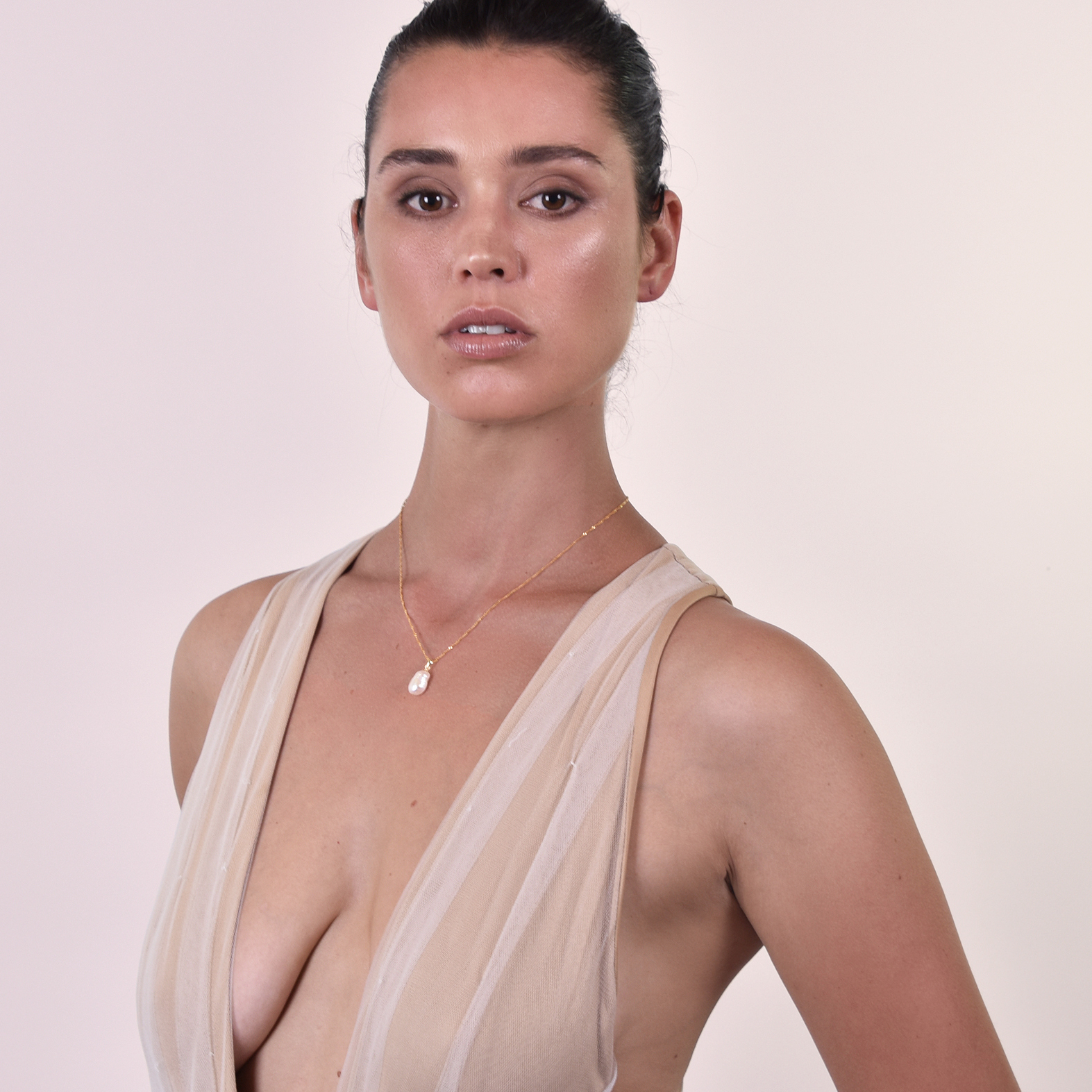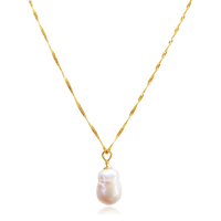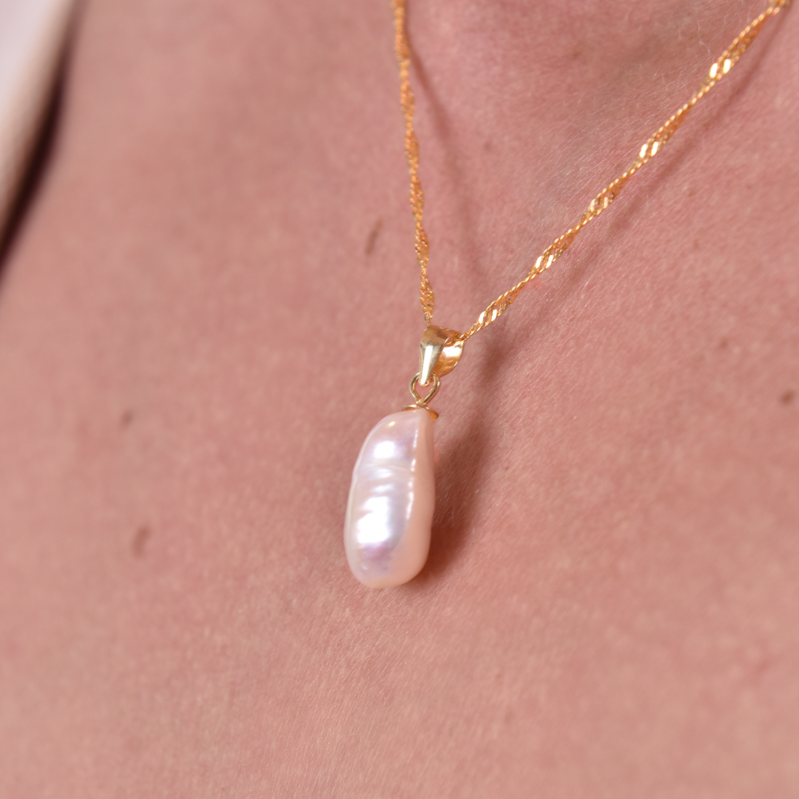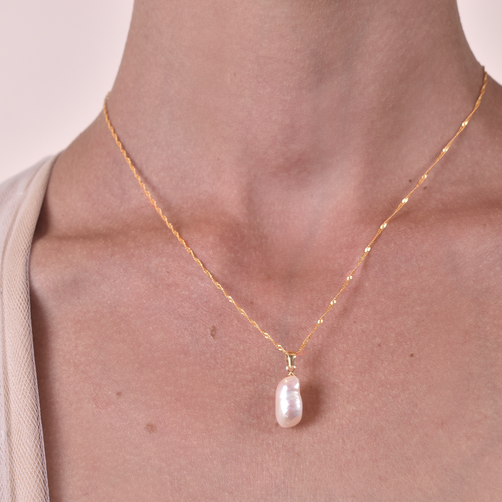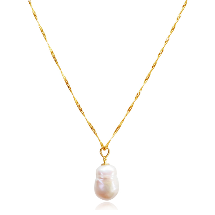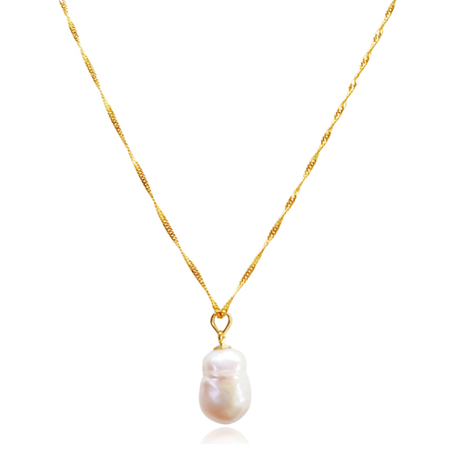 Timelessly elegant with a natural freshwater pearl drop. Introducing Nova 18K Freshwater Pearl Pendant Necklace - when everyday elegance becomes effortless. This design features one high quality natural freshwater pearl with smooth surface and high lustre. The size of the potato-shaped freshwater pearl is around 10mm in length and 8mm in width. The gold necklace has a water wave twist feature and is made of solid sterling silver with quality 18k yellow gold plating for a subtle and classy gold shine. Perfect for classy, elegant, formal, semi-formal, dressy, casual, modern, retro, chic, everyday styles and more. Hypoallergenic, nickel, cadmium and lead free.
