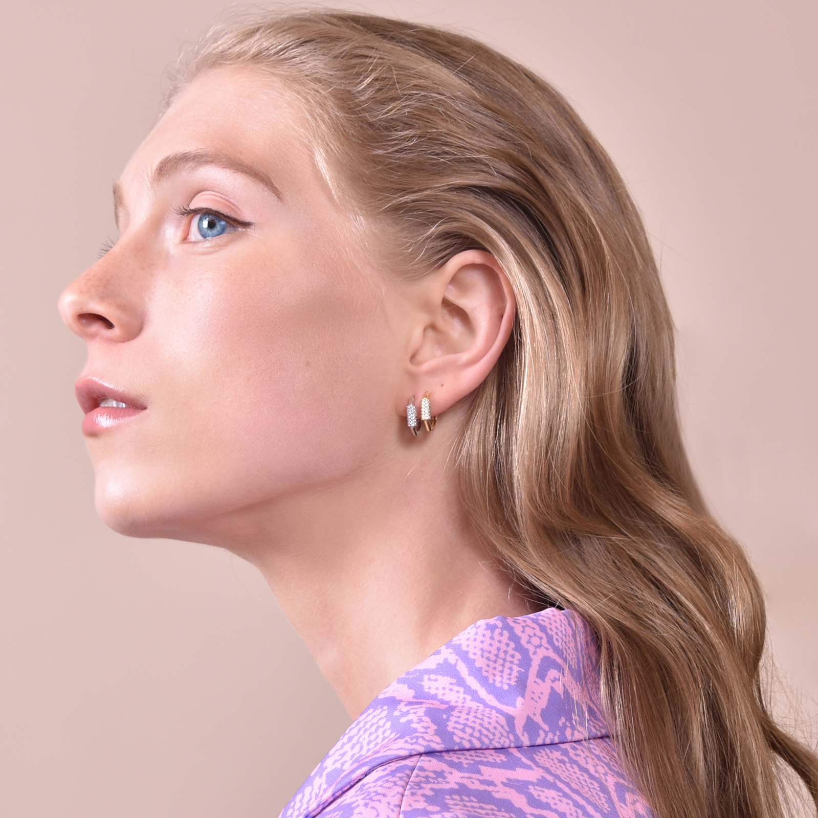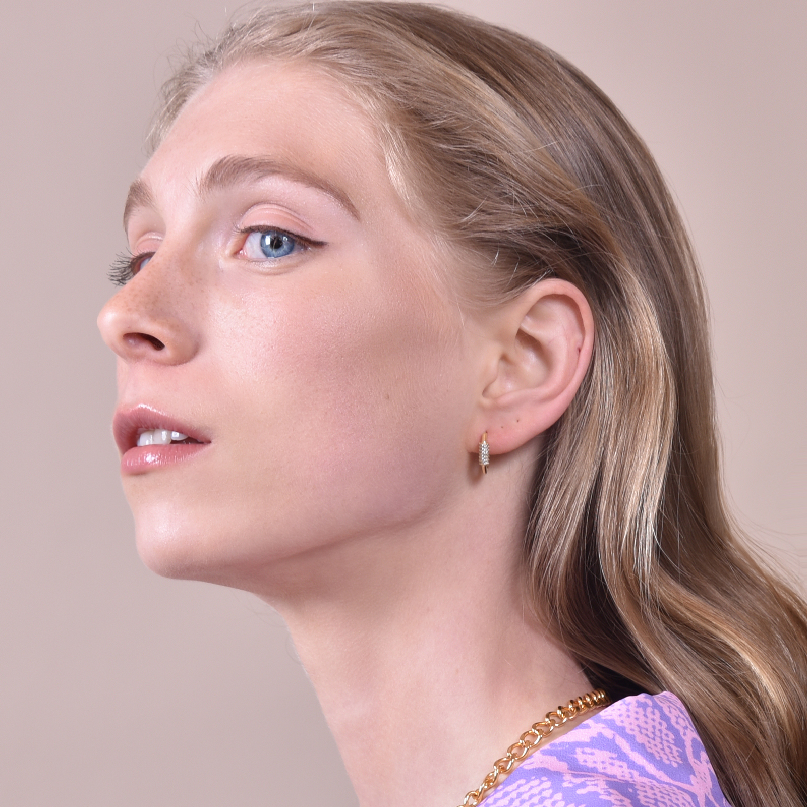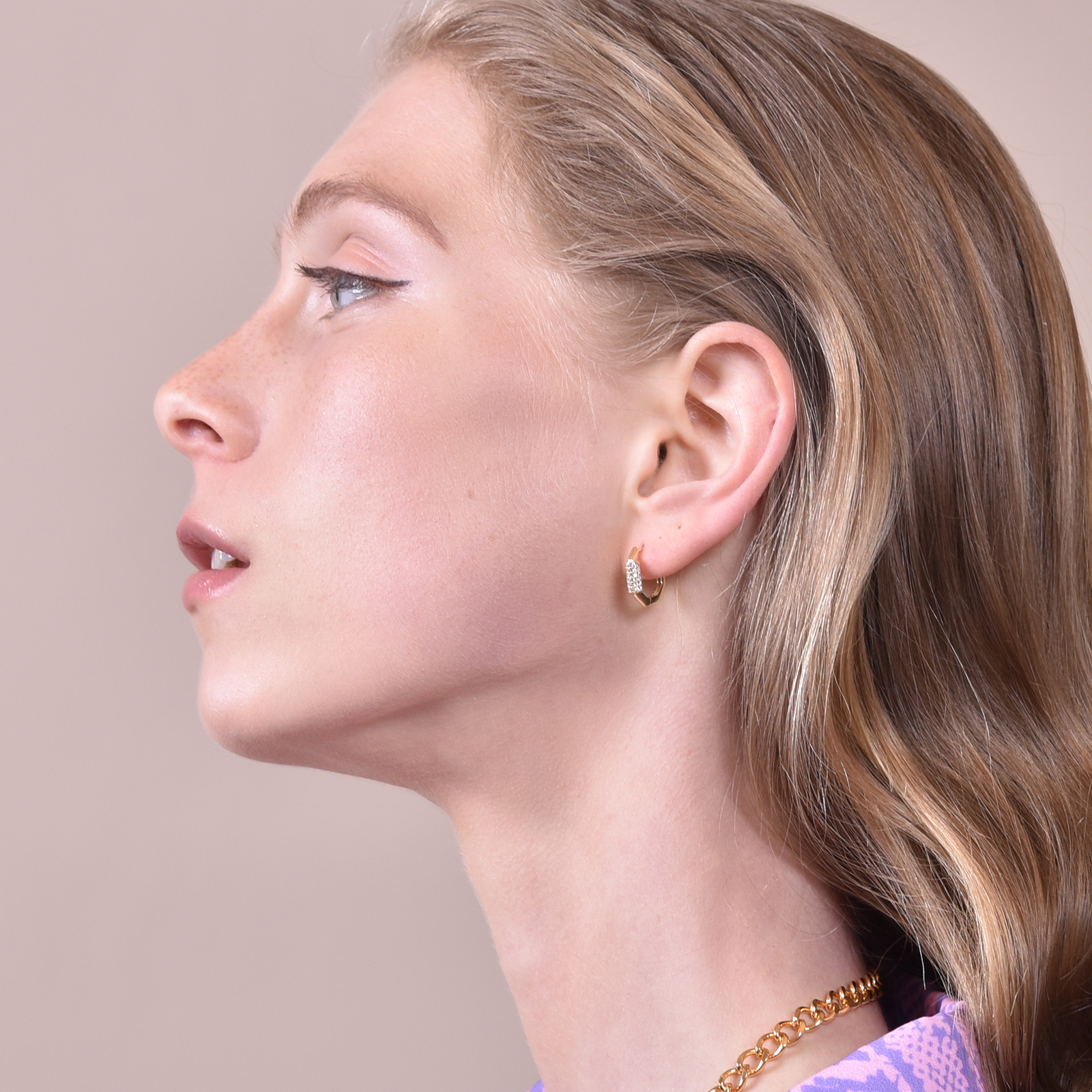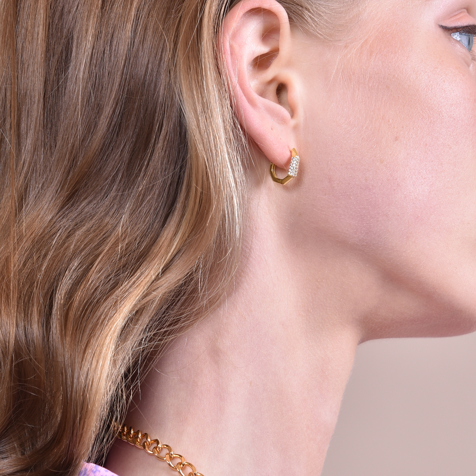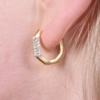 Dainty yet uncompromising. Introducing Octavia CZ Inlaid Dainty Huggie Earrings (Gold) - a stylish and edgy modern ethical ear love for those who prefer something different. This design features two octagon shaped gold huggies with the front sides embellished in Austrian cubic zirconias. The earrings are made of solid sterling silver with 18k gold plating to ensure durability and hypoallergenic wear. A statement that is not defined by size. Perfect for modern, artsy, punk, minimalist, earring multi layering, smart casual, casual and everyday styles. Suitable for women and girls of all ages. Also suitable for unisex wear. Hypoallergenic, nickel, cadmium and lead free.