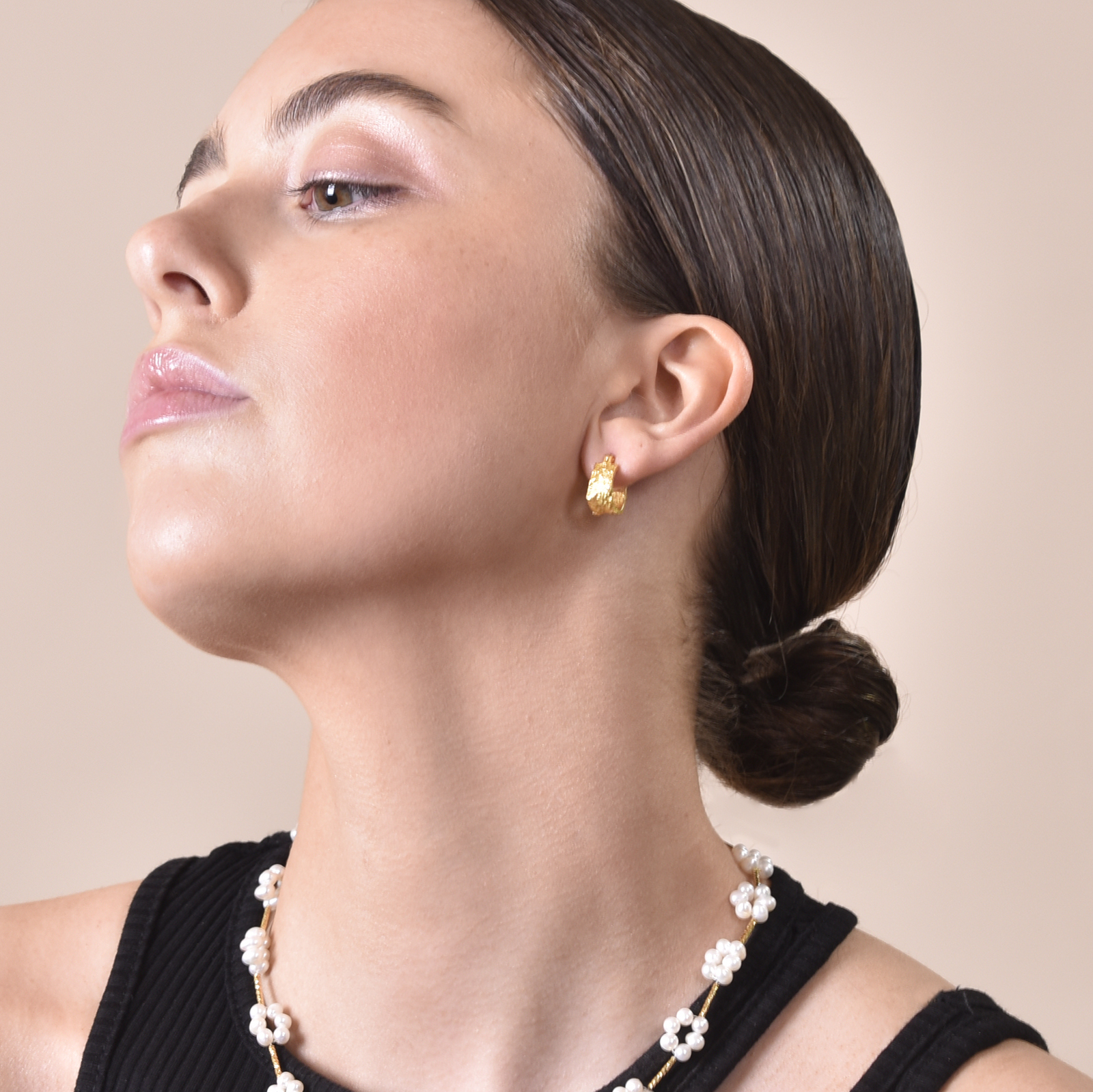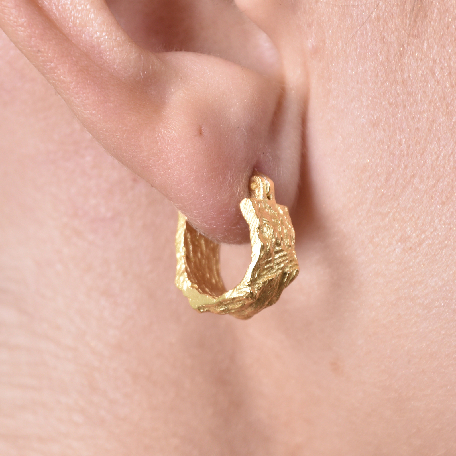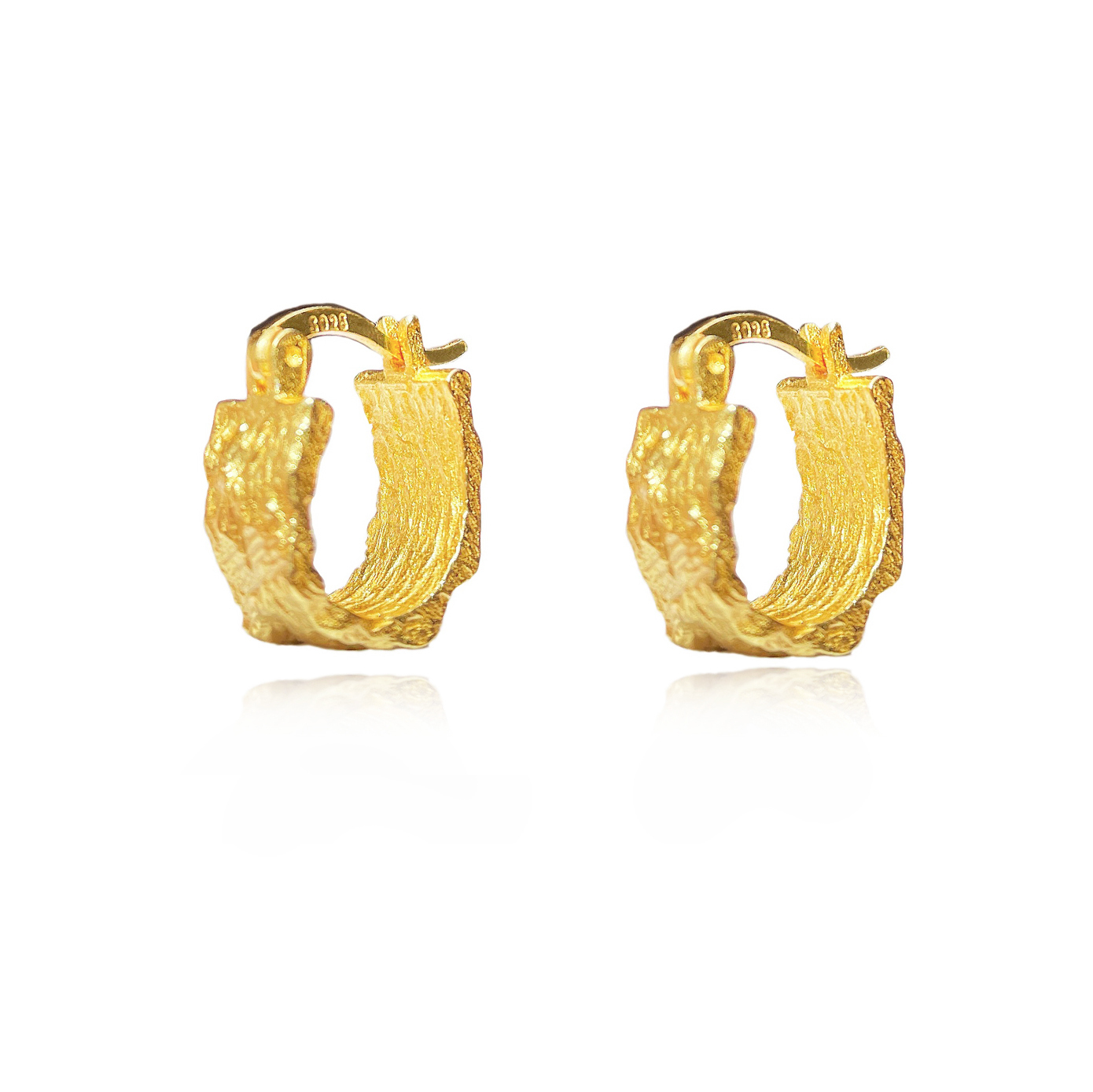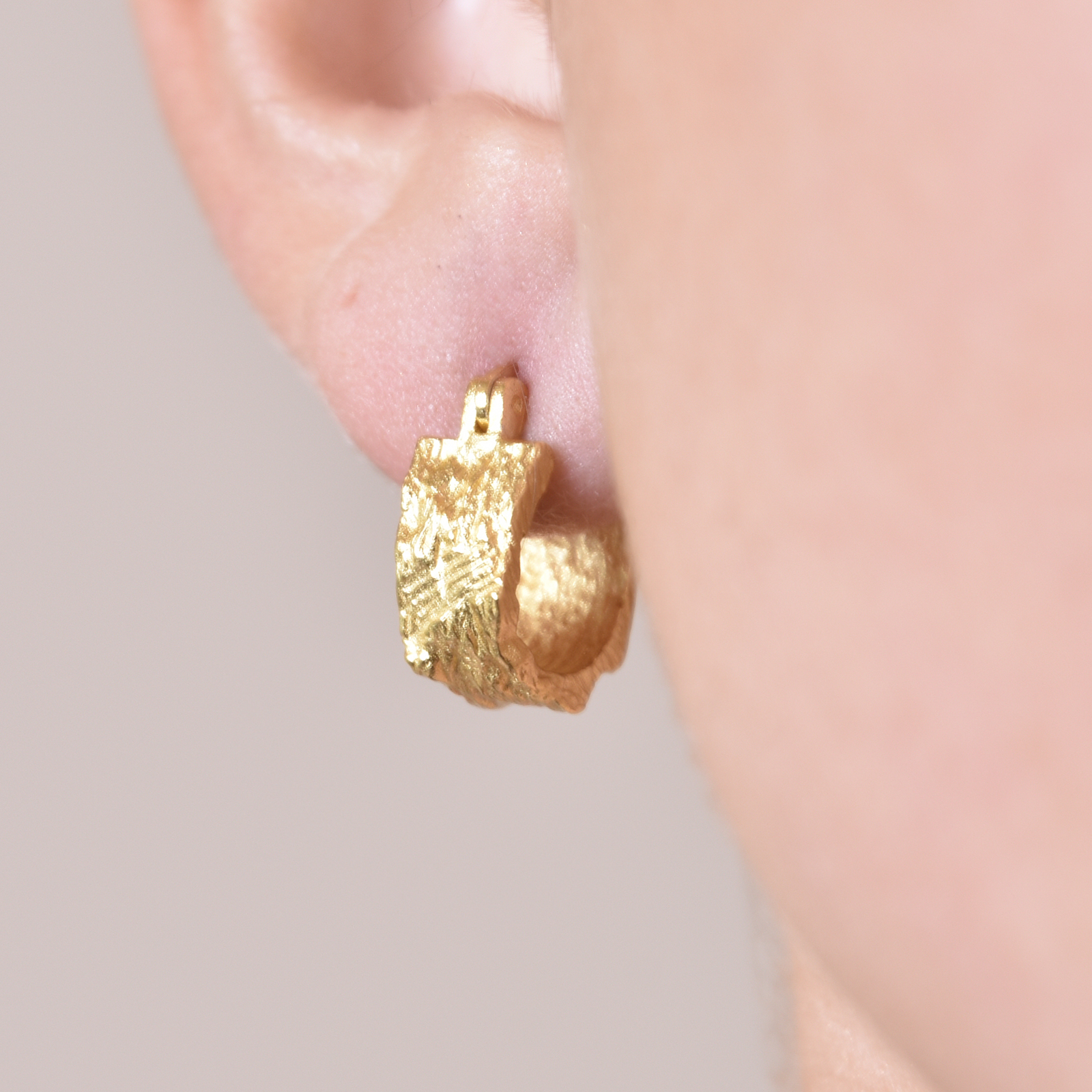 Something solid, timeless and exhibiting contemporary artsy vibes. Introducing Olli Textured Sculpture Huggie Earrings (Gold Vermeil) - a sculpture and coastal rocky texture inspired ear love for those who appreciate uniqueness and high quality. This design features U-shaped huggies with a decent depth and rich textures. The earrings are crafted in solid sterling silver with 2.5 microns of 18K gold plating (heavily gold plated to Gold Vermeil Jewellery Standards). They are of a comfortable weight for wearing all day. Perfect for modern, creative, fine, chic, minimalist, earring layering, earring mismatching, smart casual, casual, everyday styles and more. Also suitable for uni-sex wear. Hypoallergenic, nickel, cadmium and lead free.