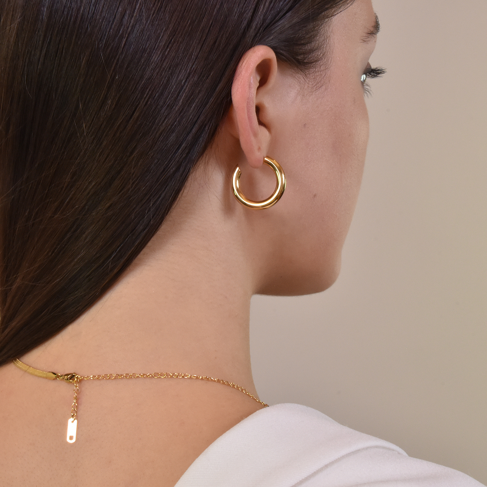 Classy, stunning, succinct yet tasteful, Oria premium Gold Hoop Earrings speak of high quality and timelessness. This design is crafted in titanium steel (nickel free) with premium quality 18K yellow gold plating (2.5 microns), giving the hoops a rich, smooth and luxurious gold shine that is also tarnish resistant. A classic style that hardly falls out of fashion. Perfect for all occasions and everyday wear.