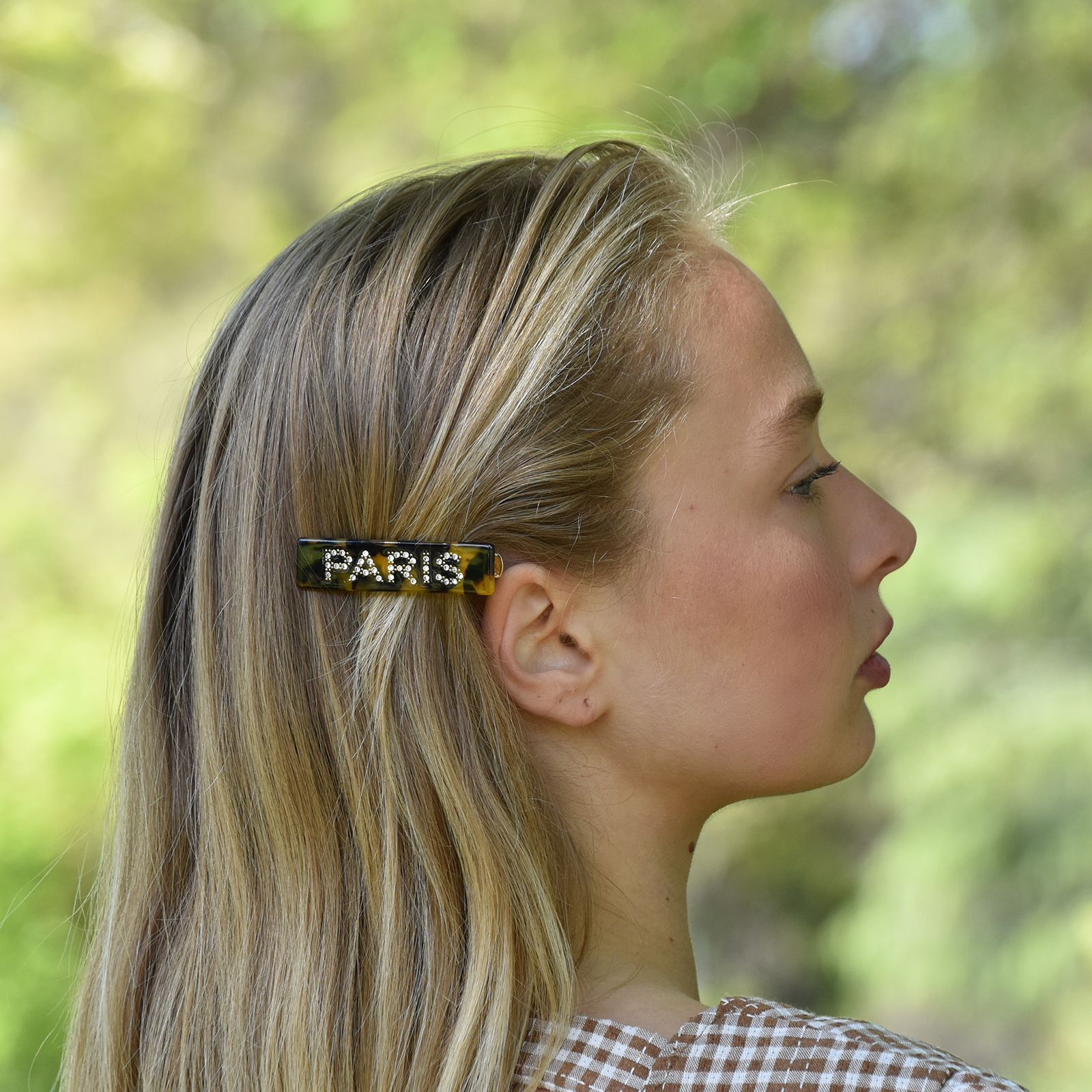 Chic, trendy and romantic. Introducing Paris Classic Leopard Barrette – a classic hair accessory that stays in trend. This piece features a leopard barrette with rhinestone embellished letters. It’s lightweight and easy to clip on and off. The perfect hair accessory for day to evening look, everyday styles and more.
