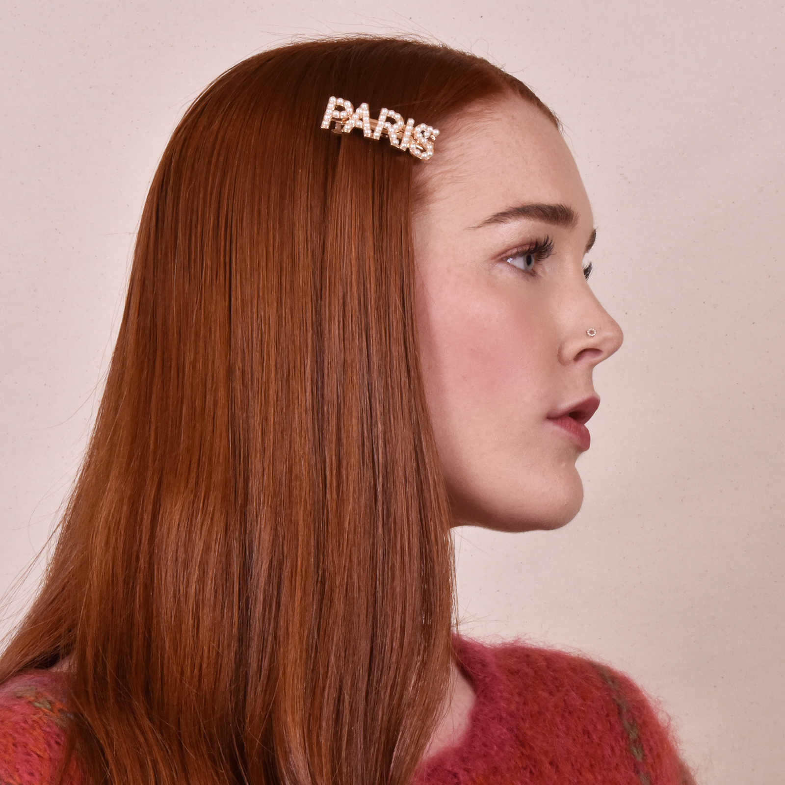 Hair statement easily done! Introducing Paris Pearly Statement Barrette - a modern and eye-catching hair accessory for every stylish girl who loves to stand out in a crowd. This piece features a contemporary gold letter clip decorated with simulated pearls forming ‘Paris’. A hair zest piece for fashionistas of all ages.
