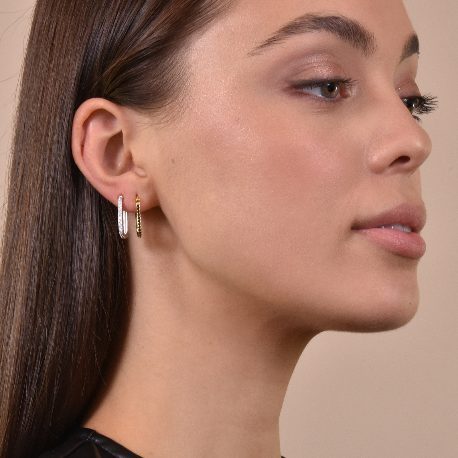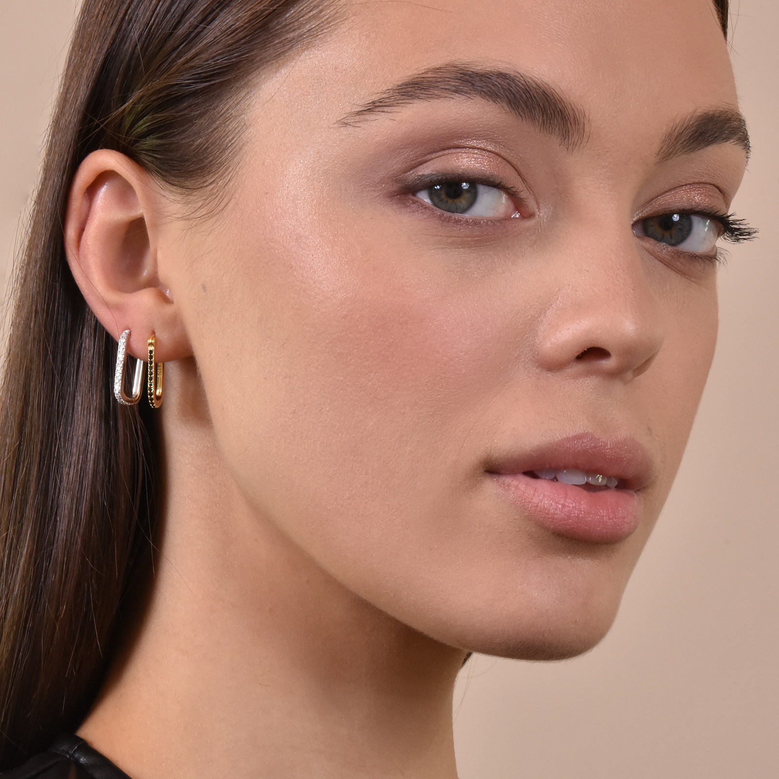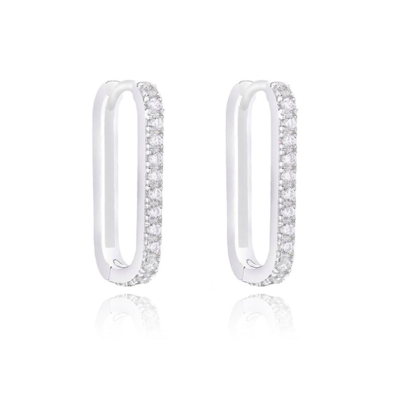 Chic dainty beauty with a subtle shimmer. Introducing Parker Dainty Silver Huggie Earrings — a modern minimalist style ear love for dainty style lovers. This design features oval-shaped huggies with the front side embellished with clear cubic zirconias. The earrings are made of solid sterling silver that endures. Perfect for modern, minimalist, chic, punk, earring multilayering, mismatching, Nordic, casual, everyday styles and more. Hypoallergenic, nickel, cadmium and lead free.
