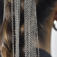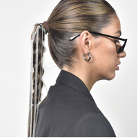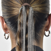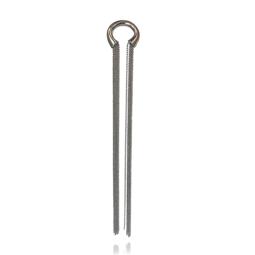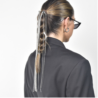 Born unique, wear unique. Introducing Peyton Tassel Drop Open Hair Clip - a deco style hair statement for an artsy, edgy and outspoken touch. This piece features an open solid metal hoop attached with chain and beaded long tassels. This piece is made in environmentally friendly stainless steel with the silver hoop smoothly polished to a reflective high shine. This piece is ideally to be clipped on a high pony tail with the long tassels drop naturally or braided with the hair. Perfect for modern, artsy, creative styling, chic, high fashion, punk, smart casual, casual styles and more.