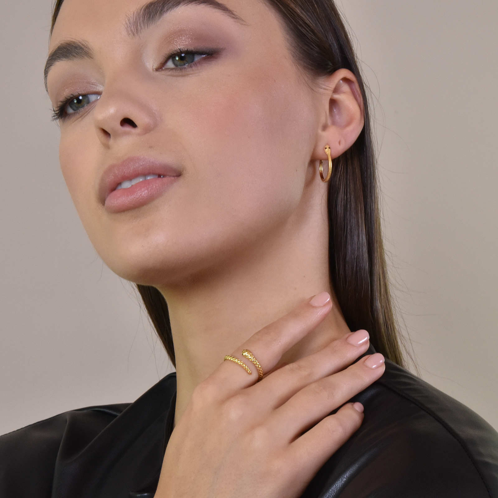 Unique, chic, and detail rich. Introducing Philomena Gold Vermeil Serpent Hoop Earrings - an artisan crafted modern earring style for lovers of uniqueness and style. This design features gold serpent hoops with a delicate skin pattern and black zirconia eyes. The earrings are made of solid sterling silver with 2.5 microns of 18k gold plating (to Gold Vermeil Jewellery Standards) for hypoallergenic and durable wear. They are also of a very comfortable weight for wearing all day. These earrings are safe for sensitive ears. Perfect for modern, chic, artsy, minimalist, earring layering, smart casual, casual, everyday styles and more. Hypoallergenic, nickel, cadmium and lead free. Allergy free.