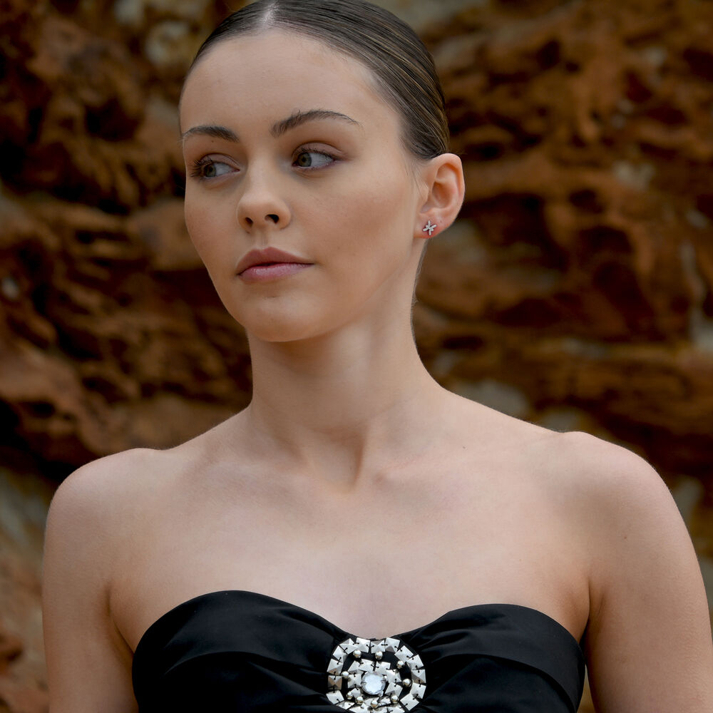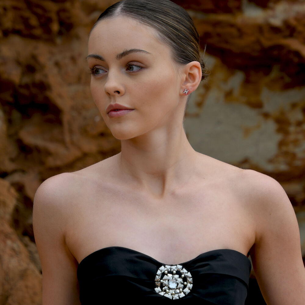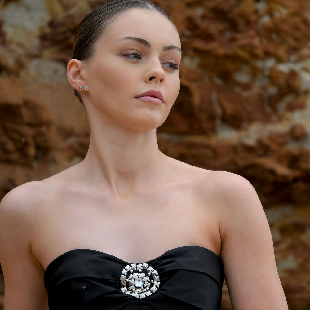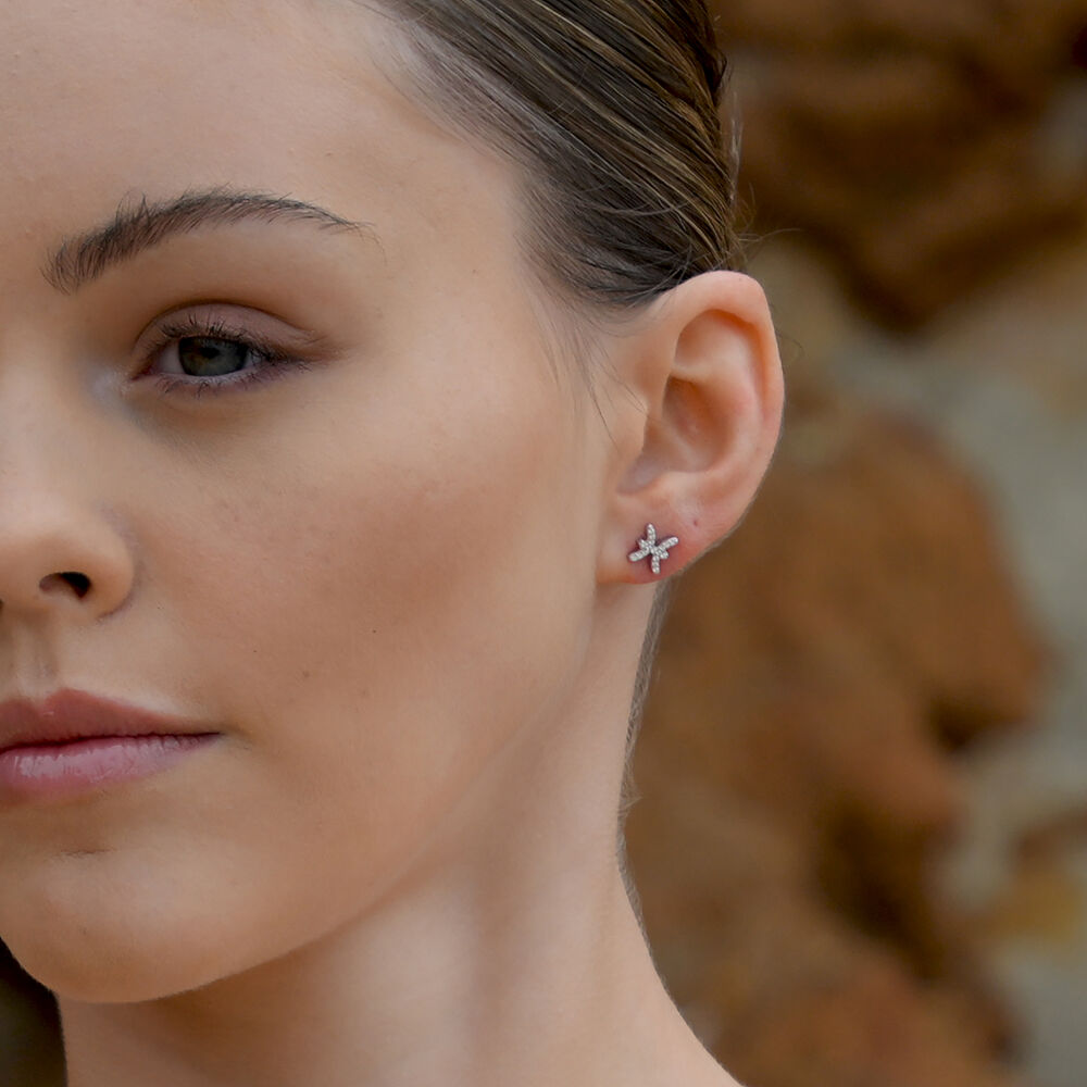 Each earring is meticulously crafted from solid sterling silver and finished with precious white rhodium plating, offering enhanced anti-tarnish protection and a brighter, more radiant silver shine. The surface is set with Australian cubic zirconia pavé, forming a delicate constellation of light that sparkles beautifully with every movement.