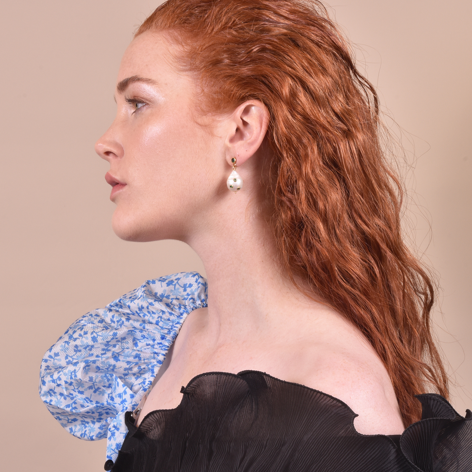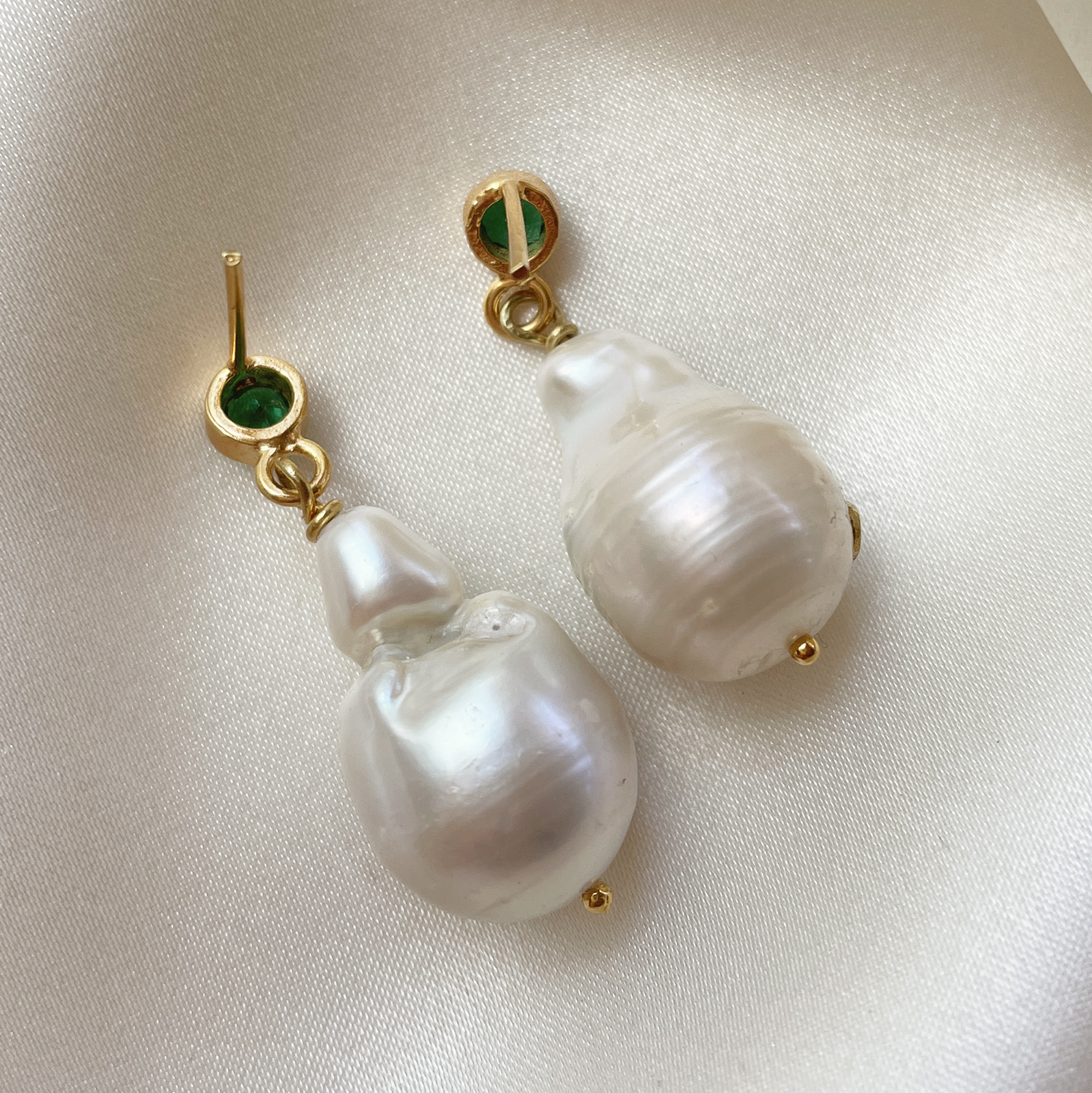 Exquisite pearl drop style at your access. Introducing Portia 24K Emerald Baroque Pearl Earrings - a top-trend timeless baroque pearl drop style for your style-keep-sakes! This exquisite style is handcrafted using hand-picked natural flared baroque pearls, gold hugged emerald stones, environmentally friendly brass with 24K quality gold plating. A true elegant and 'bold' statement that will lift your fashion vibes in seconds. Regardless smart casual or fancy dress-ups, a full designer-vibe luxurious pearl drop style radiates its magic styling power. Perfect for formals, semi-formals, fashion events, weddings, bridals, elegant, classy, modern and vintage styles.