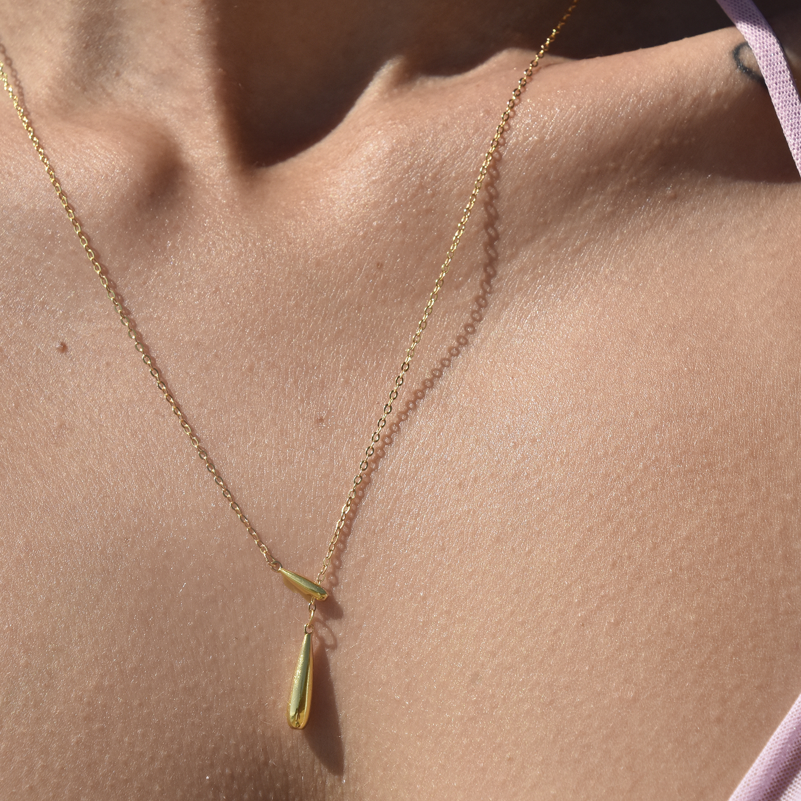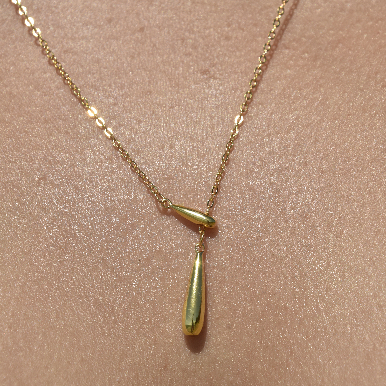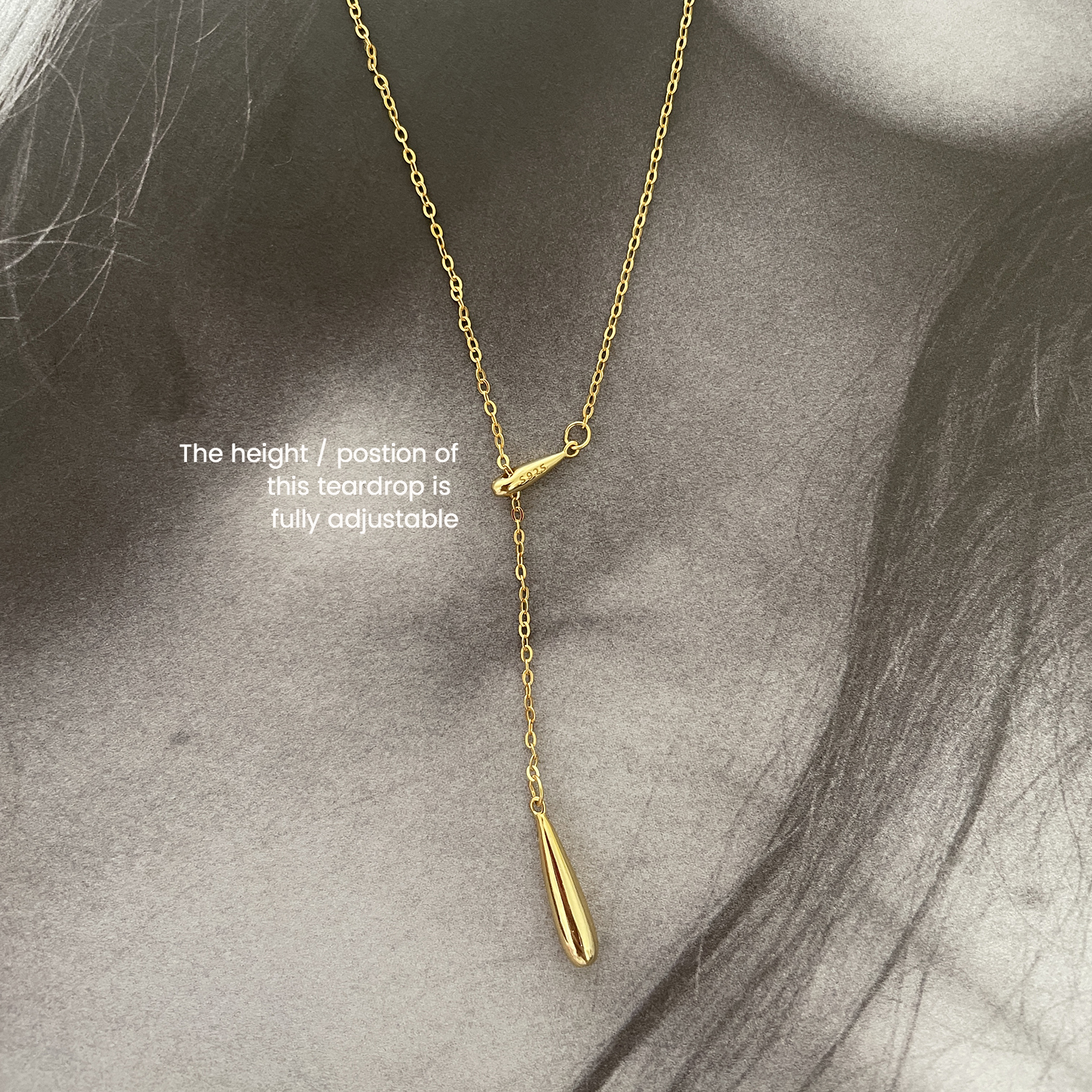 Modern simplicity in an elegant fine drop. Introducing Priscilla Modern Fine Drop Necklace (Gold) - a classy, chic and unique neck beauty enhancing your inner femininity. This design features elongated teardrop-shaped pendants hanging vertically and in a diagonal angle threading through the chain. The position of the shorter teardrop pendant can be adjusted to your personal styling preference. This necklace is made in solid sterling silver with 18K gold plating for hypoallergenic and enduring wear.Perfect for contemporary, artsy, creative, chic, minimalist, feminine, delicate, necklace layering, formal, semi-formal, smart casual, casual and everyday styles. Hypoallergenic, nickel, lead, and cadmium free.