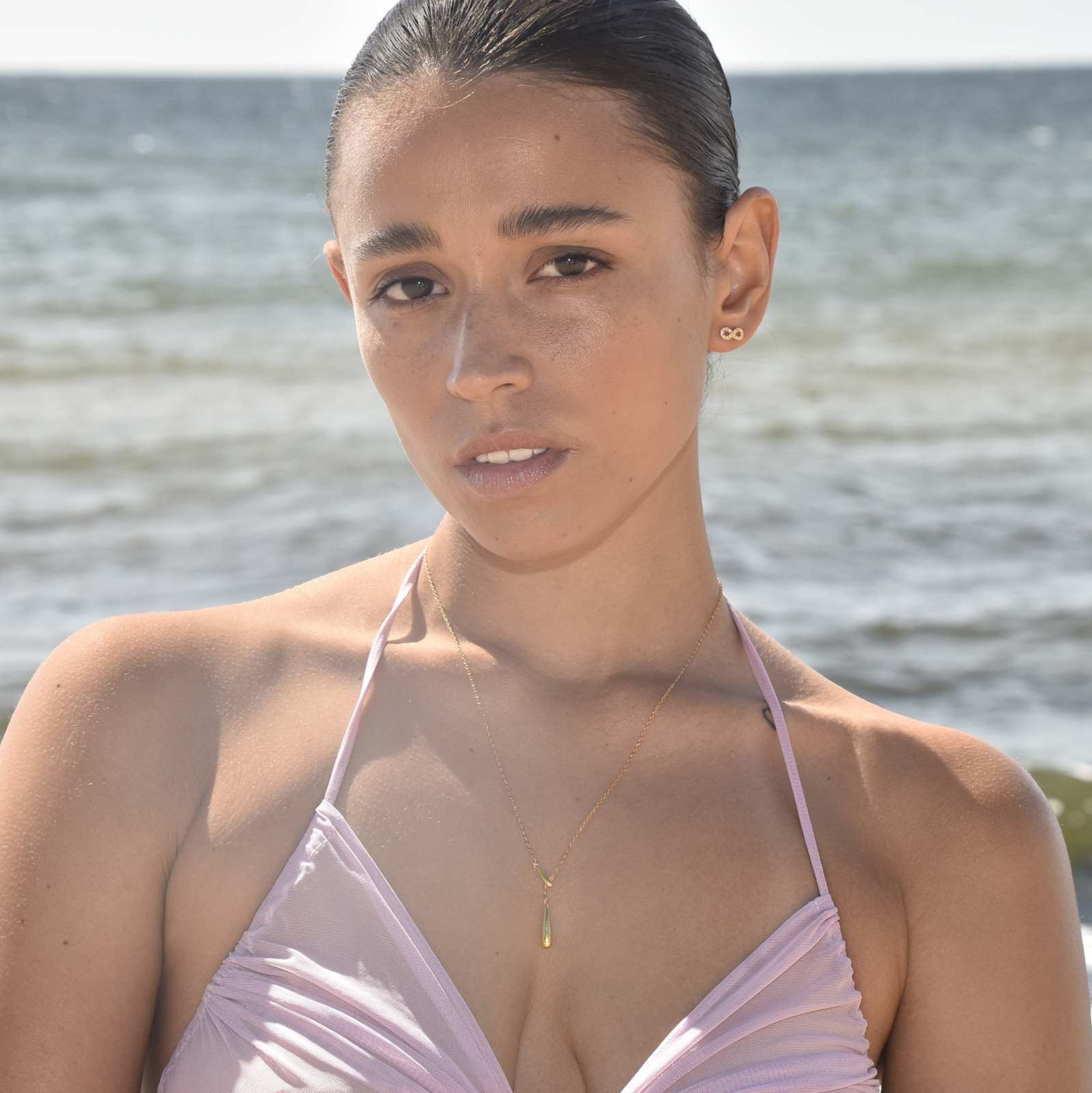 This necklace is 49cm long. Please kindly note that the position of the necklace sitting on your neck can vary from individual to individual depending on your top size. Model is a size 8.