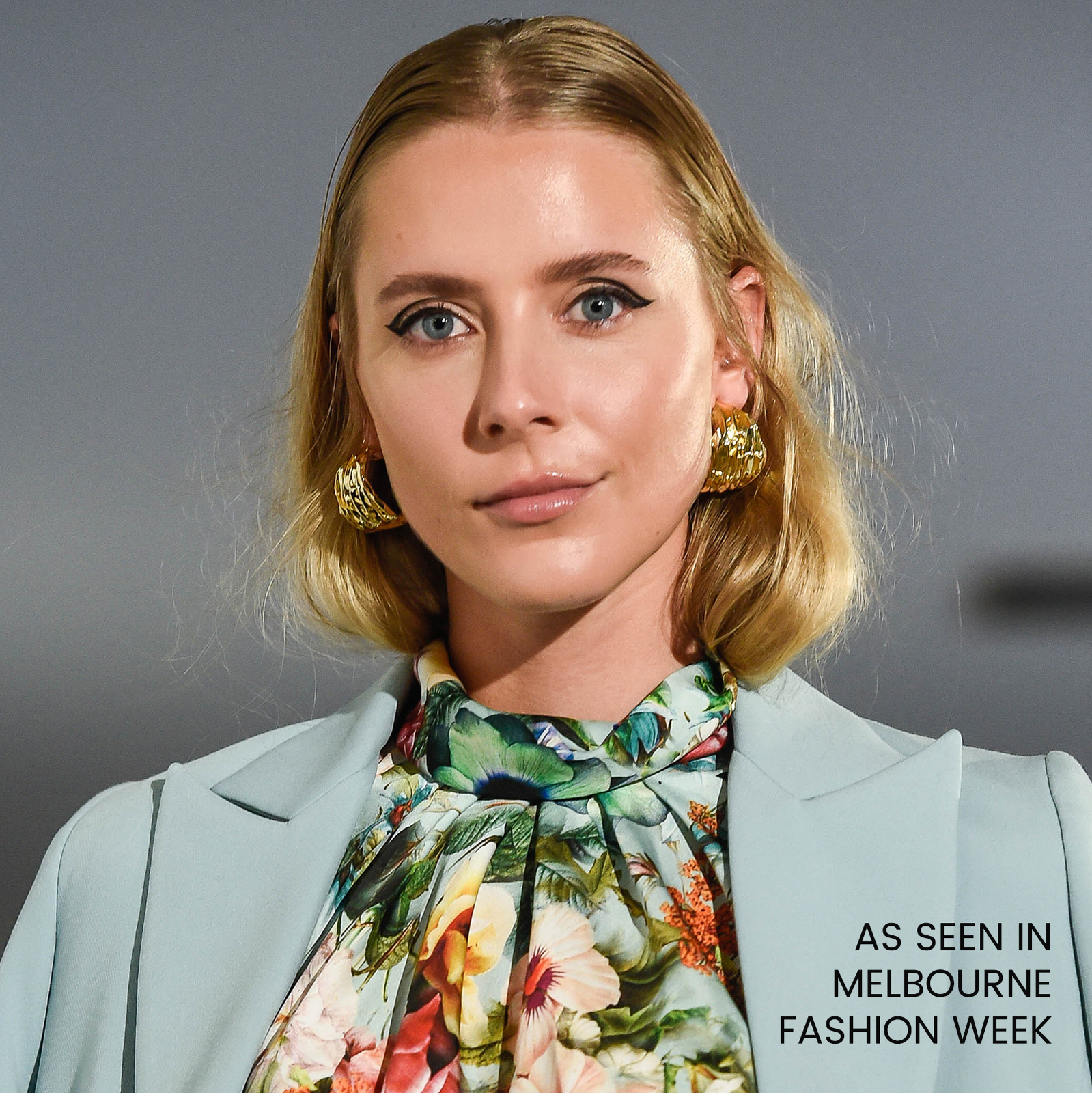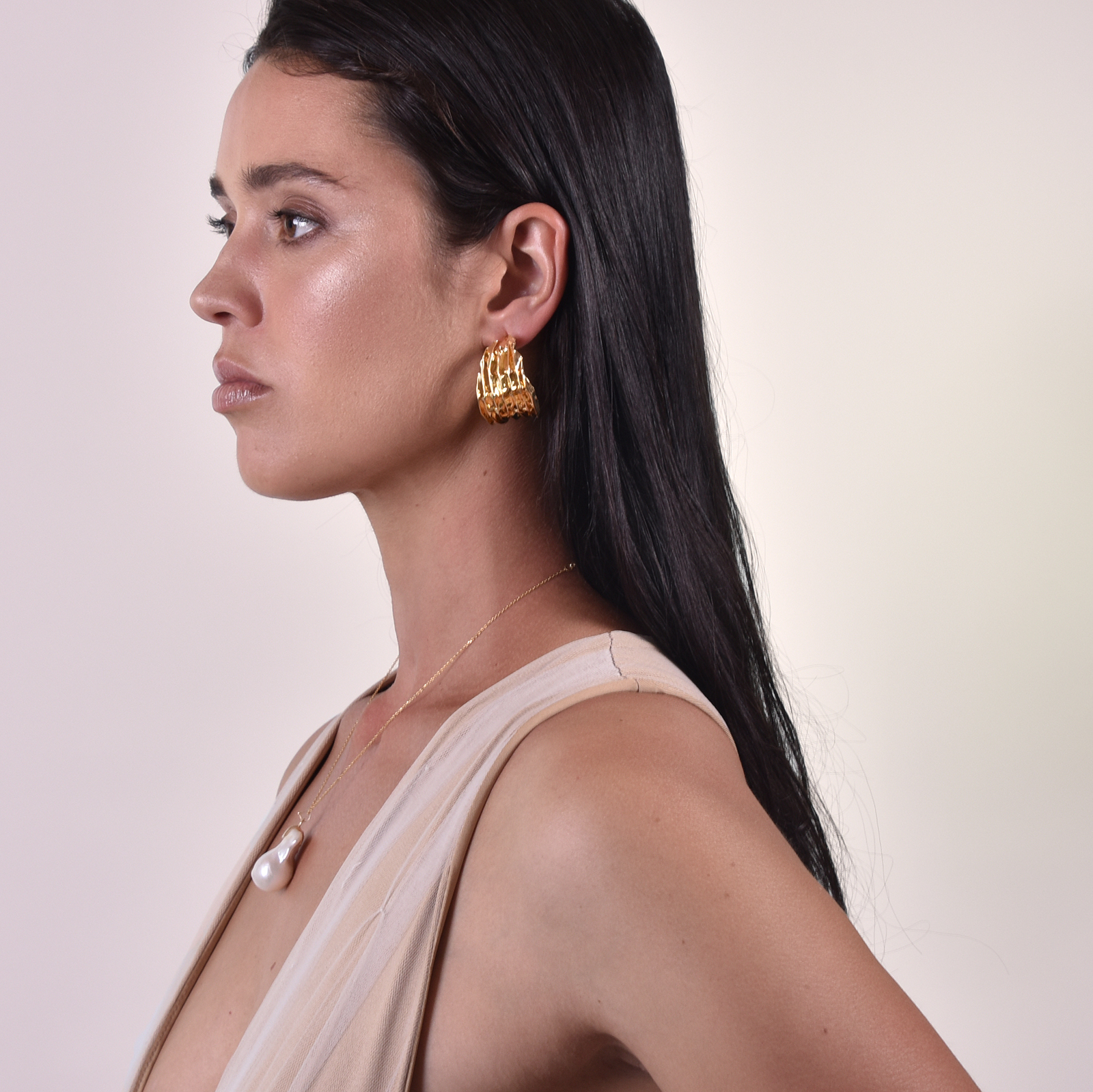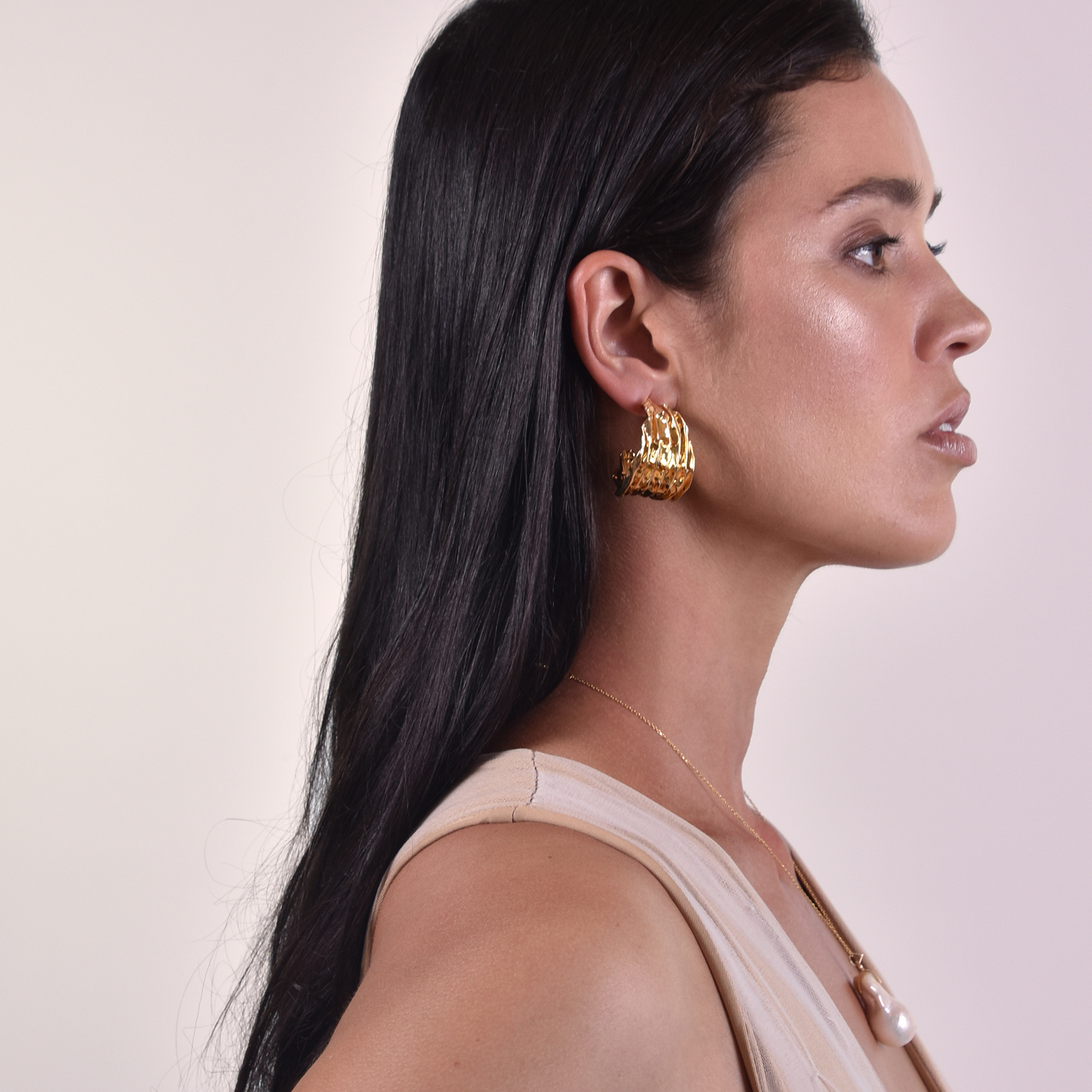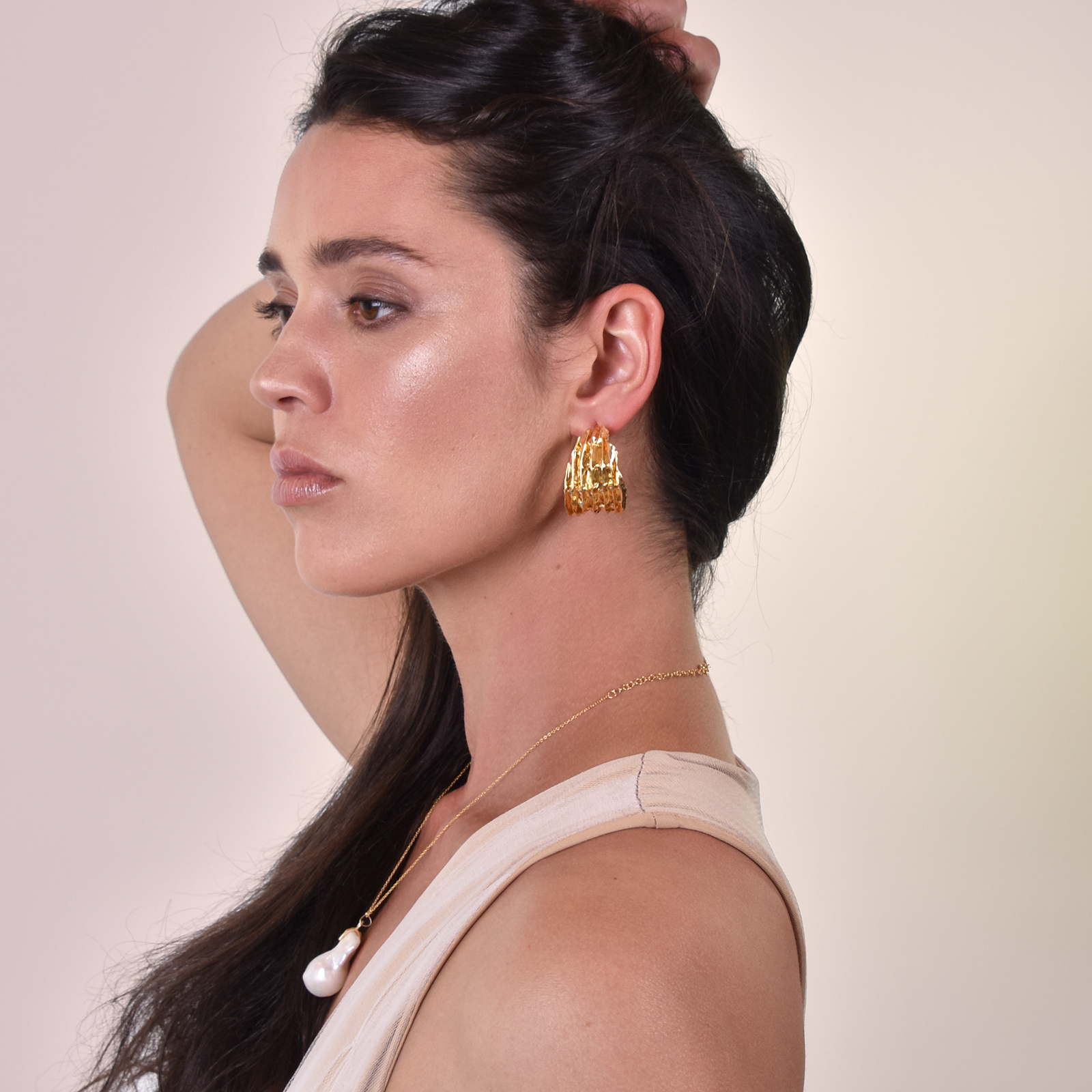 Inspired by modern sculpture and exhibiting rich textures and volume. Introducing Raphaella 24K Sculpture Curve Earrings - an artisan crafted contemporary earring style for statement-loving muses. This design features unfolded C-shaped curves made of environmentally friendly brass with rich 24k pure gold plating, giving the earrings a luxurious gold shine that is enduring and tarnish resisting. The earrings are of a very comfortable weight (3.4g per earring) for long hours of wearing. Perfect for formal, semi-formal, dressy, function, party, fashion events, modern, artsy, chic, statement, casual styles and more. Hypoallergenic, nickel, cadmium and lead free.