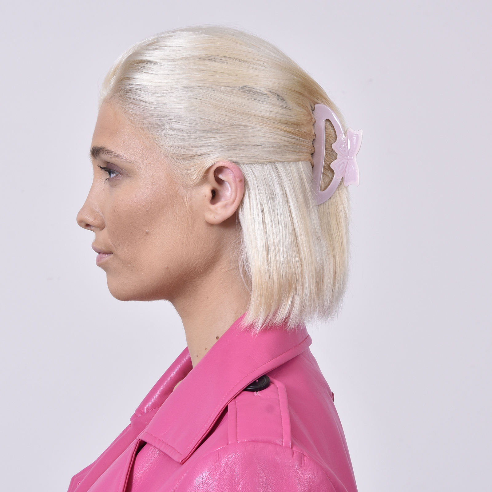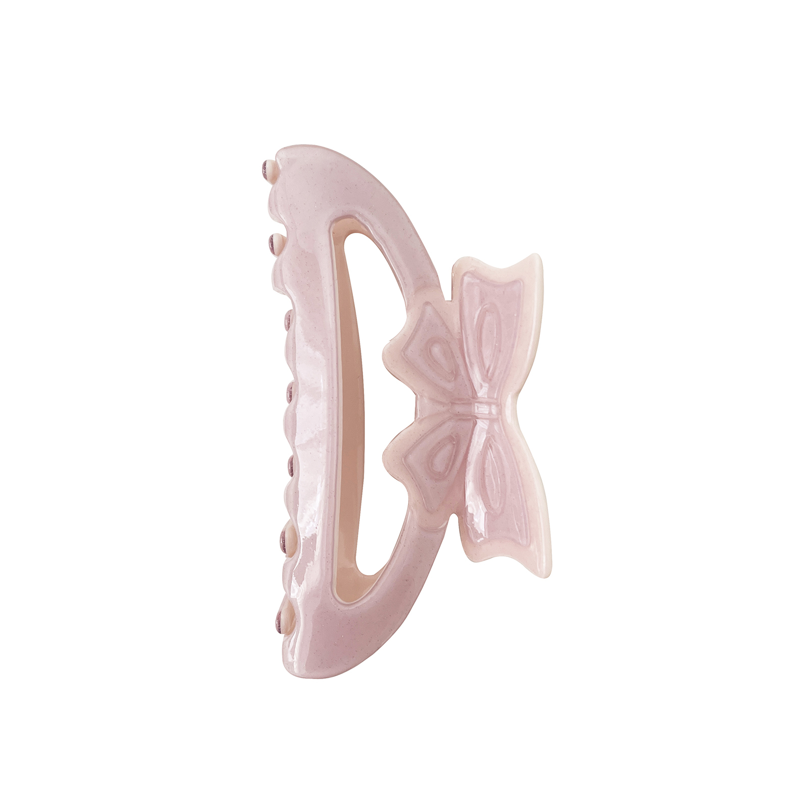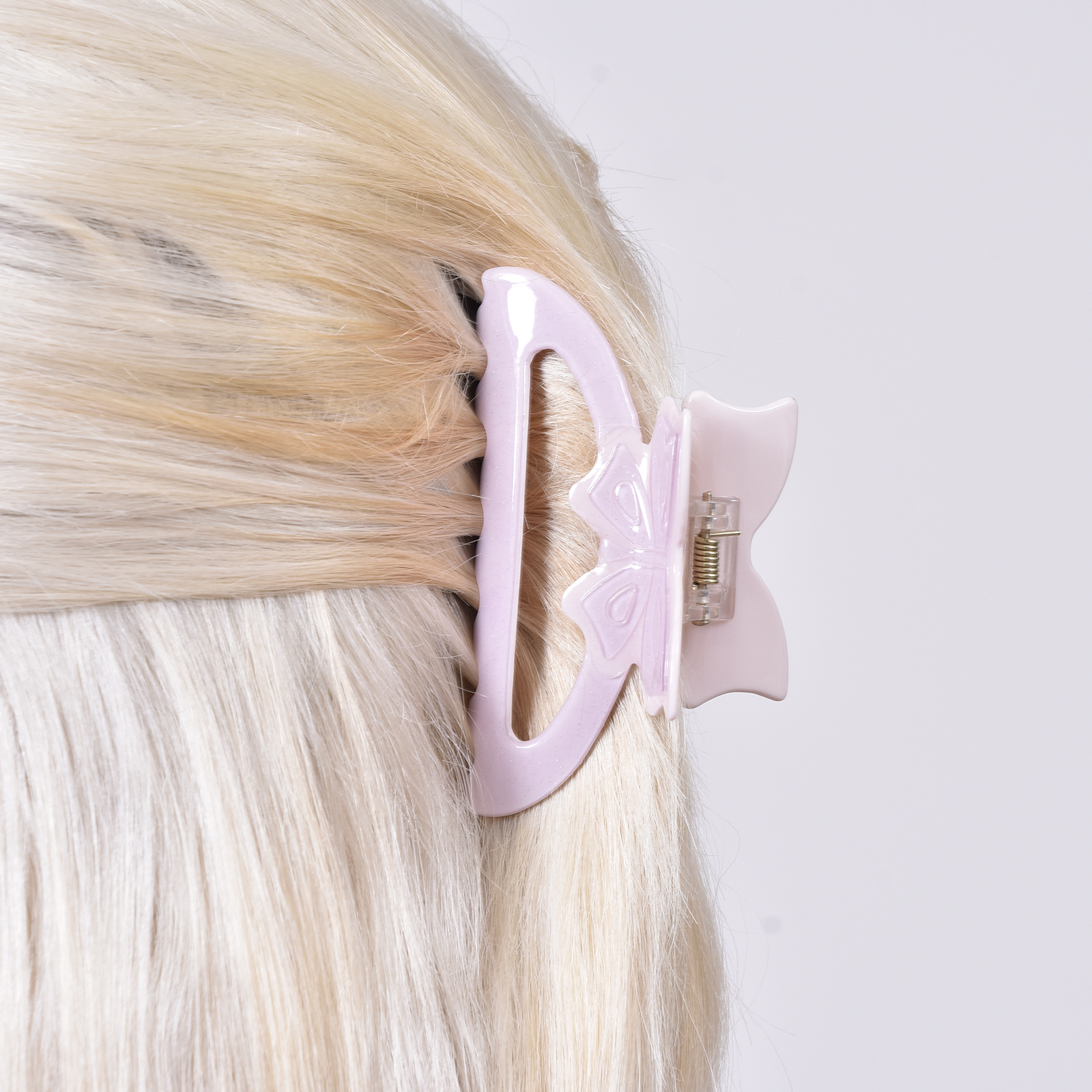 Hair bows are for grown-ups too. Introducing Raya Bow Hair Claw - a chic and delightful hair cutie for bow lovers. This hair claw is made of acrylic with a light blush pink base colour. This claw is approximately 82mm in length and features one bow on each side of the claw. It offers a secure grasp of hair. Suitable for modern, retro, chic, feminine, girly, smart casual, casual, and everyday wear.