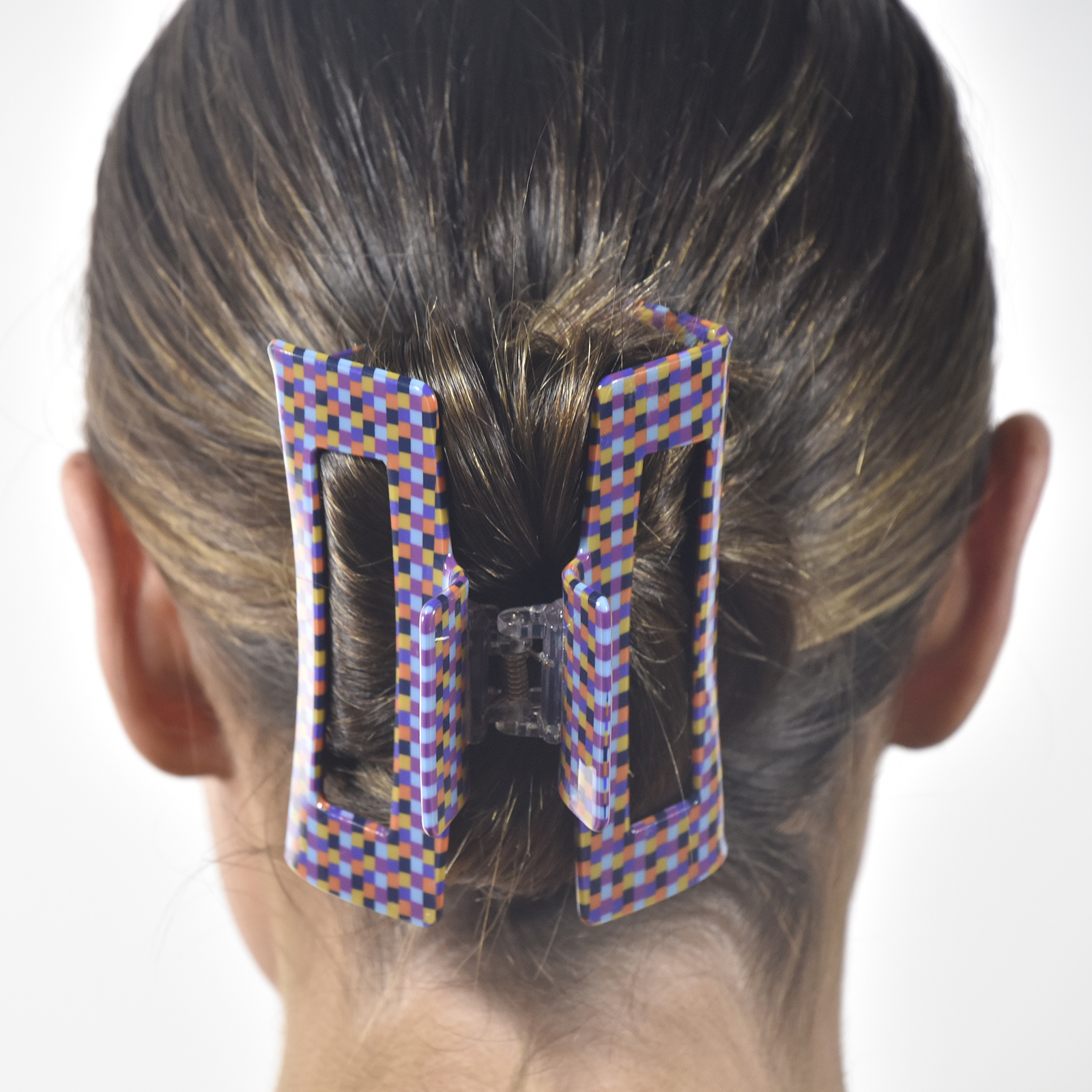 Bringing back the retro chicness. Introducing Raya Retro Checkered Hair Claw (Large) – a retro style hair claw style for women and girls of all styles. This style features a large sized rectangular hair claw perfect to hold your hair in a bun or any other clip-on style. It has a vibrant checkered pattern that makes it fun and bright for styling. A statement hair claw that makes everyday styling effortless and delightful.