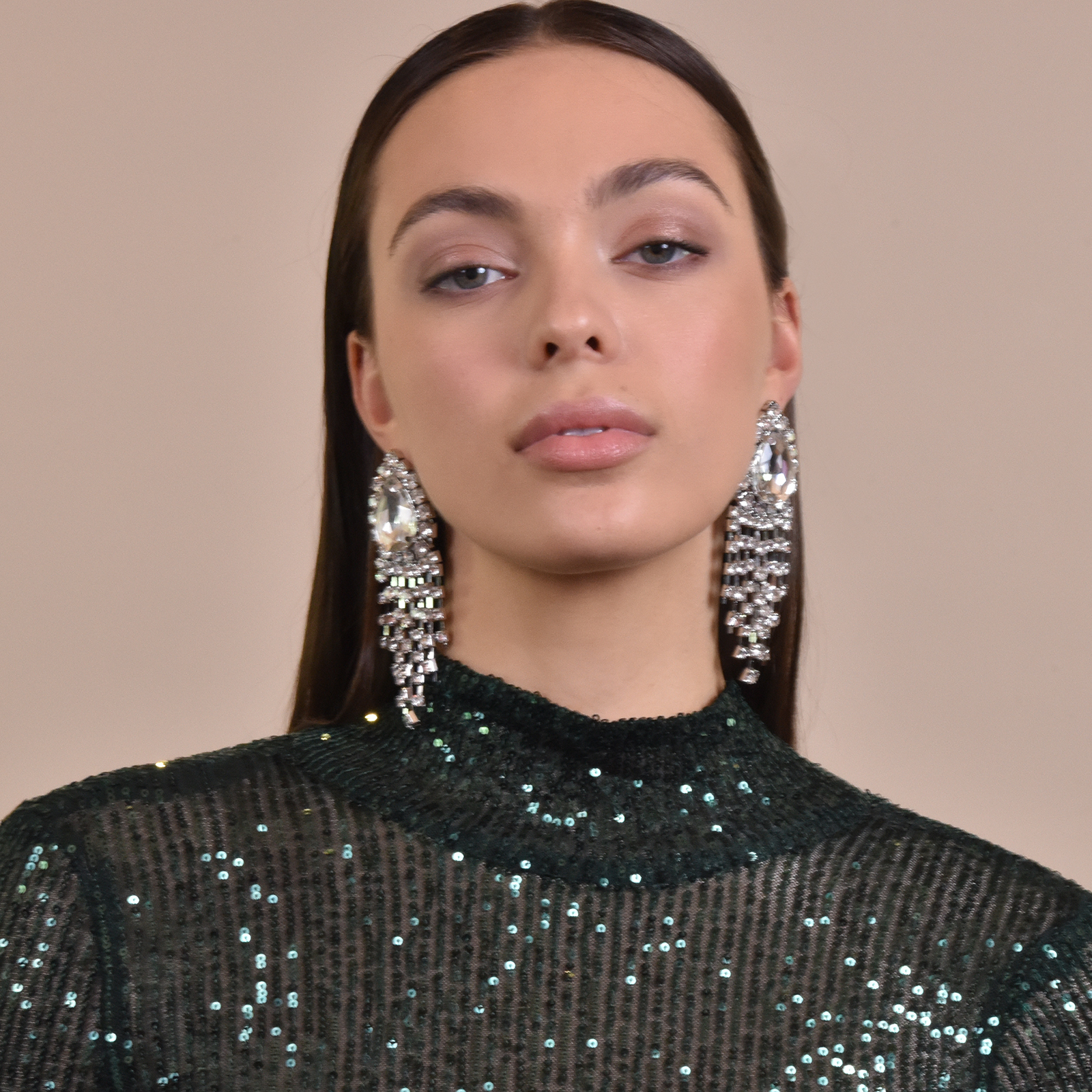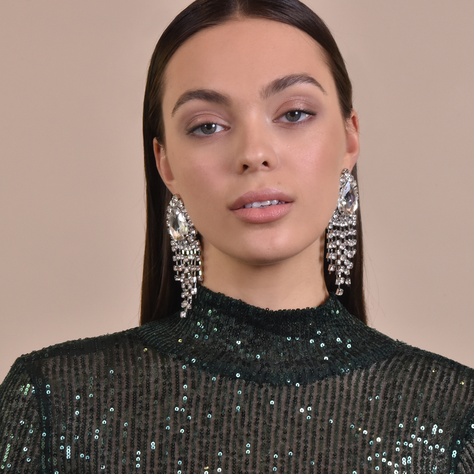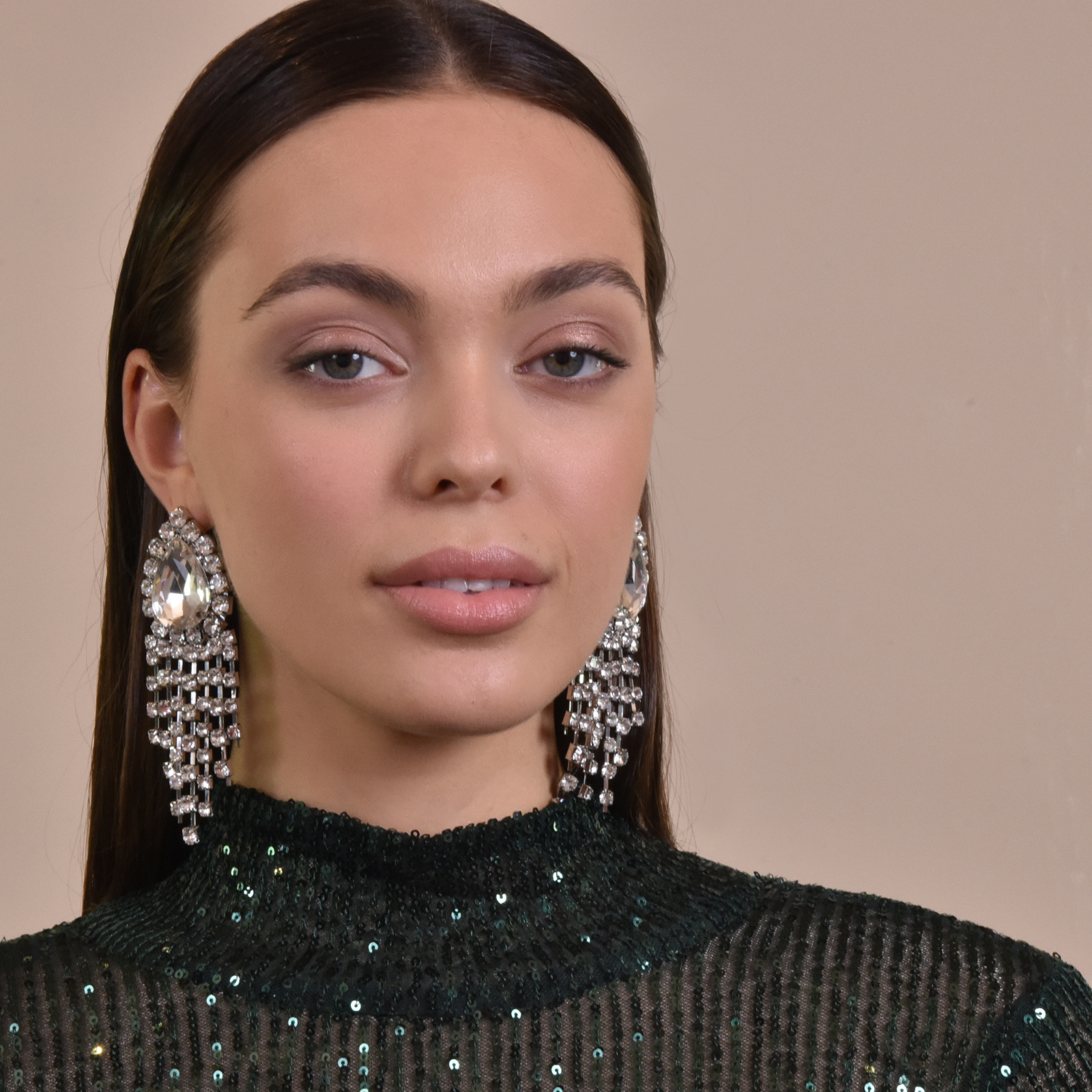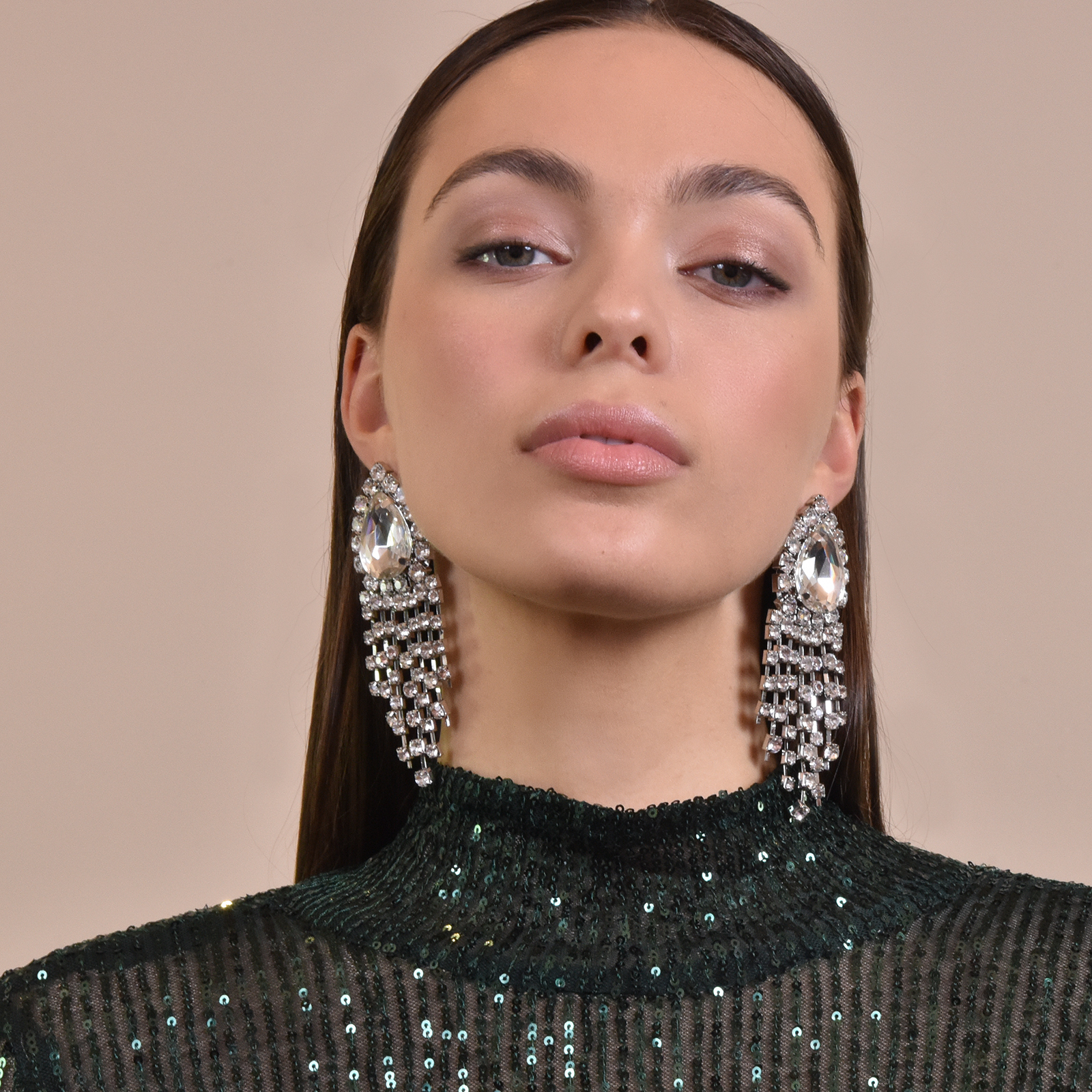 Be bold and italic and never regular! Rayne Crystal Diamante Earrings Silver are another iconic rhinestone design speaking of high fashion. This design features eye-catching diamante studs with shimmering crystal-encrusted diamante tassel strings, allowing you to express your femininity in a bold and elegant way. This design is crafted in environmentally friendly stainless steel (nickel free) with silver plated metal strings. Perfect for formal, semi-formal, dressy, racing, fashion events and more. Available for both pierced and non-pierced ears and available in gold.