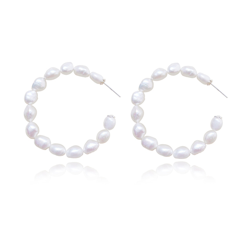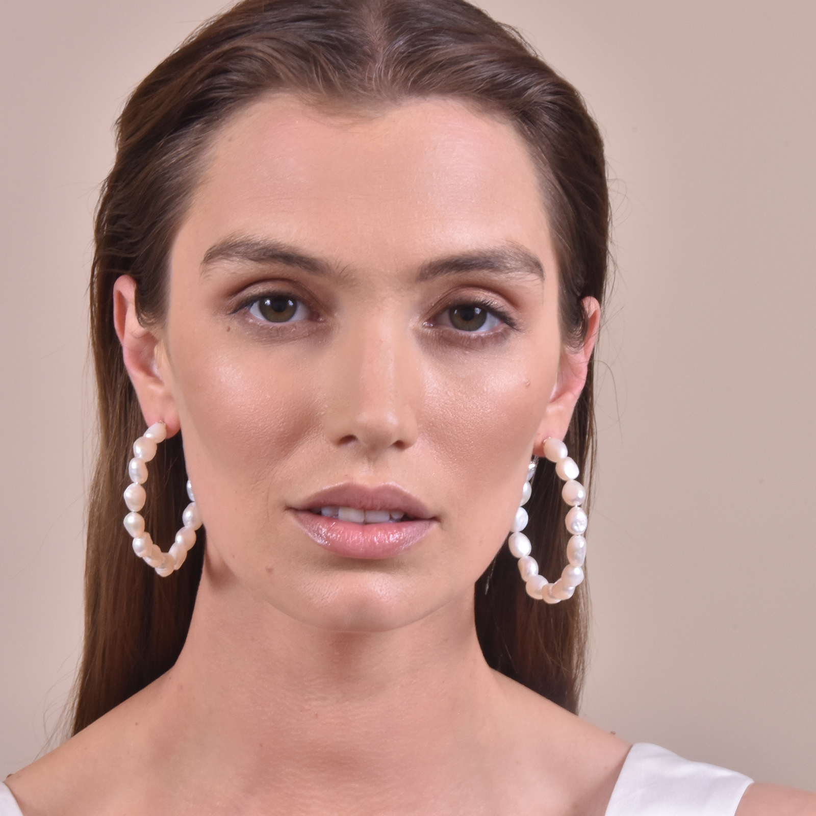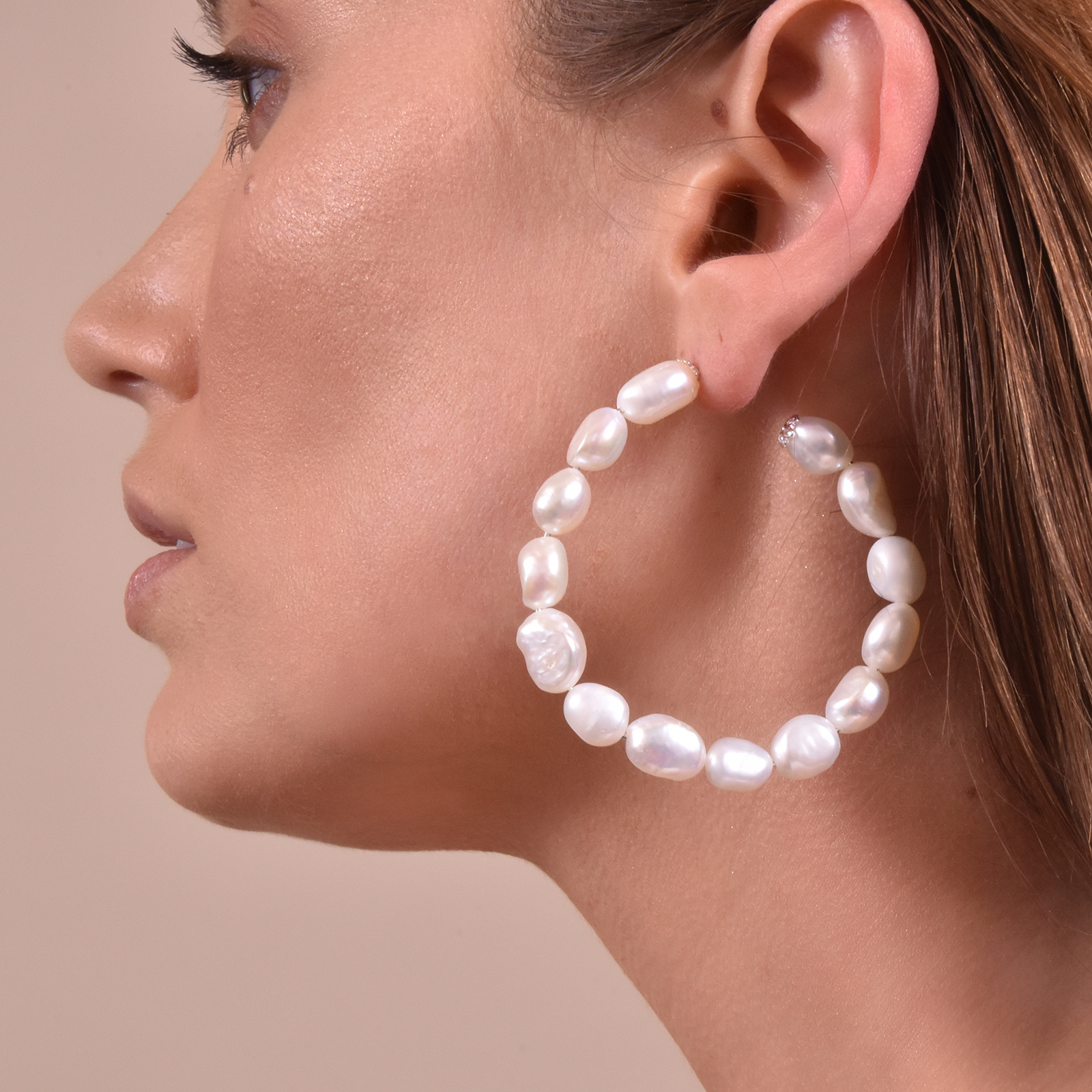 Embracing pearl elegance with a daring extravagance. Introducing Regina Oversized Frehswater Pearl Hoop Earrings — a handcrafted natural pearl beauty featuring Western Australian freshwater pearls. The metal threading the pearls is crafted in fine sterling silver. The ends of the pearl hoop also feature finely crafted little flowers in sterling silver, adding an intricate detail to the whole piece. An enduring, timeless and upper class ear love for modern, vintage, feminine, bridal, wedding, formal, semi-formal, dressy, coastal, function, runway, creative styling and more. Hypoallergenic, nickel, cadmium and lead free.