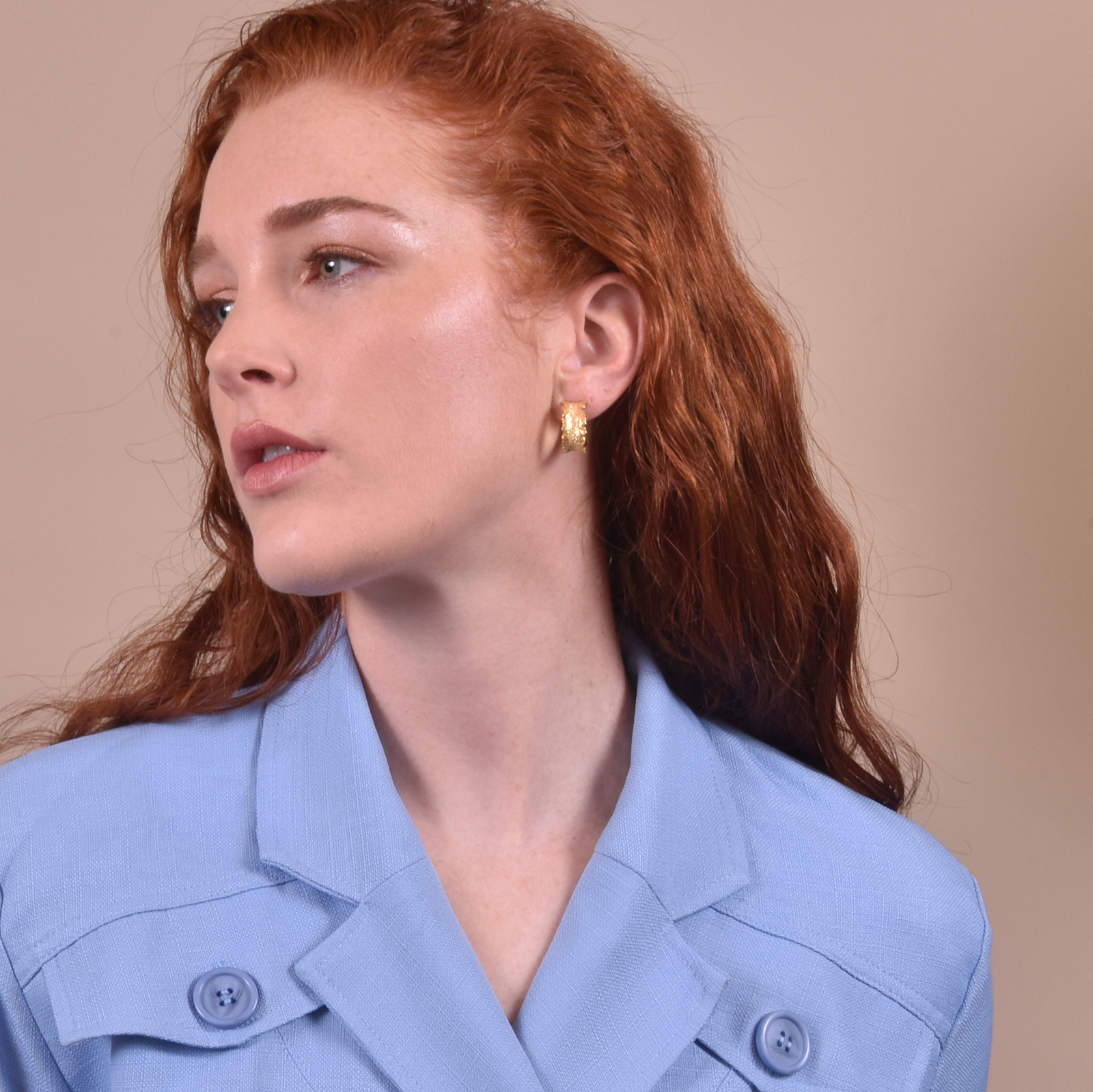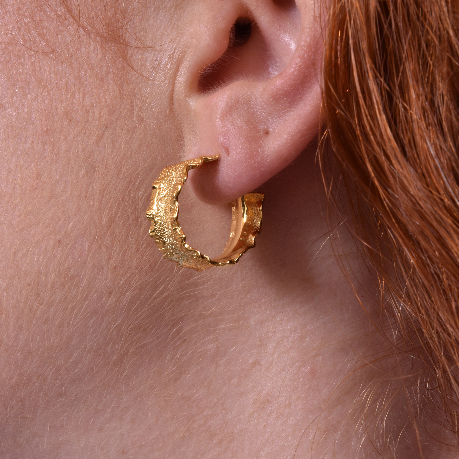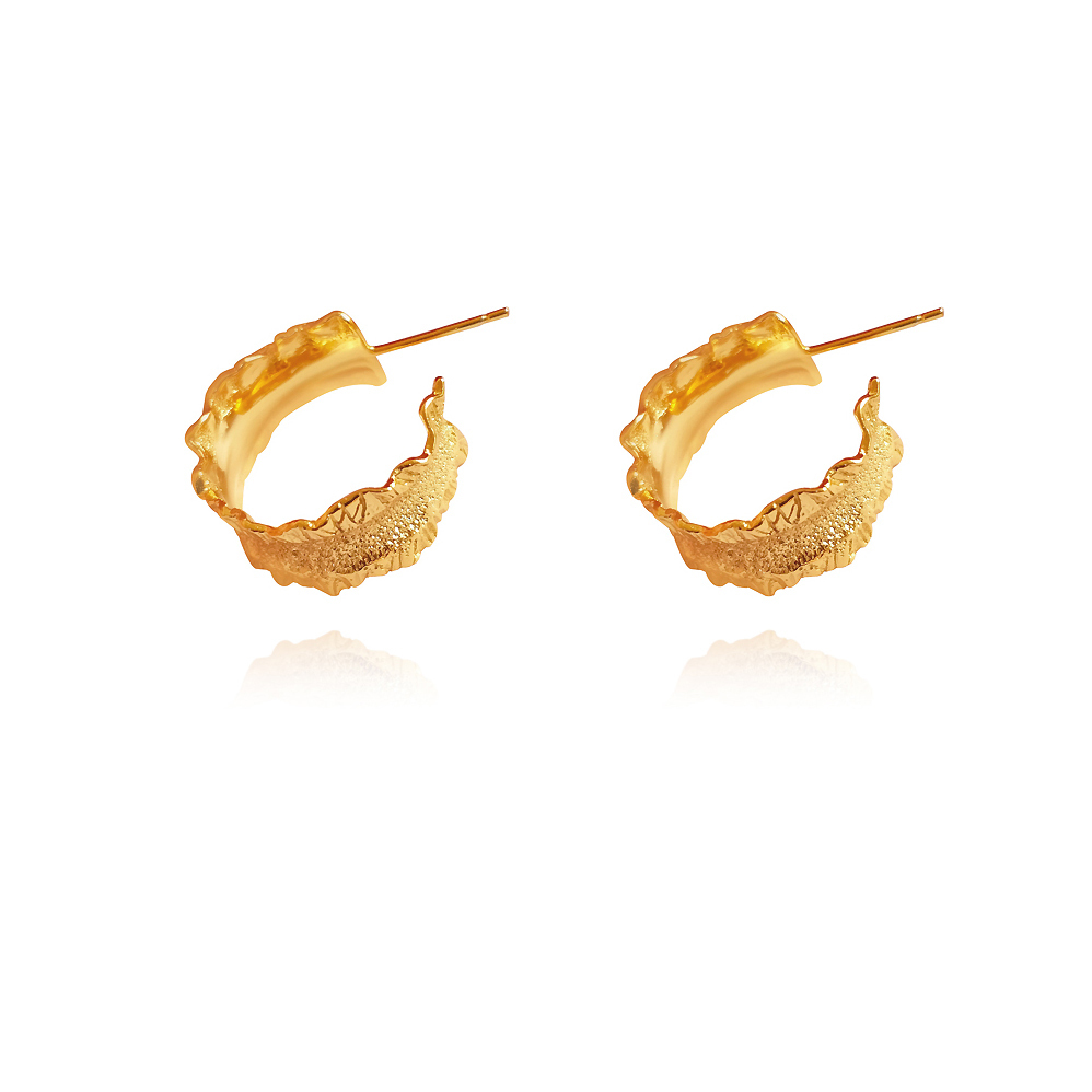 Classic gold hoops get texture-rich, introducing Remi Gold Vermeil Textured Earrings - a contemporary and detail-rich design bringing traditional hoop earring style to a new level. This style is crafted in solid sterling silver with quality 18K gold plating, giving the earrings a rich bright gold shine that is also tarnish resistant. The authentic artisan textures also remark your individuality and unique fashion taste. Perfect for smart casual, modern, artsy, creative, punk, minimalist, semi-formal, and formal occasions. 100% nickel, cadmium and lead free