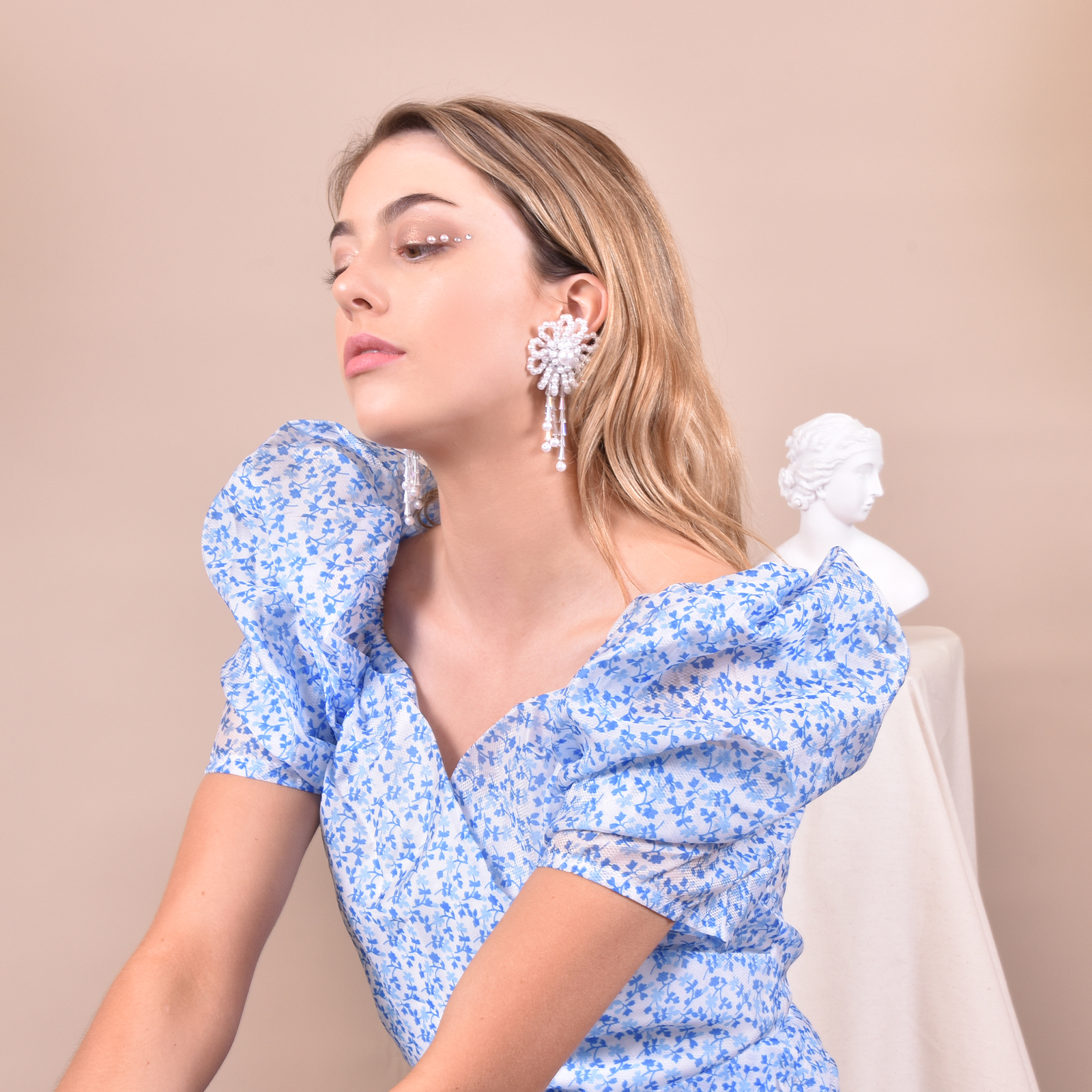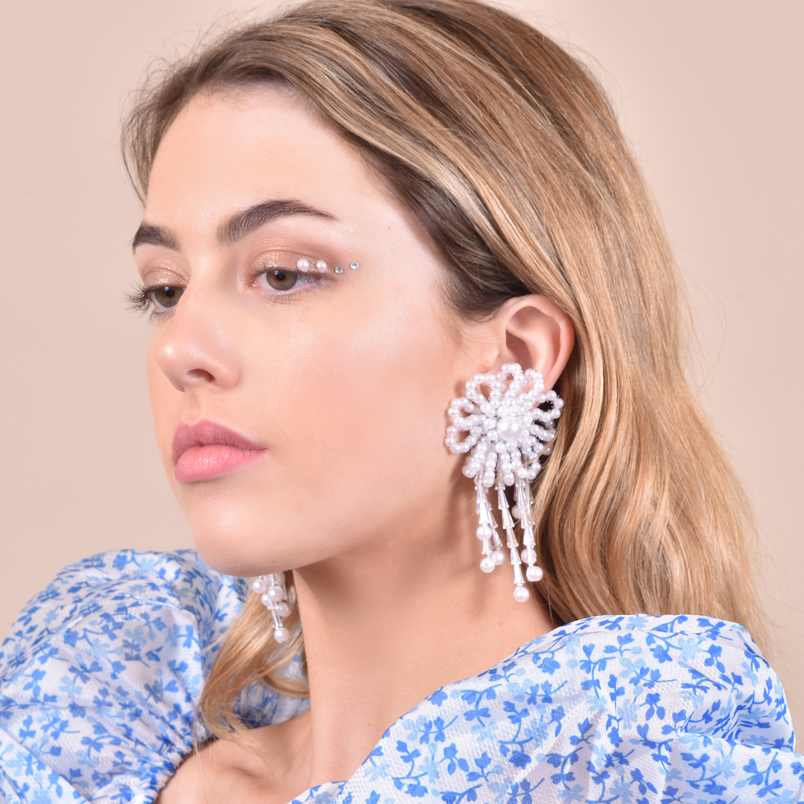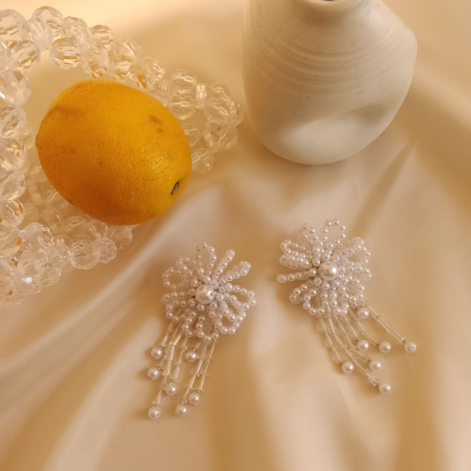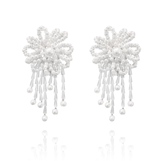 Romantic by heart, introducing Romantic By Heart Earrings - a vintage, pearly and girly design featuring pearl beads in floral shape and tassel drops. Add an extra luxurious and feminine vibes made so much easier for your up-styling. Perfect for wedding, bridal showers, dressy, racing, formal and semi-formal occasions. Sterling silver earring posts. Available for both pierced and non-pierced ears.