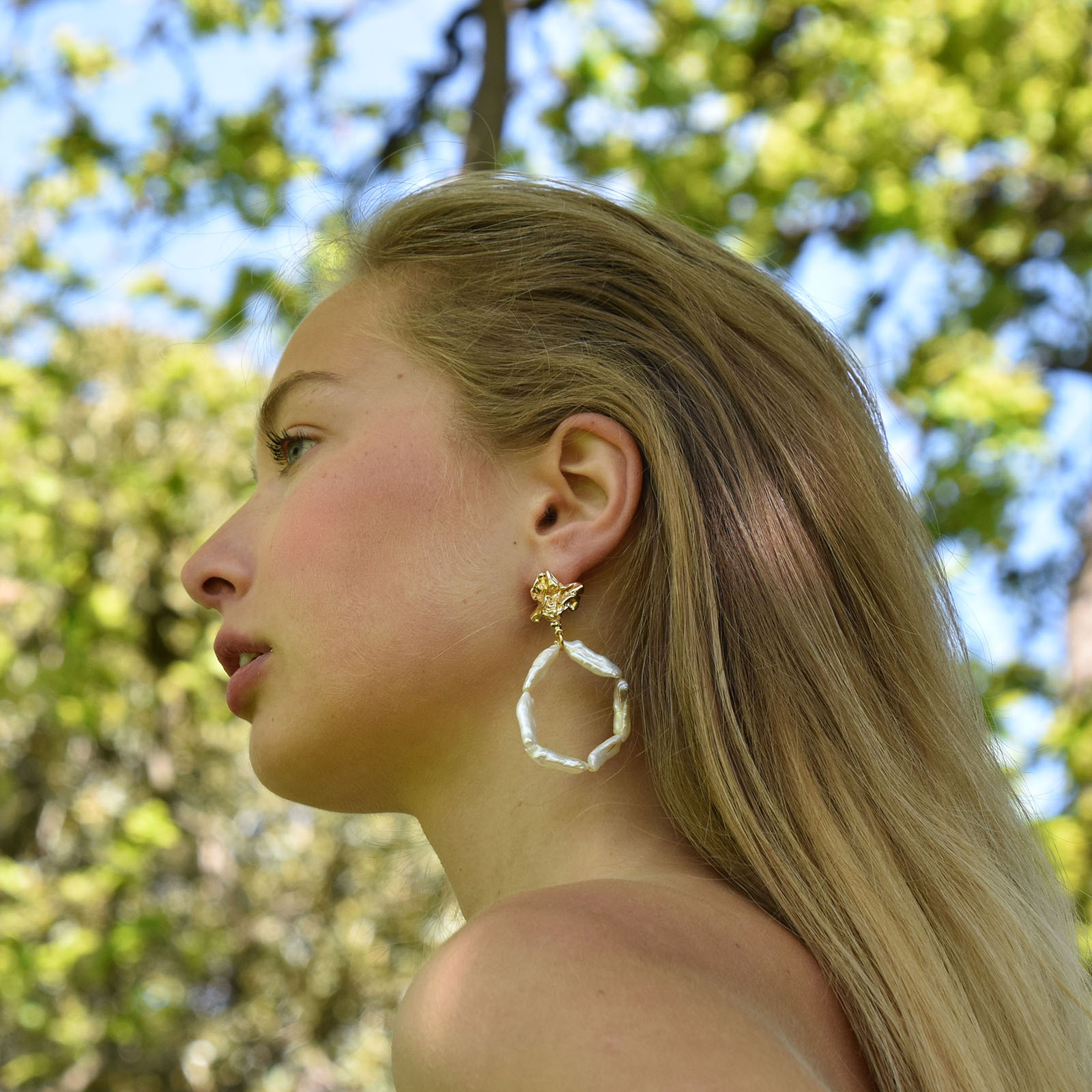 Bring freshwater pearl hoops to another level, introducing Rosalyn Coastal Devine Pearl Hoop Earrings - a unique design blending irregularity, metal textures and natural pearl textures into one piece. Handcrafted using natural freshwater pearls, the beauty lies in the authentic textures and its originality. Perfect for coastal, wedding, bridal, runway, magazine styling, dressy, racing and special events. Available for both pierced and non-pierced ears.
