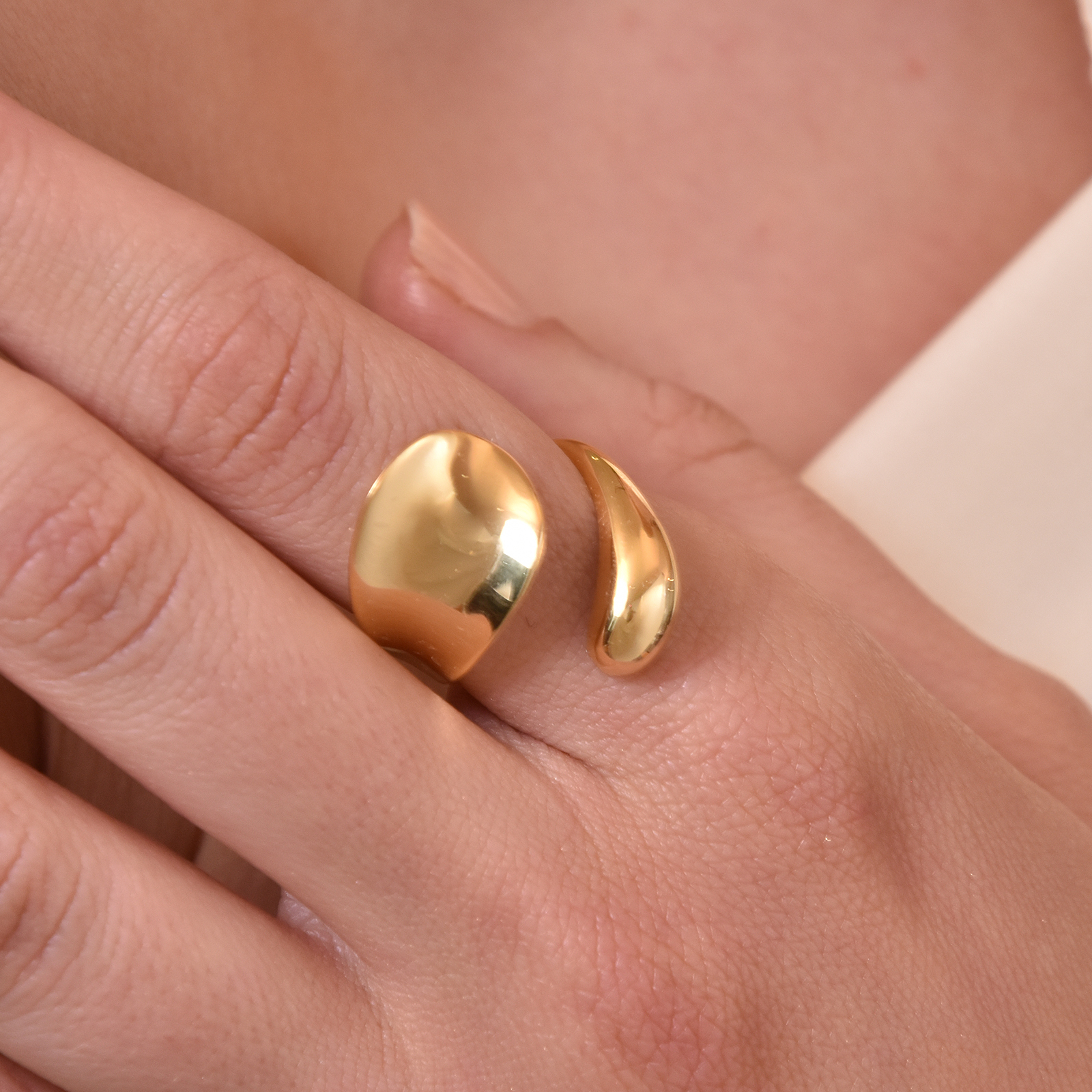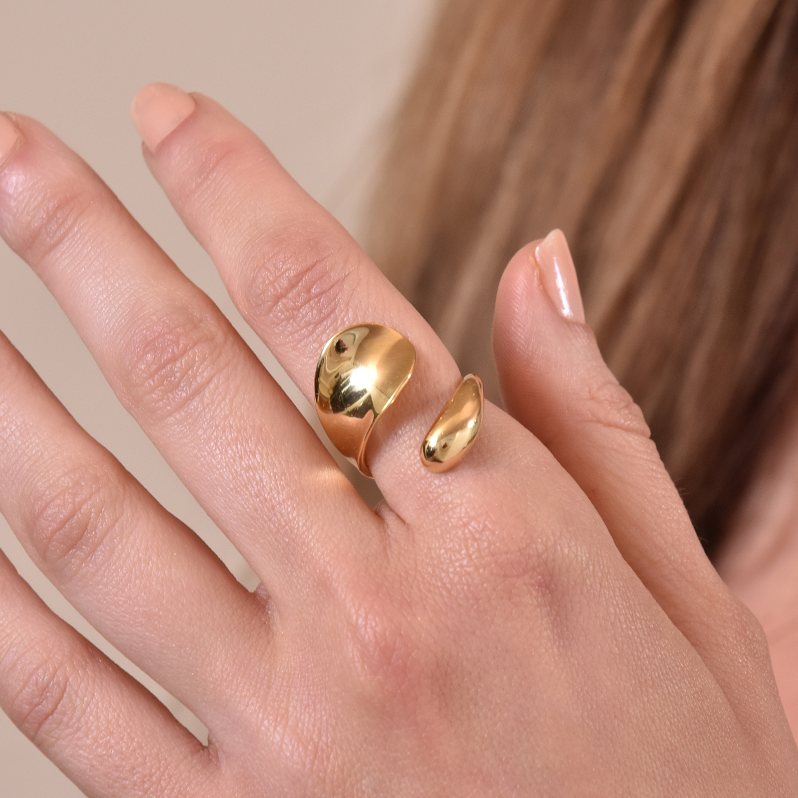 Contemporary, luxurious and extraordinary. Introducing Sage Artisan Gold Vermeil Open Ring - a modern artisan design blending a refined curve flow with boldness. This design is ethically crafted in solid sterling silver with a high quality 2.5 Micron thick layer of 18K yellow gold plating. The surface is smoothly polished with a mirror-like finish, enriching the luxurious gold shine with a modern and sleek vibe. What makes it sweeter is that this design is fully adjustable to suit different finger size. Wear it on any finger by gently adjusting the open cut to find the best fit. Perfect for modern, creative, artsy, minimalist, high fashion, retro, punk, dressy, smart casual and more. Hypoallergenic, nickel, cadmium and lead free.