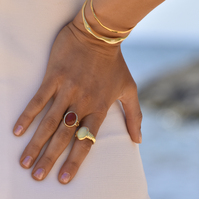 Opal luxury with a modern interpretation. Introducing Samara Luxury Solid Opal Open Ring - an artisan handcrafted luxury style opal beauty with a flexible fitting. This design features a precious natural Ethiopian 6 carat solid opal, embedded in a classic oval setting with a French styled curved open ring band. This ring is made in solid sterling silver with 2.5 microns of 18k gold plating (to Gold Vermeil Jewellery Standards). With 5 times hand polish, it brings out the adorable gold shine that is rich and noble. This ring can be manually adjusted for your ideal fit. Watch the brilliant hues and colours dance as the solid opal catches the sunlight. Perfect for opal lovers who appreciate high quality and style. Also suitable for unisex wear. Hypoallergenic, nickel, cadmium and lead free.