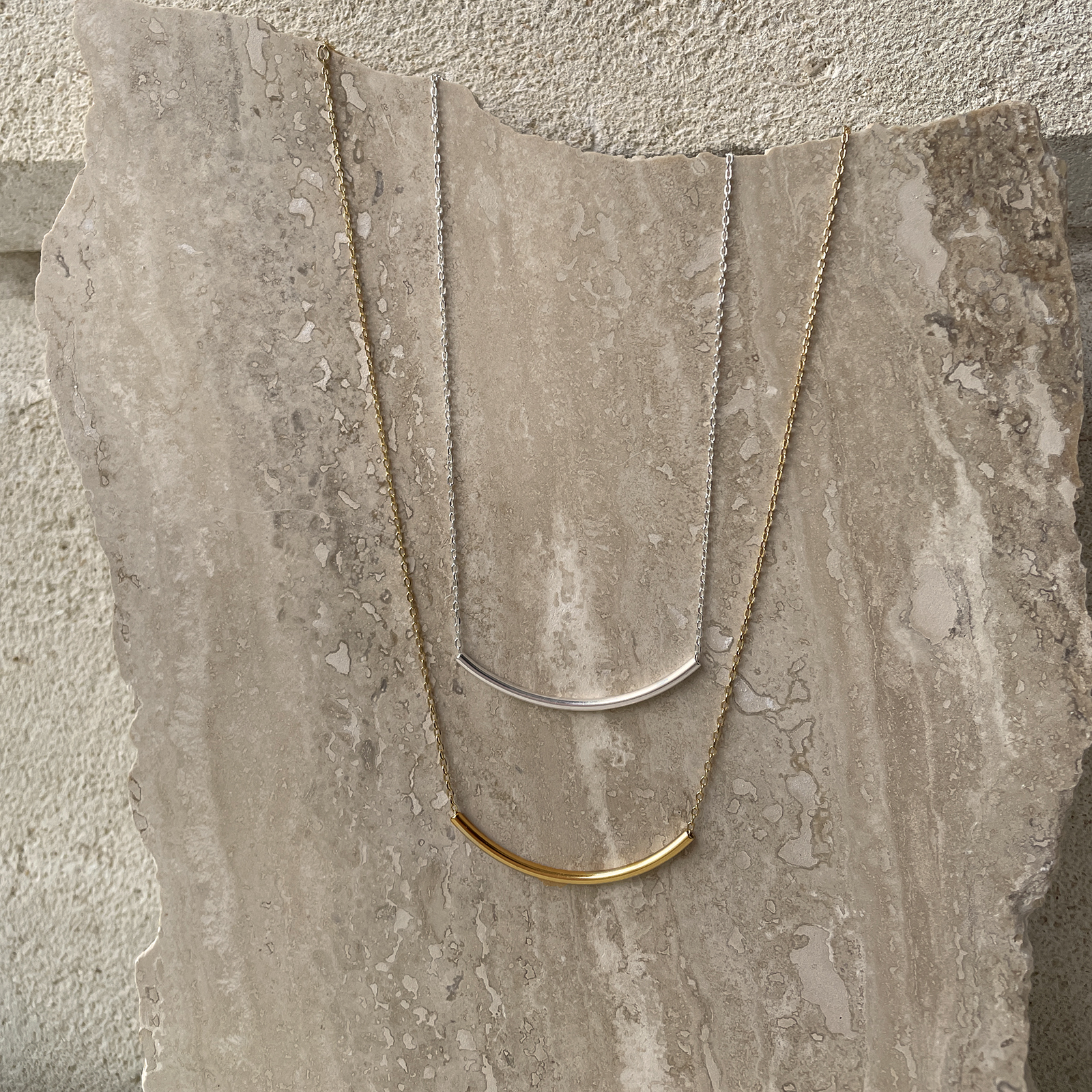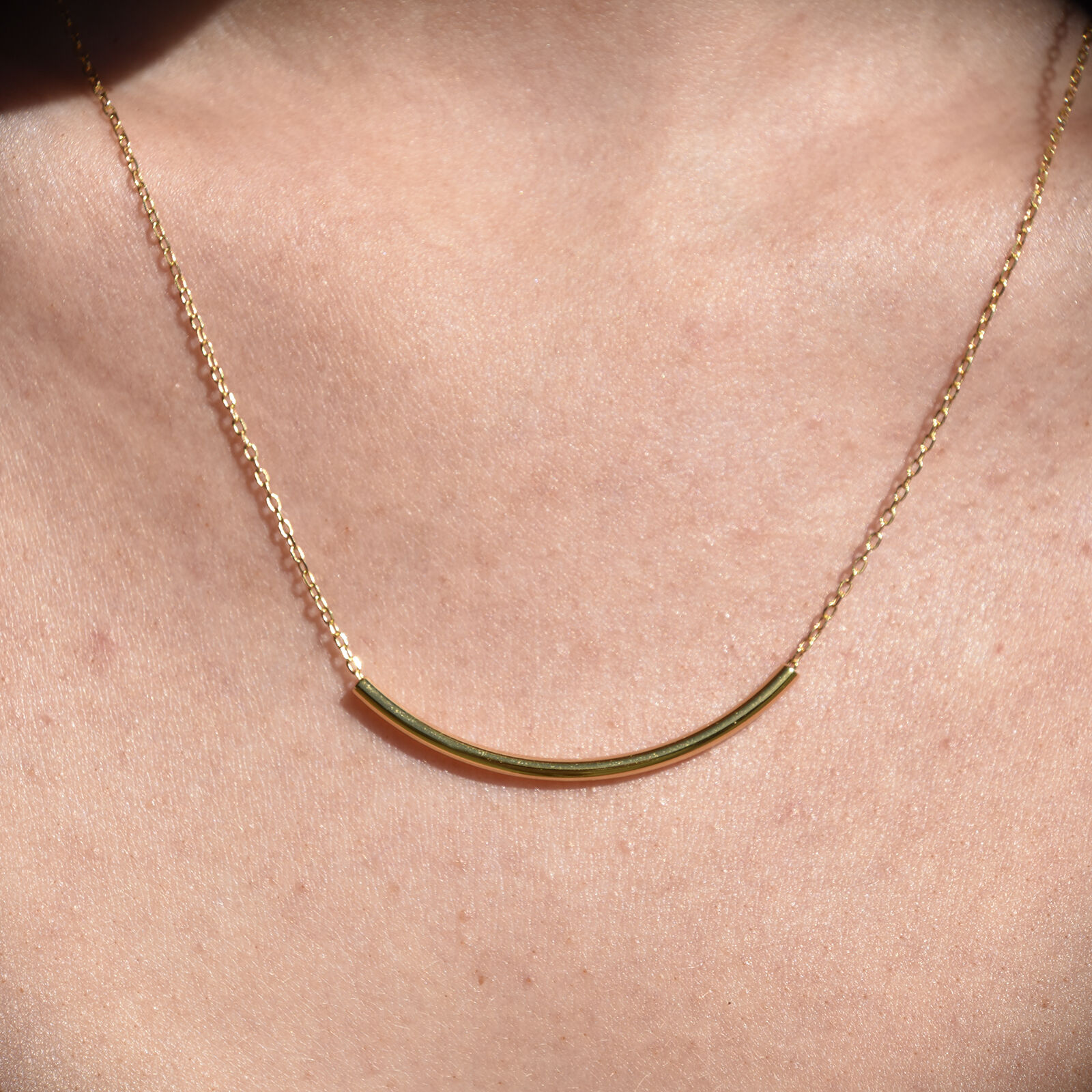 Curves: the loveliest distance between two points. Introducing Sebier Curved Bar Pendant Necklace (Gold) - a contemporary neckpiece for a feminine and timeless touch. This design features a fine and smoothly polished curved bar pendant threaded through a standard gold chain. It is 43cm long including a 5cm adjustable link for your ideal fit. This neckpiece is made in sterling silver and 18K gold plating for hypoallergenic wear. Suitable for women of all ages and makes a versatile fit for all personal styles. Perfect for layering and everyday wear. Hypoallergenic, nickel, lead, and cadmium free. Available in gold or silver.