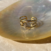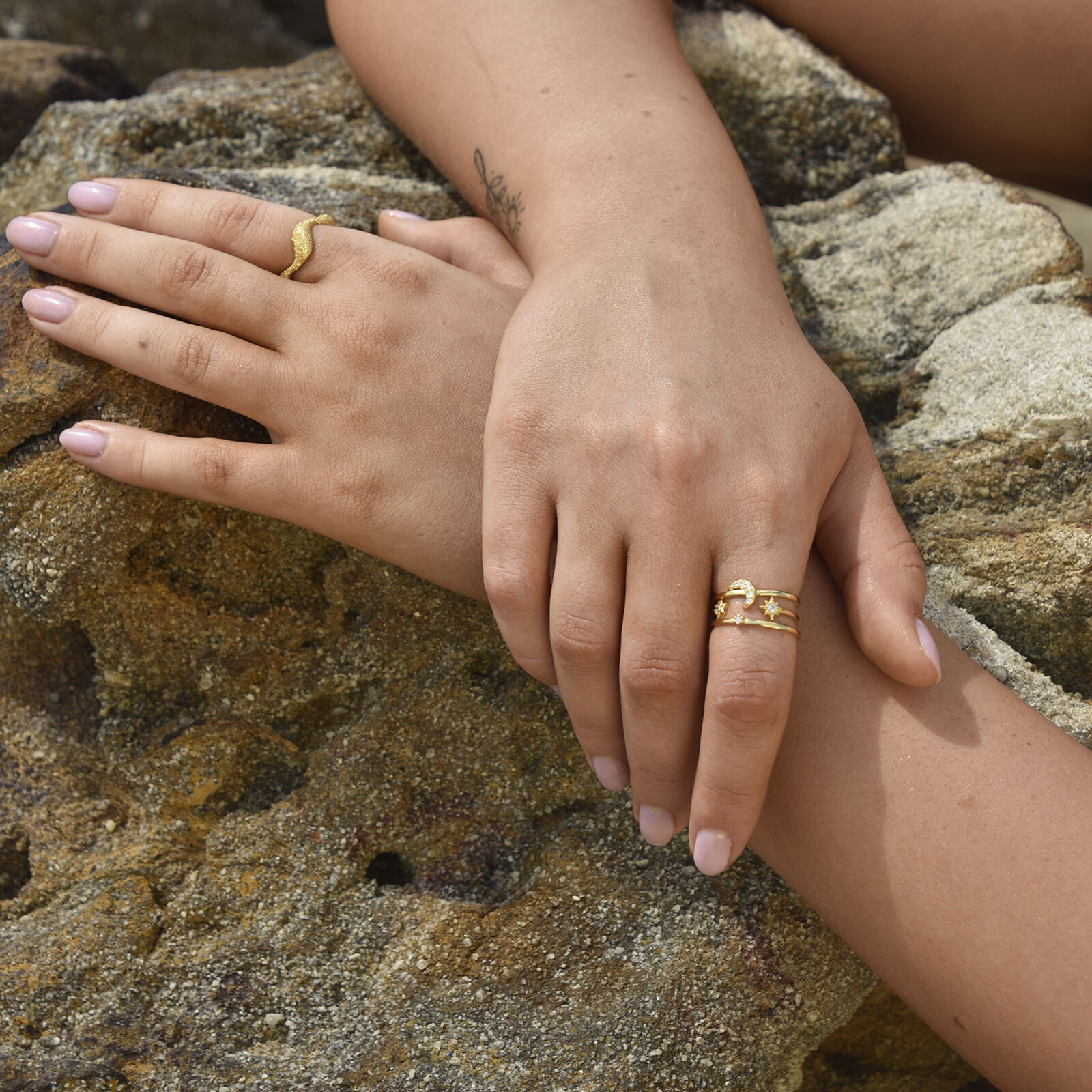 Fly me to the moon and let me play among the stars. Introducing Seraphine Celestial Tri-line Open Ring (Gold) - an artisan fine layered open ring of delicate and unique beauty. This design features a tri-line ring band, each featuring celestial elements of stars and moon embellished with Austrian zircons, embodying both softness and strength. This ring is made in solid sterling silver with 18ct gold plating for hypoallergenic and enduring wear. Suitable for modern, contemporary, chic, feminine, smart casual, casual, ring layering, everyday style and more. Hypoallergenic, nickel, lead, and cadmium free. Available in 18ct gold or silver.