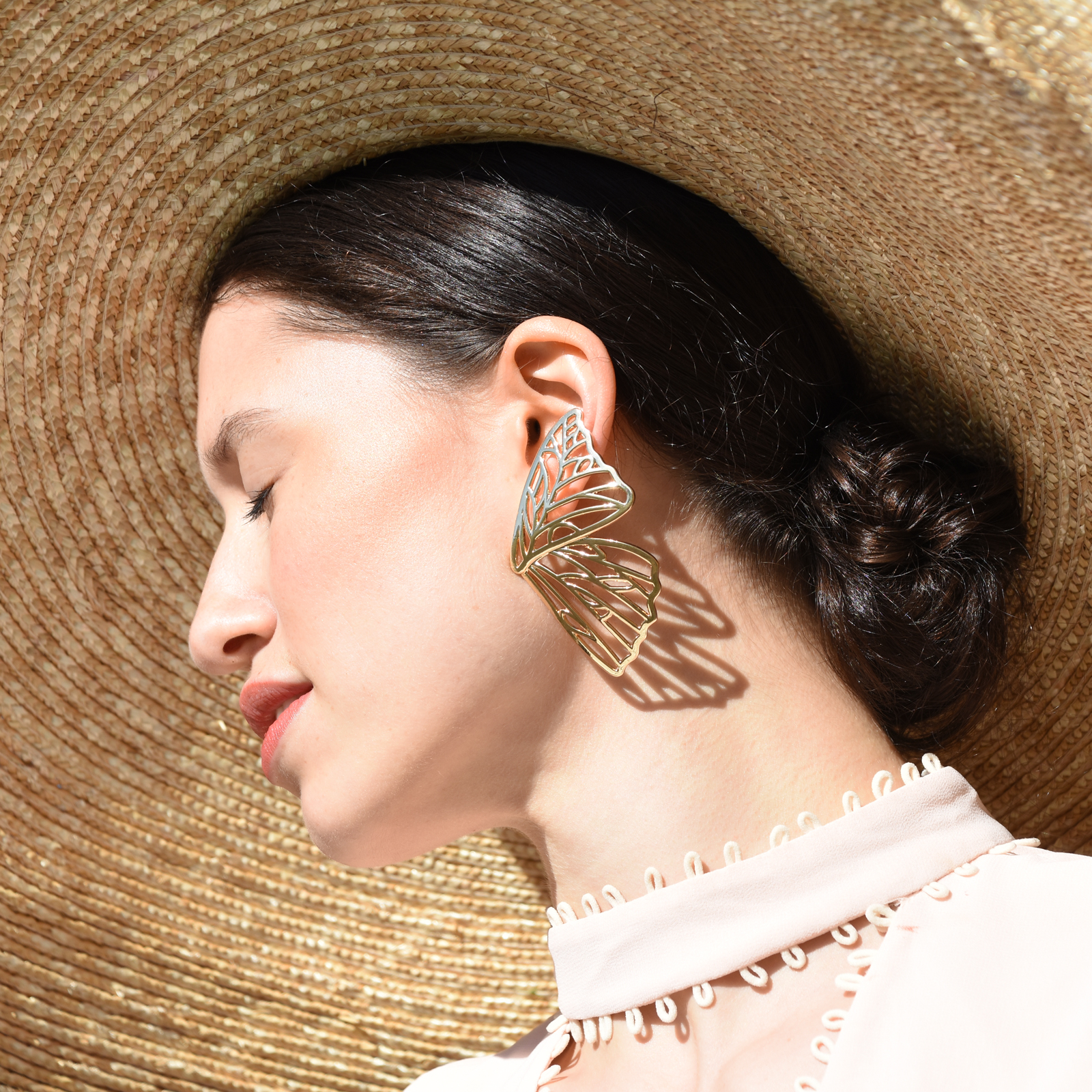A 'flying' statement that is unique, bold and unforgettable - introducing Skyla Golden Butterfly Earrings - a contemporary and eye-catching statement to add an exclamation mark to your styling. This extravagant and unique design is crafted in environmentally friendly brass (nickel free) with 18K gold plating. The earrings also come with sterling silver earring posts for hypoallergenic wear. Showcase your feminine presence and voices your 'dare to wear' attitude. Perfect for modern, creative, dressy, semi-casual, fashion events and more.