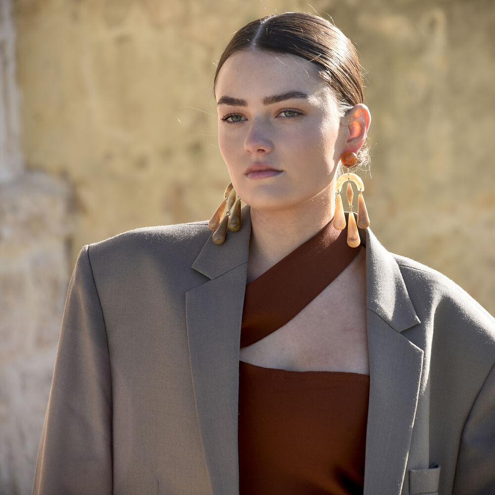 When soft ivory and neutral shades meet bold design. Introducing Soft Echo Resin Drop Earrings - a chic and contemporary wearable art with balanced weight. This design features layered resin geometric drops in an ivory brown shade with the top round resin stud in a warm amber shade. Neutral, versatile for styling and bold in a layered form, these ear pieces carry warmth and a playful charm elevating everyday style.