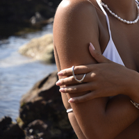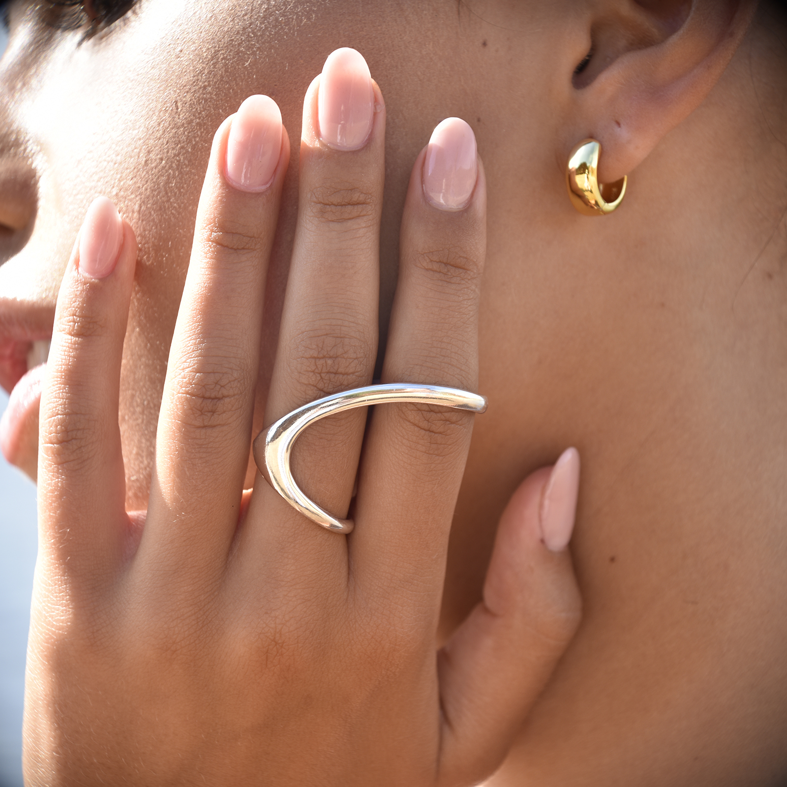 A dance of simplicity and extravagance. Introducing Solana Art Deco Finger Lock Open Ring (Silver) - a line art inspired contemporary finger art that makes eyes stare. This ring is made of a continuous solid line flowing around one finger first and then around two fingers. This artsy design allows you to choose and decide which two fingers to wear it. The ring is crafted in solid sterling silver with rhodium plating for enduring wear and an extra anti-tarnish protection. It is also smoothly polished to a gorgeous high shine. Due to the softness of solid sterling silver, the ring band can be easily adjusted manually for the best fit. Perfect for contemporary, artsy, creative styling, extravagant, statement, high fashion, dressy, smart casual, ring layering, casual style and more. Also suitable for unisex wear. Hypoallergenic, nickel, cadmium and lead free.