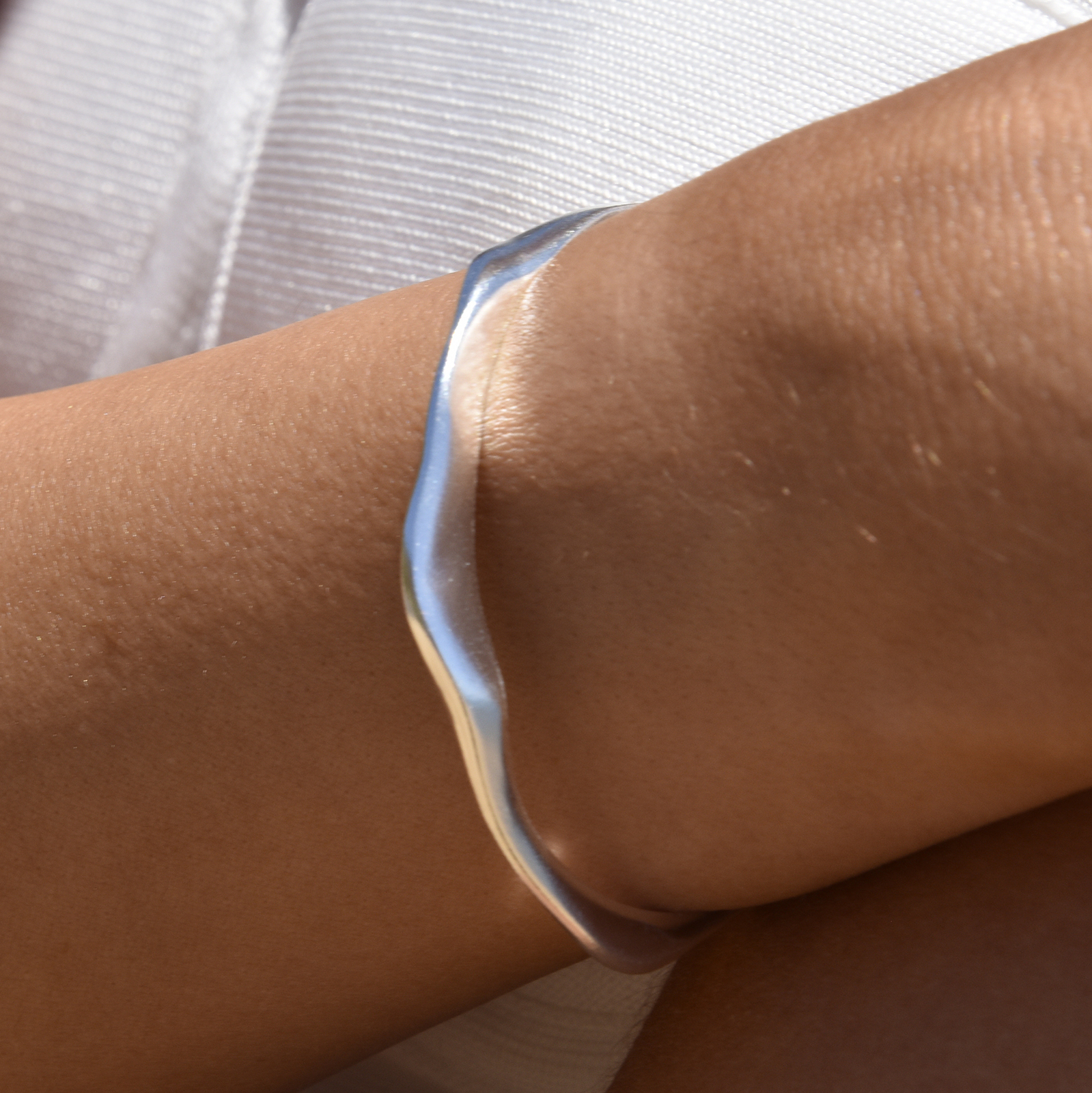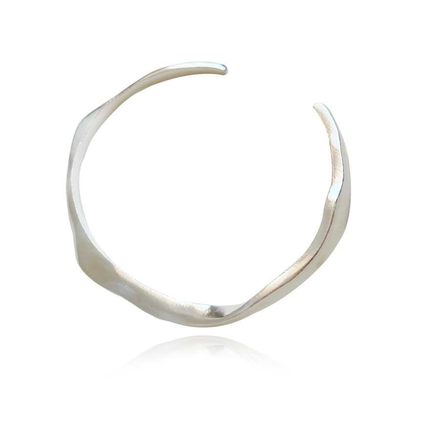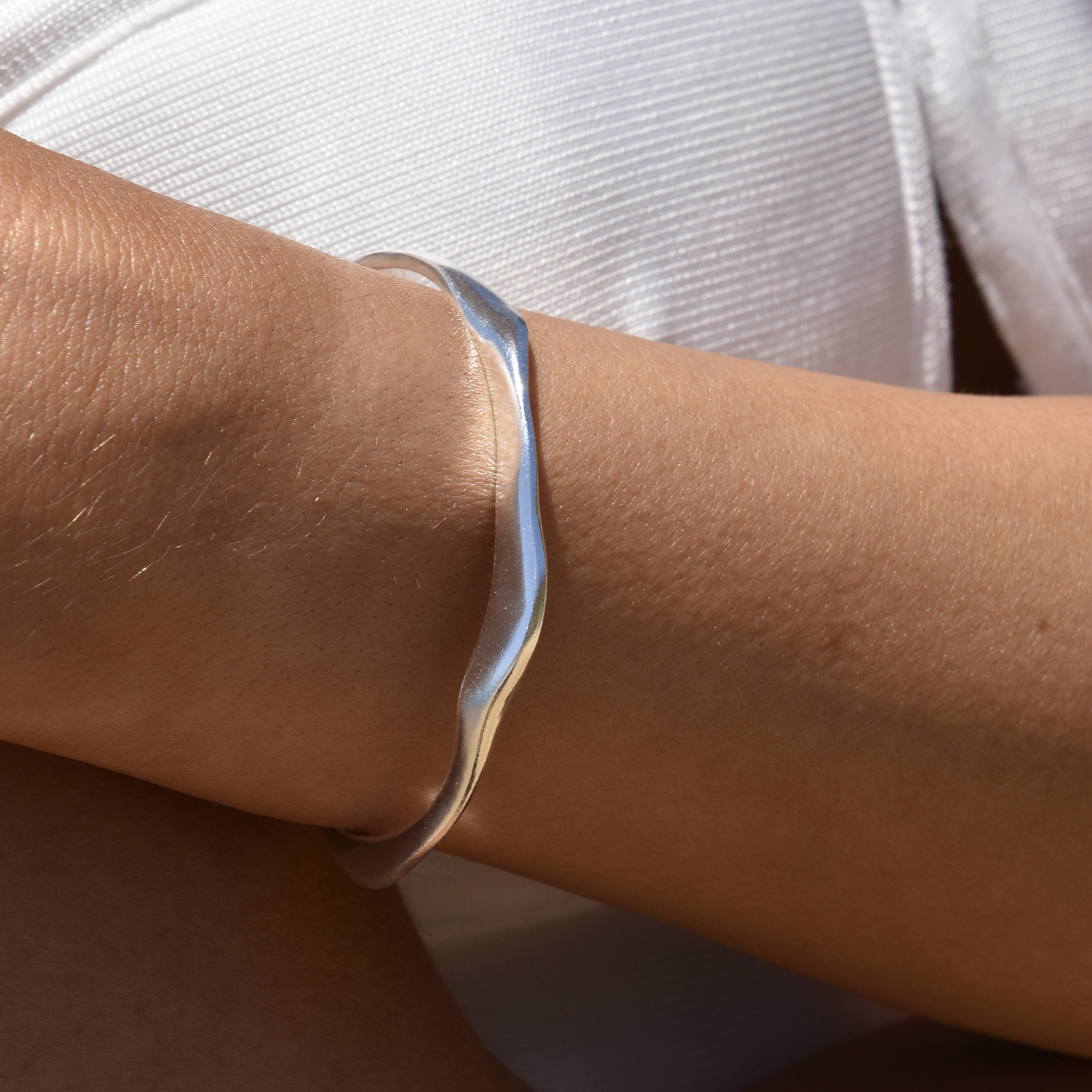 Glow with the flow. Introducing Solstice Artisan Solid Wavy Bangle (Silver) - a contemporary sculpture inspired open bangle artistically and ethically crafted to last a lifetime. This design features a solid wavy bangle in an abstract flow. It is crafted in solid sterling silver with brilliant white rhodium plating (anti-tarnishing) for hypoallergenic and durable wear, as well as a brighter silver shine. The bangle is smoothly polished with a luxurious gold shine that endures. Perfect for modern, artsy, minimalist, high fashion, smart causal, casual styles and more. Due to the softness of solid sterling silver, this bangle can be easily adjusted manually for the best fit. Great for a unique gift to those who appreciate high quality and styles. Hypoallergenic, nickel, cadmium and lead free.