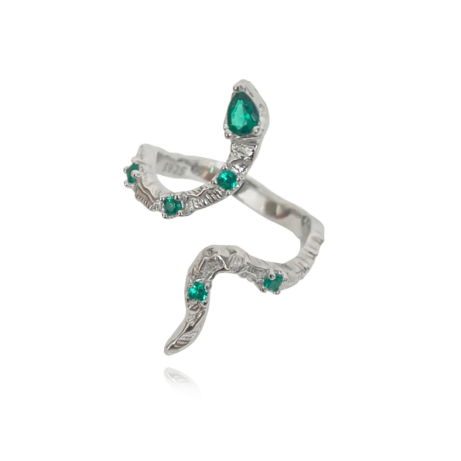 A winding chicness that is unique and uncompromising. Introducing Soriya Sculptural Serpent Open Ring - an artisan created artsy style finger beauty for style and fashion hunters who love something outside the norm. This design features a hand sculptured serpent-shaped ring band with a textured finish on the outer surface and a smooth high shine polish on the inner surface. The outer surface of the ring band is adorned with 5 Austrian green zircons with a deep emerald tone. The ring is crafted in solid sterling silver with rhodium plating for hypoallergenic wear and extra anti-tarnish protection. It is fully resizable. Perfect for artsy, creative, modern, chic, punk, ring layering, smart casual, casual styles and more. Hypoallergenic, nickel, lead, and cadmium free.