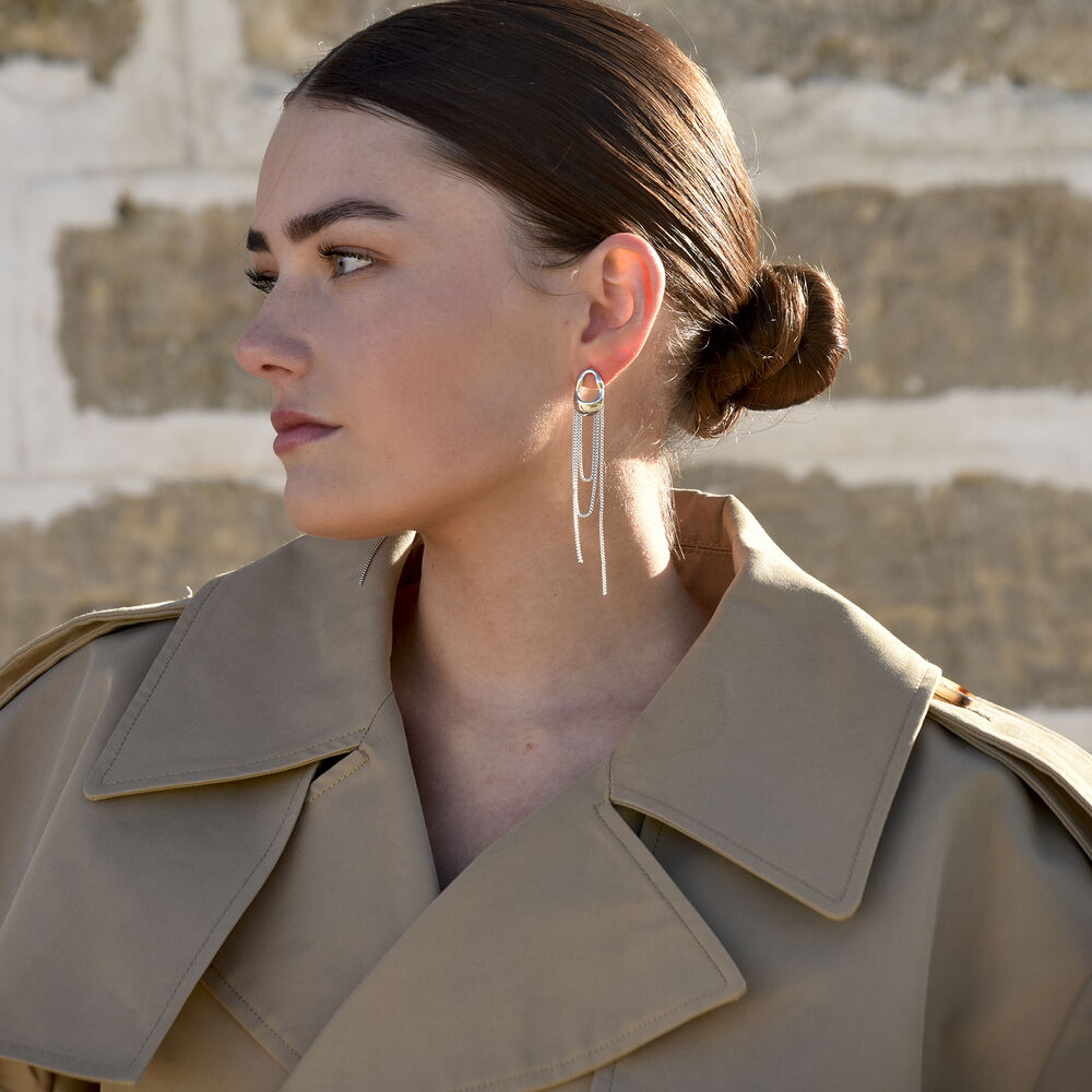 From subtle curves to dazzling drops. Introducing Stellar Drape Diamante Tassel Earrings (Silver) - a light ear statement combining architectural shape with a sparkling glamour. This design features a fluid metal top that flows seamlessly into sparkling diamante tassels. The earrings are made in environmentally friendly brass with silver plating. Lightweight yet bold, they are perfect for making a statement at parties, events, or everyday style upgrades. Available in 18ct gold plating or silver.