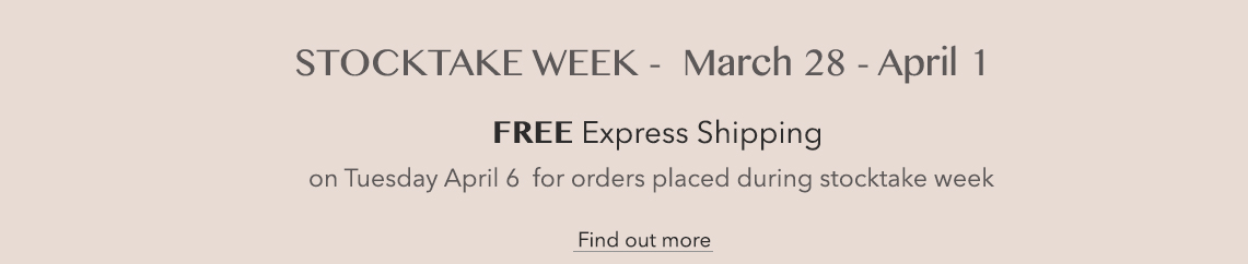 All orders (regardless of value) placed during stocktake period via our website will be shipped on Tuesday April 6 via Free Express Shipping.