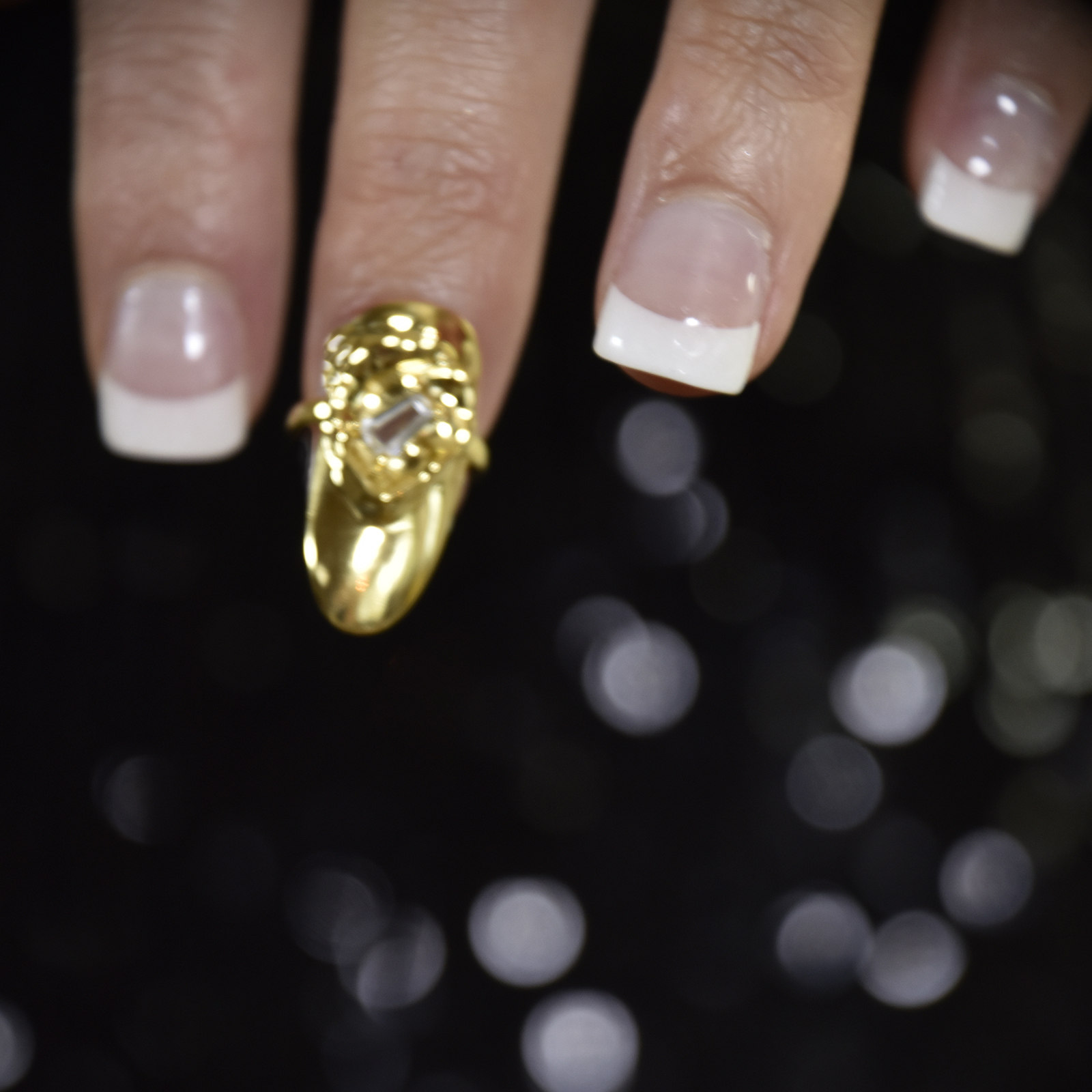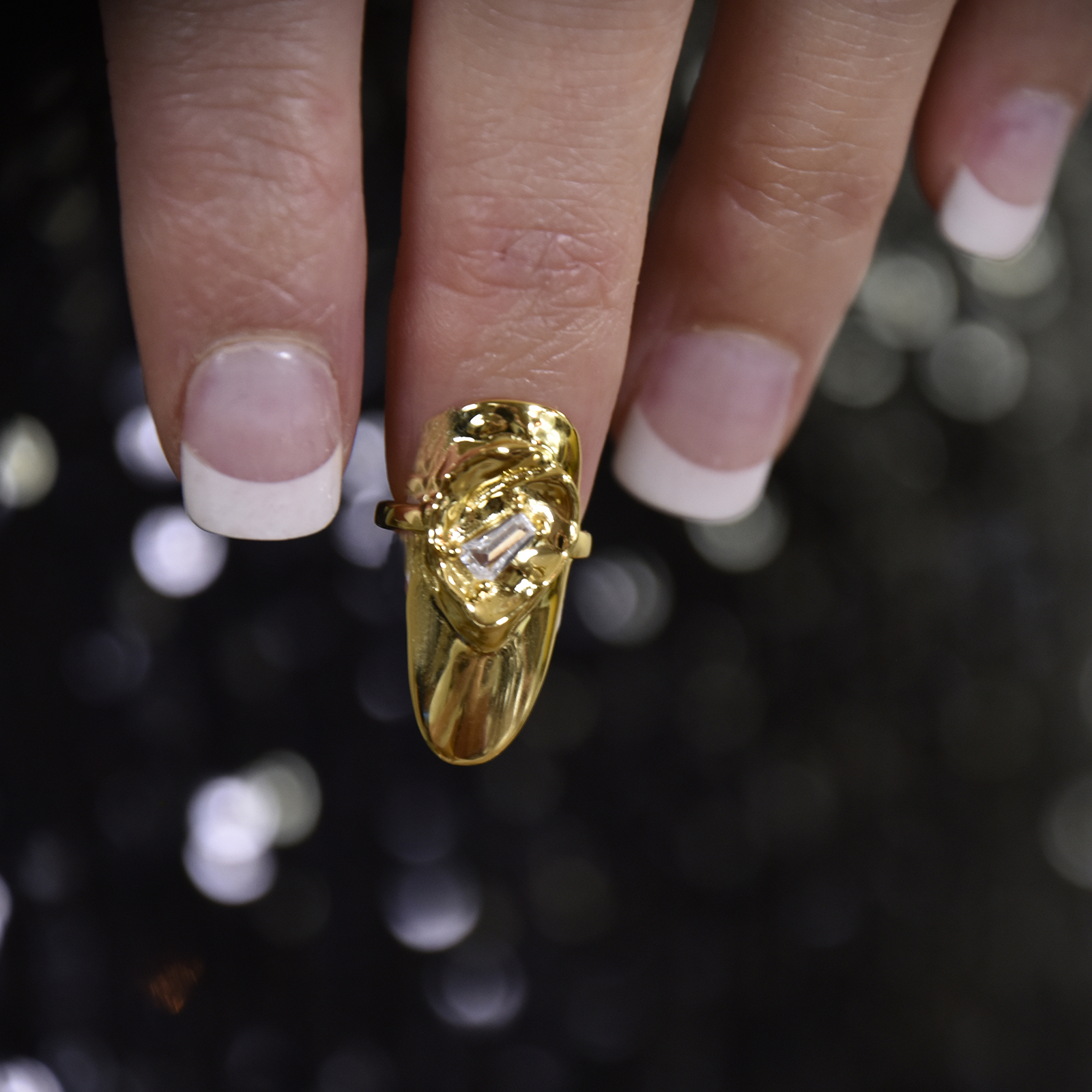 You are unique - be proud of it. Introducing Thelma Arsty Nail Open Ring (Gold Vermeil) - a contemporary and artsy style finger art with a sense of rebellion and quirkiness. This design features a nail ring (length 25mm, width 10mm) with an Austrian clear zircon embedded in the middle of a sculptured plate. This ring is made in solid sterling silver with 2.5 microns of 18K gold plating for a noble gold shine. This ring is smoothly polished for a reflective high shine. The nail ring band comes by default with an outer diameter of 14mm and an inner diameter of 12mm), and is open for manual adjustment. Due to the softness of sterling silver, this ring can be easily adjusted manually for your ideal fit/finger. A cutting-edge and creative finger statement for lovers of uniqueness and style. Perfect for modern, artsy, minimalist, chic, punk, smart casual, casual and unisex wear. Hypoallergenic, nickel, lead, and cadmium free.