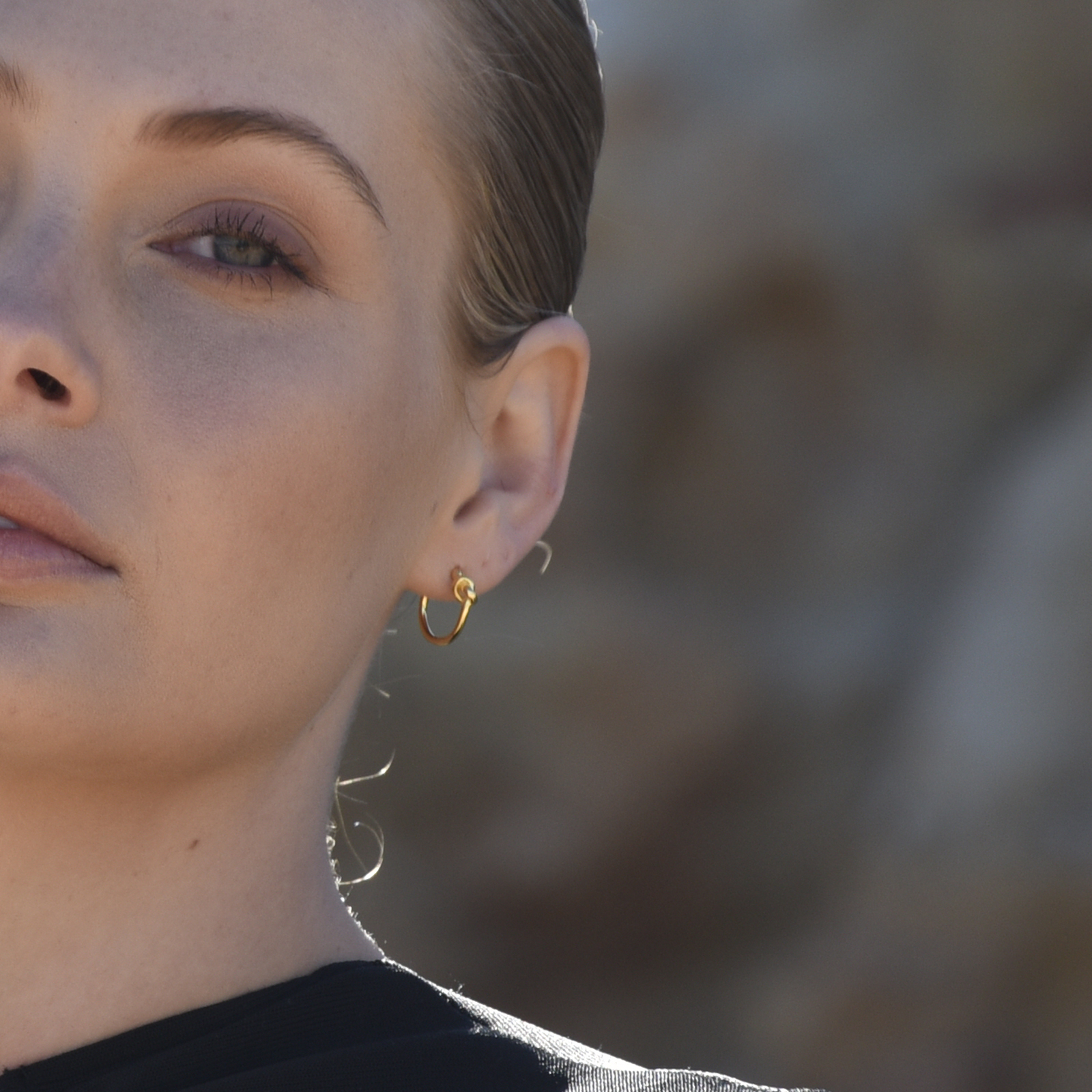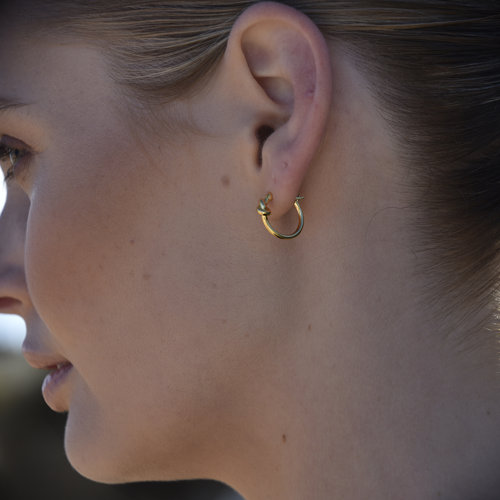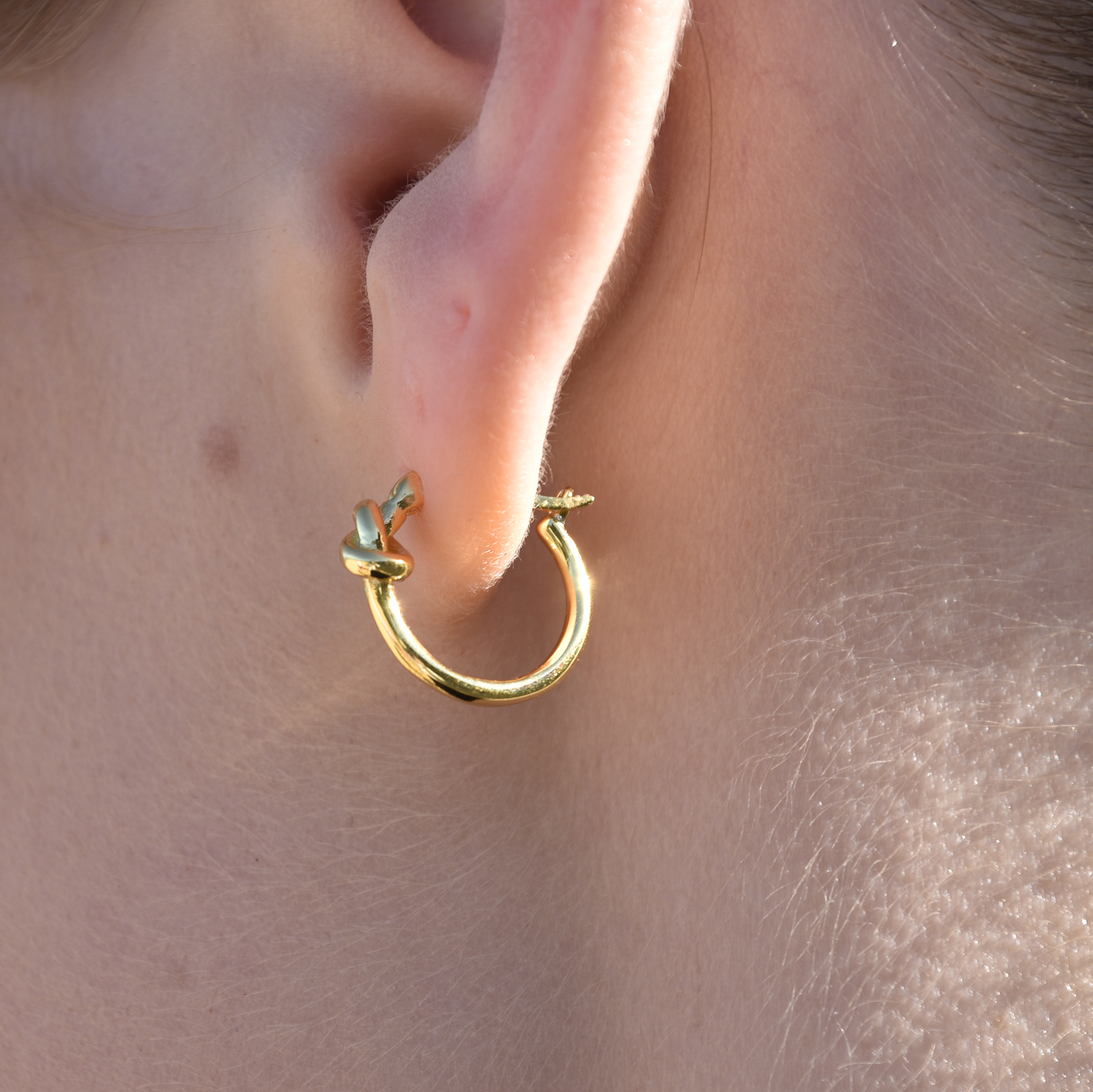 Adding a unique artsy vibe to your everyday styling. Introducing Tie-A-Knot Modern Hoop Earrings (Gold Vermeil) - a minimal and trendy ear love for your versatile styling. This design features traditional hoop earrings with an artsy knot close to the clasp, creating a subtle yet adorable highlight for the piece. The earrings are crafted in solid sterling silver with 2.5 microns of quality 18K gold plating (to Gold Vermeil Jewellery Standards) for an elegant and noble gold shine. An understated yet creative ear love suitable for girls and women of all ages and for all personal styles. Hypoallergenic, nickel, cadmium and lead free. Perfect for layering. Suitable for unisex wear.